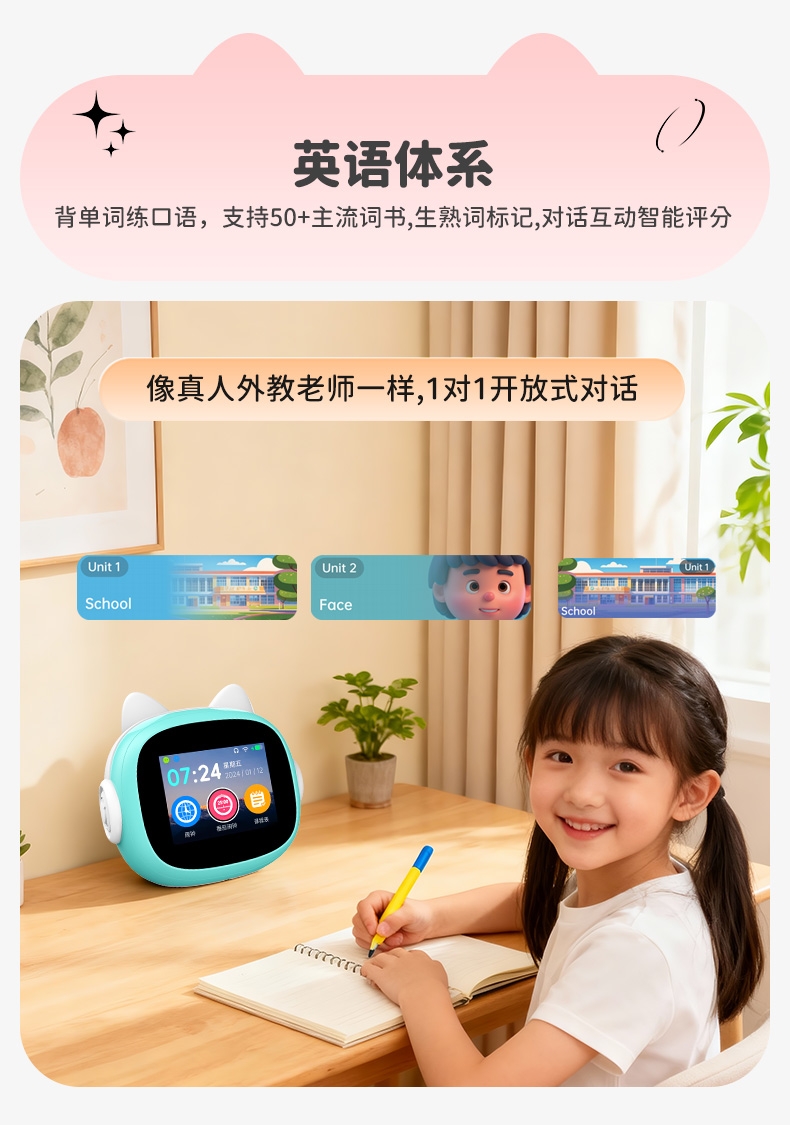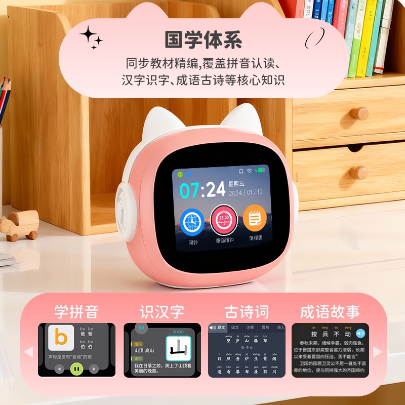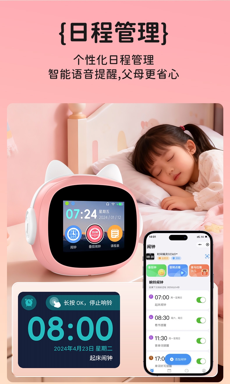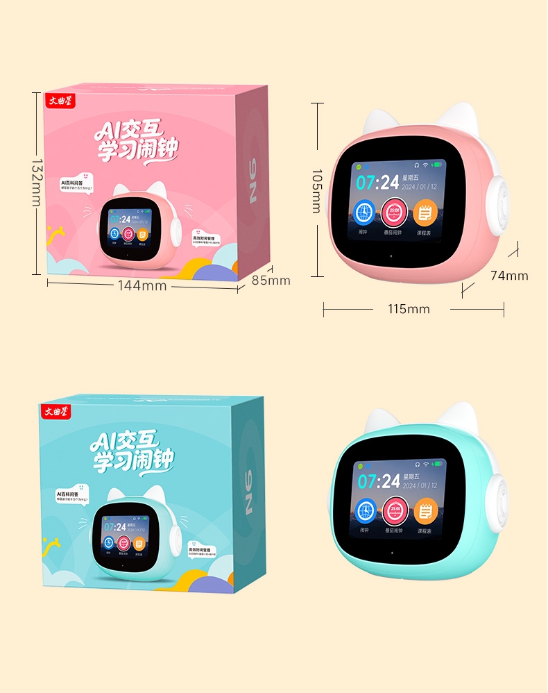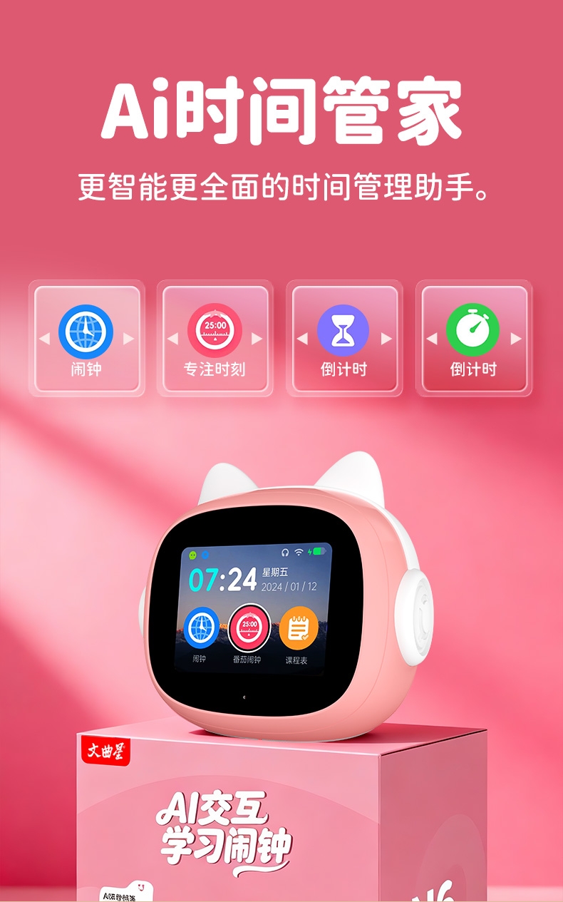 搭载讯飞星火大模型,全语音控制;覆盖1-9年级同步教材听力,陪孩子一起学习成长;50组闹钟提示,智能设置闹钟及时间管理