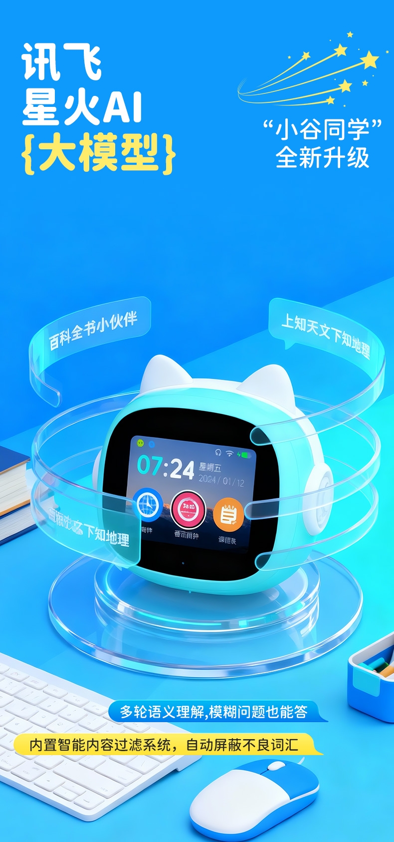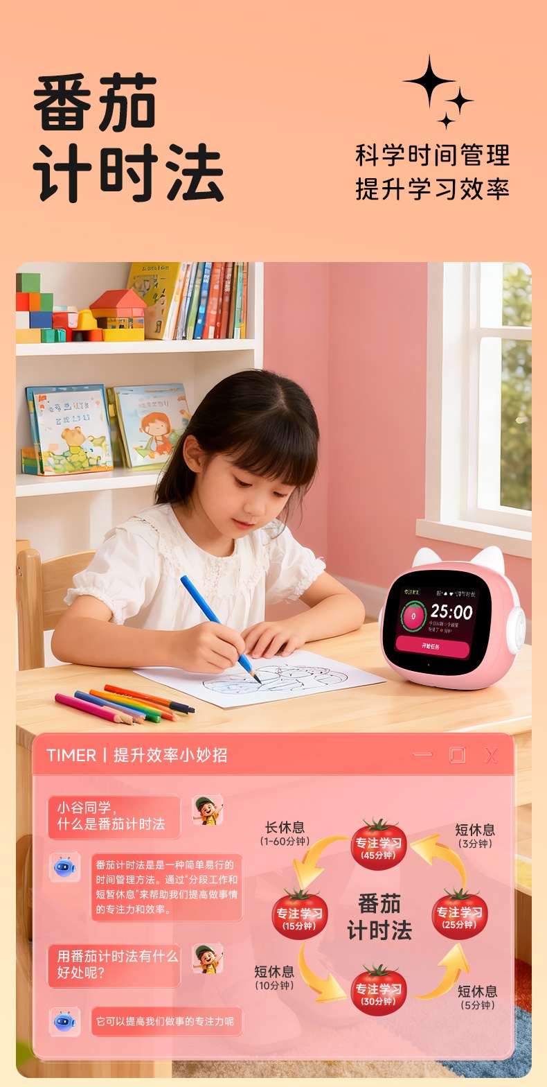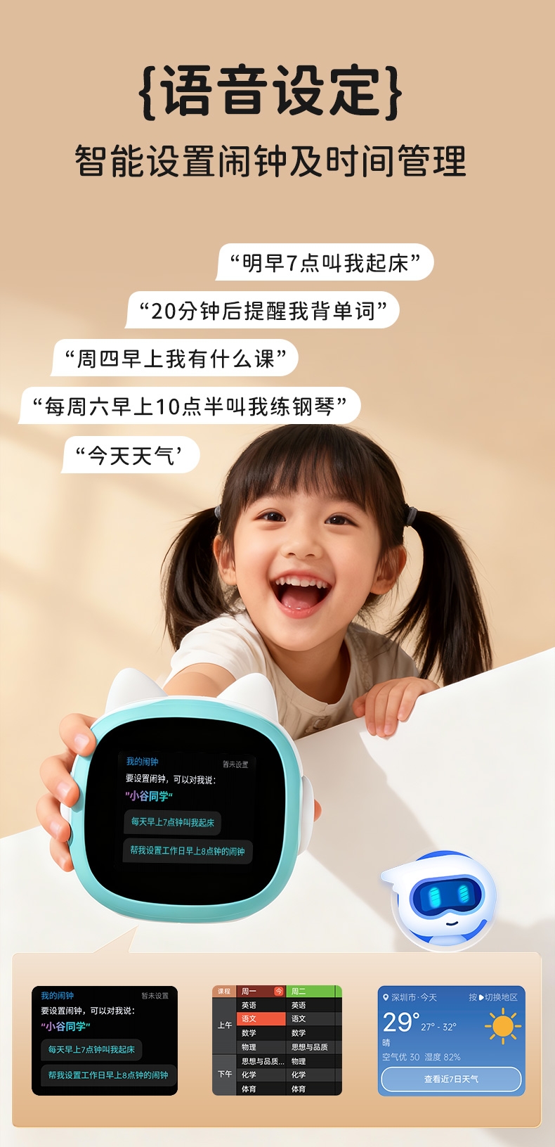 搭载讯飞星火大模型,全语音控制;覆盖1-9年级同步教材听力,陪孩子一起学习成长;50组闹钟提示,智能设置闹钟及时间管理