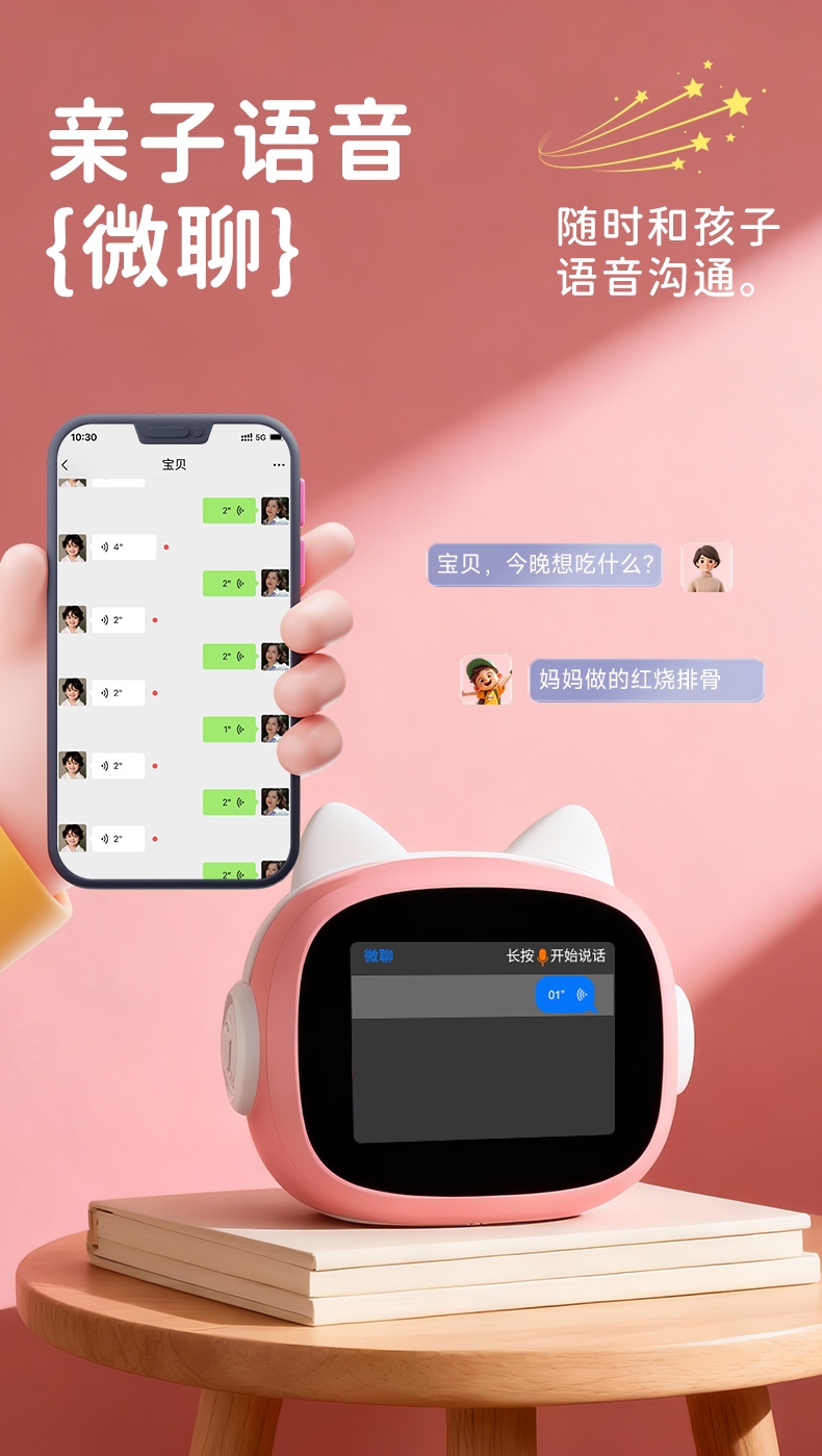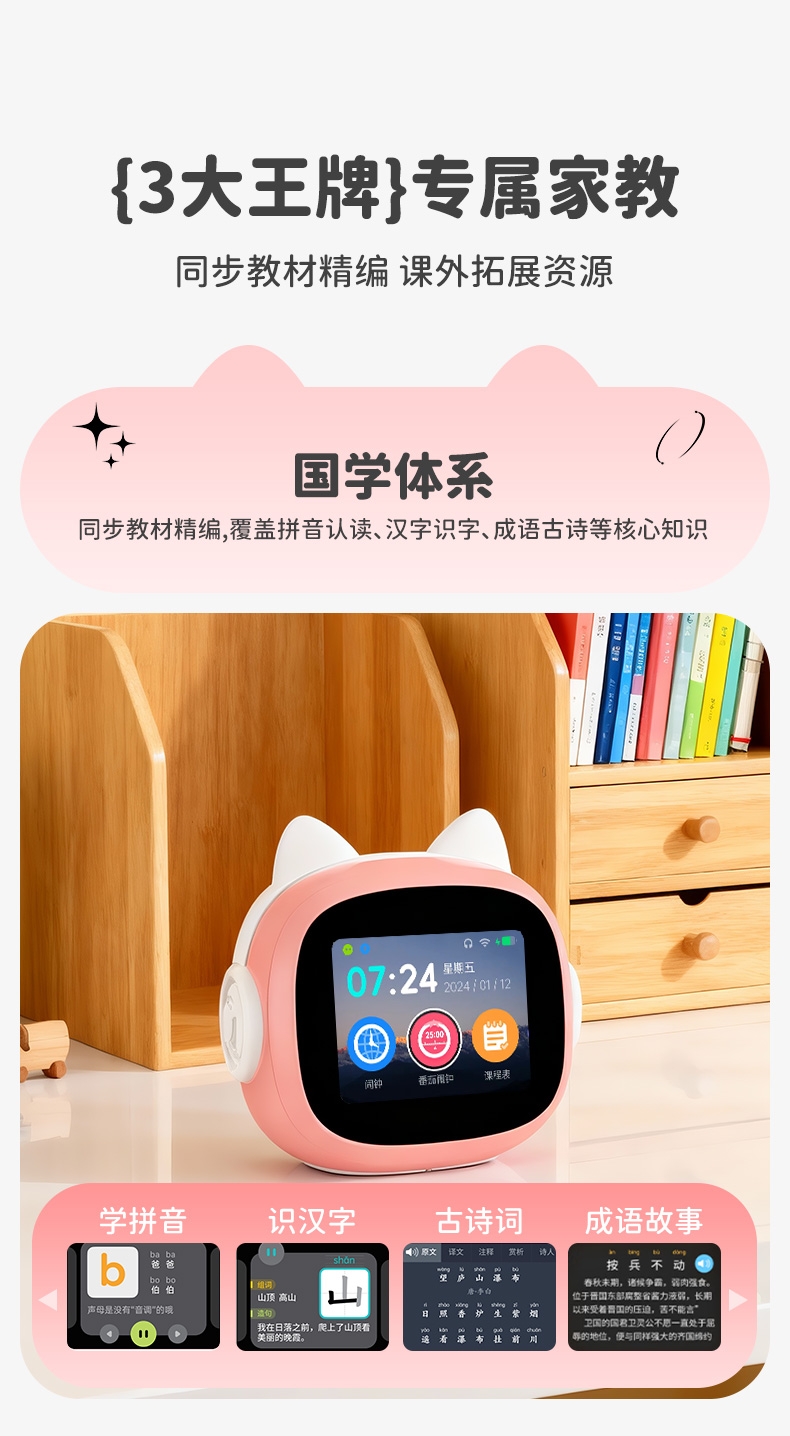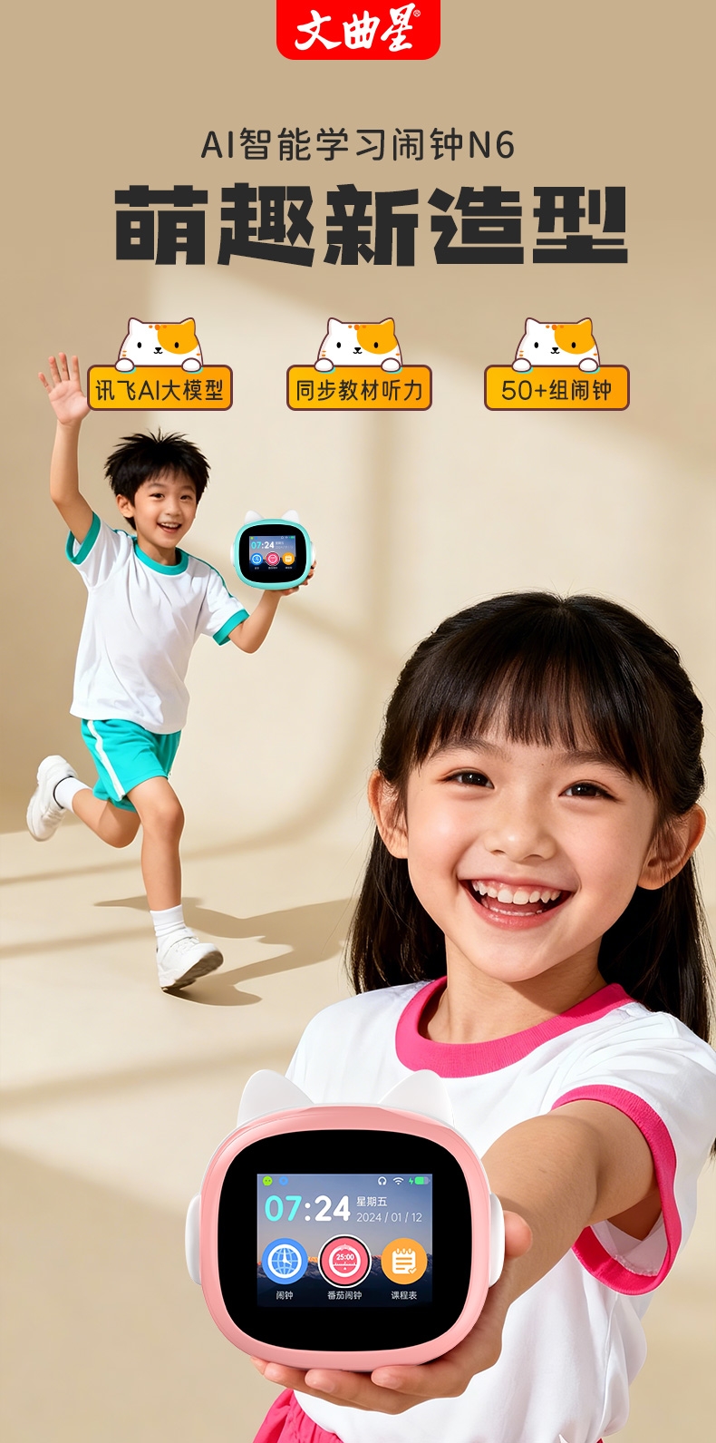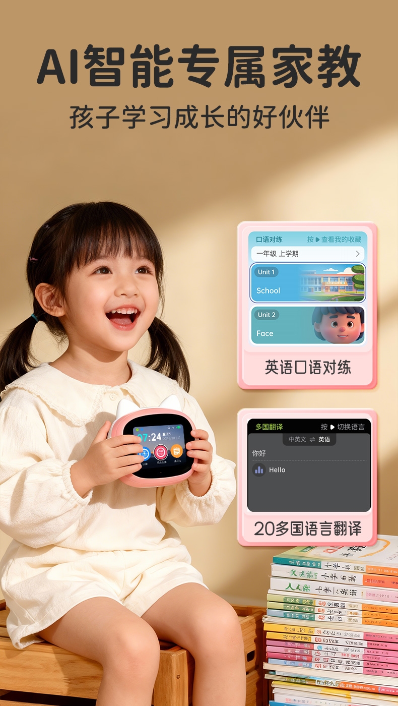 搭载讯飞星火大模型,全语音控制;覆盖1-9年级同步教材听力,陪孩子一起学习成长;50组闹钟提示,智能设置闹钟及时间管理