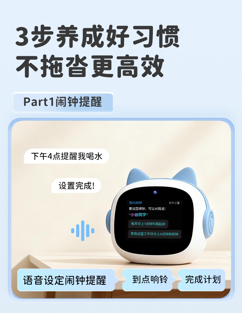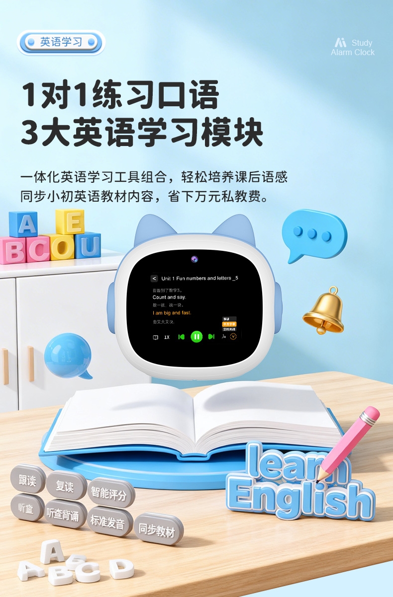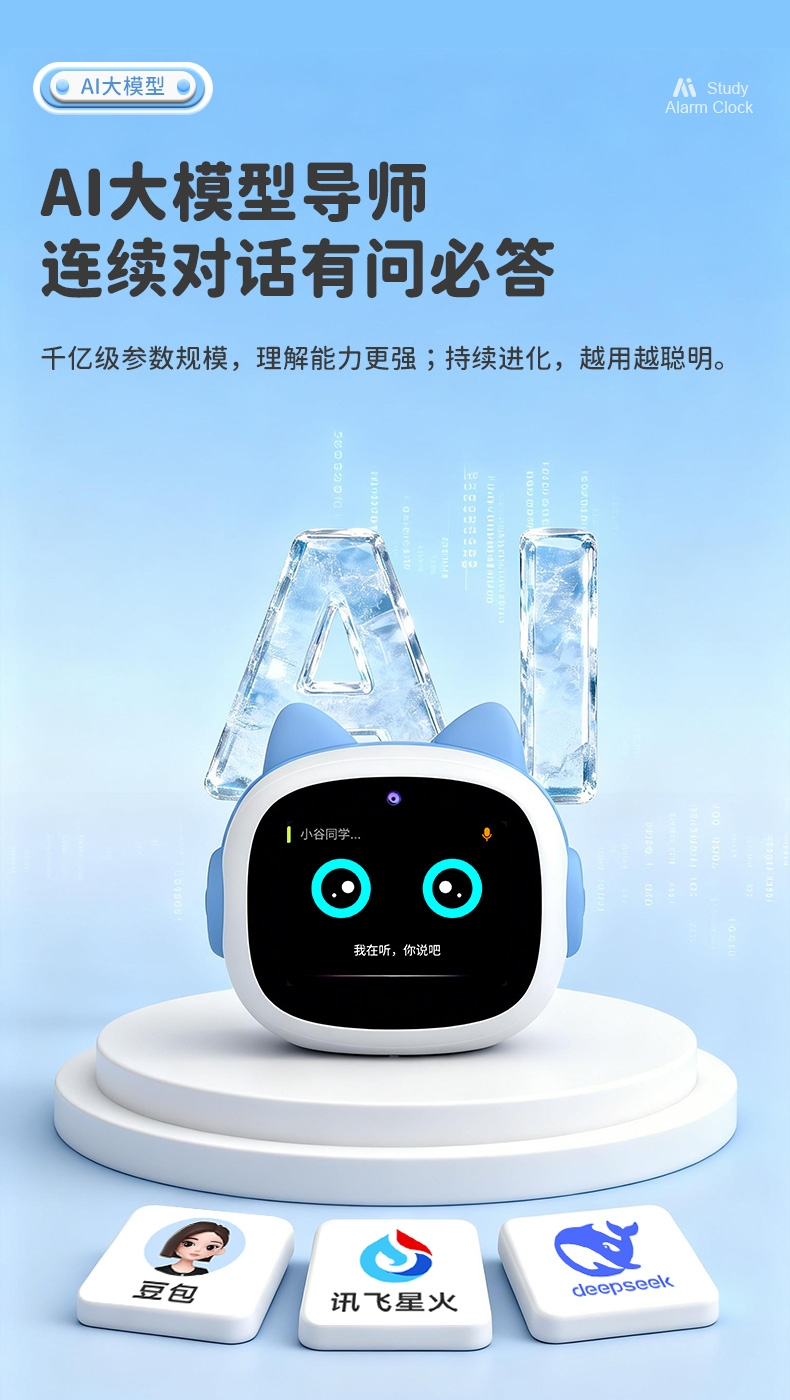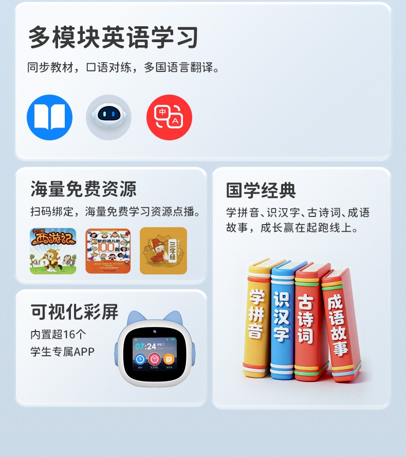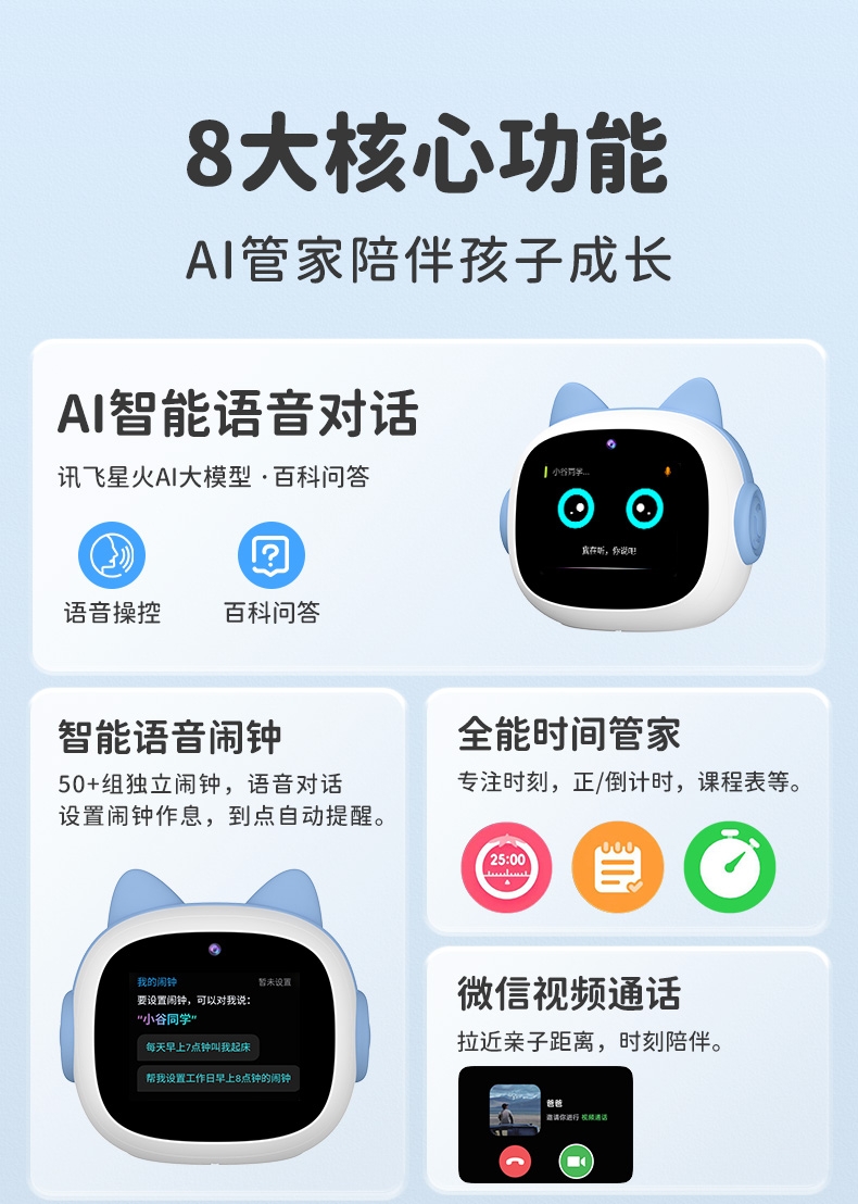 搭载讯飞星火大模型,全语音控制;微信视频通话/语聊,深度强化情感连接;覆盖1-9年级同步教材听力,陪孩子一起学习成长