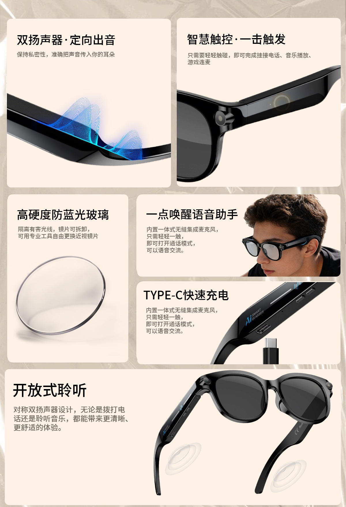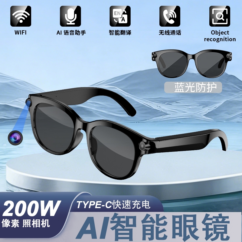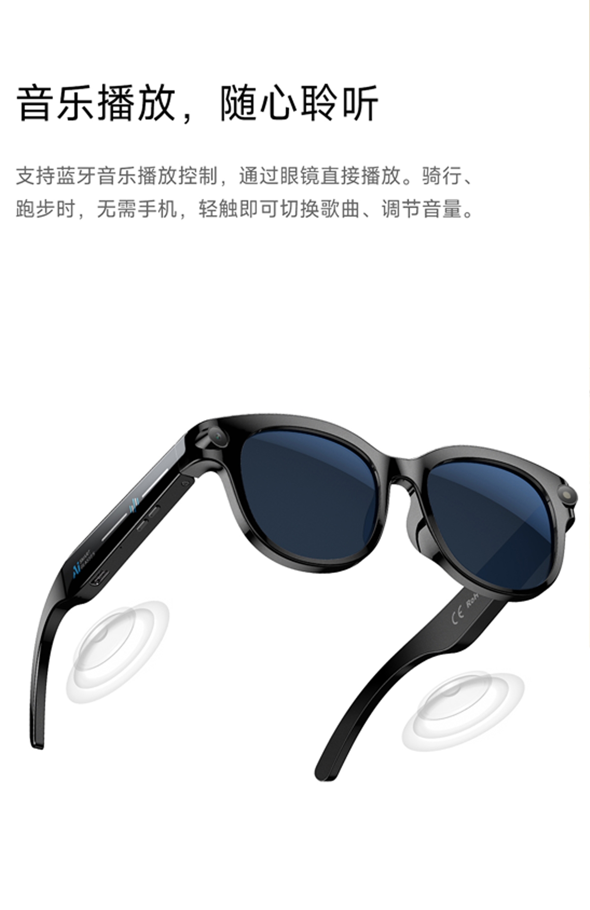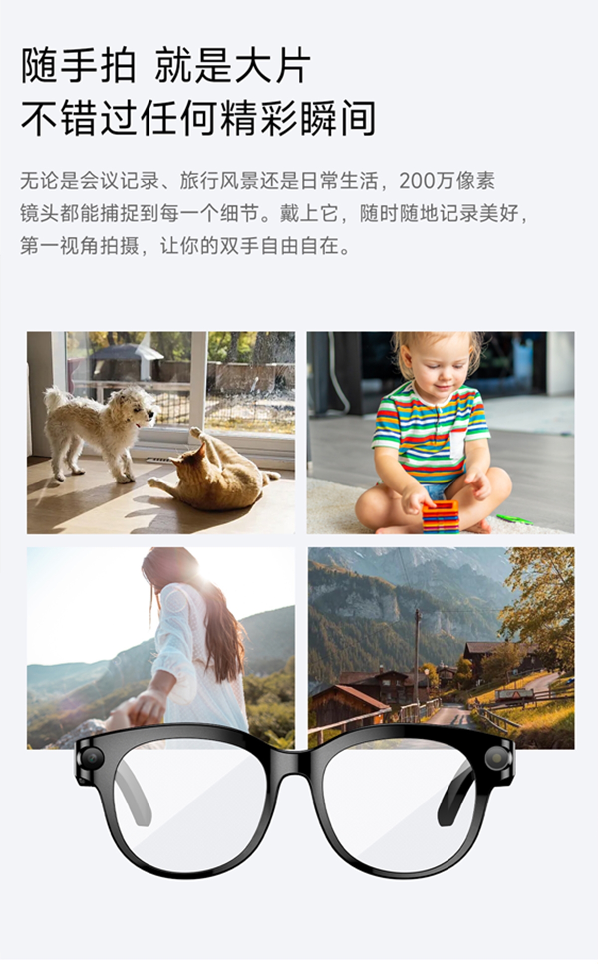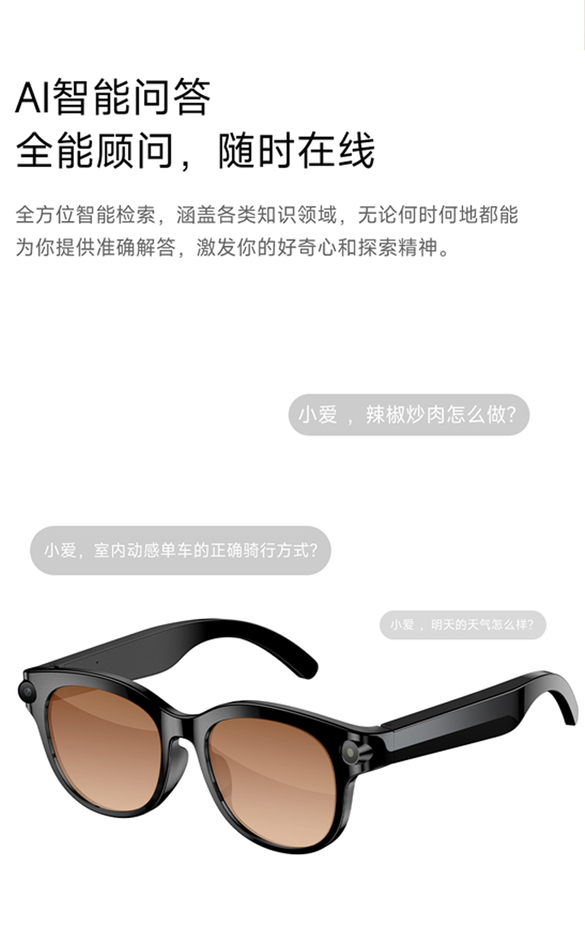 AI语音助手/拍照/录视频/录音/音乐控制/蓝牙通;提示音/指示灯/翻译/智视识物/触摸;可连接电脑图片视频传输/音乐播放/离线语音等