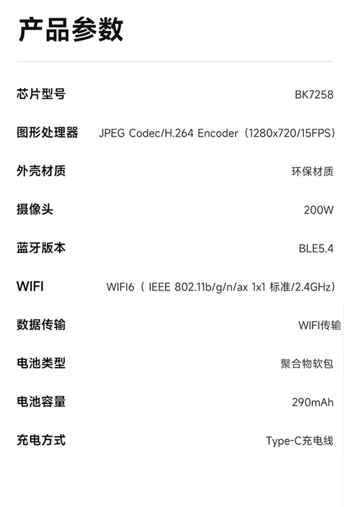 连接参数:BLE5.4+WIFI6( IEEE 802.11b/g/n/ax 1x1 标准/2.4GHz)