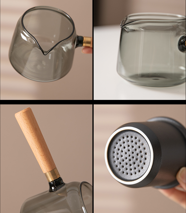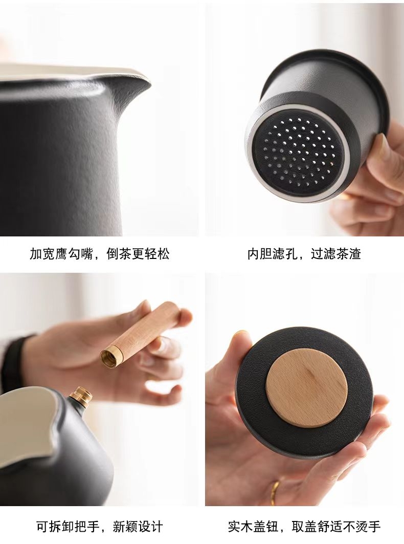 高端瓷木结合茶具,实木侧把不烫手,灵活可拆卸,;黄铜螺纹旋转固定,收用自如,茶壶阔口设计,投茶不怕;高端皮包,粗陶磨砂釉面与细腻羊脂玉瓷两种质感可选。