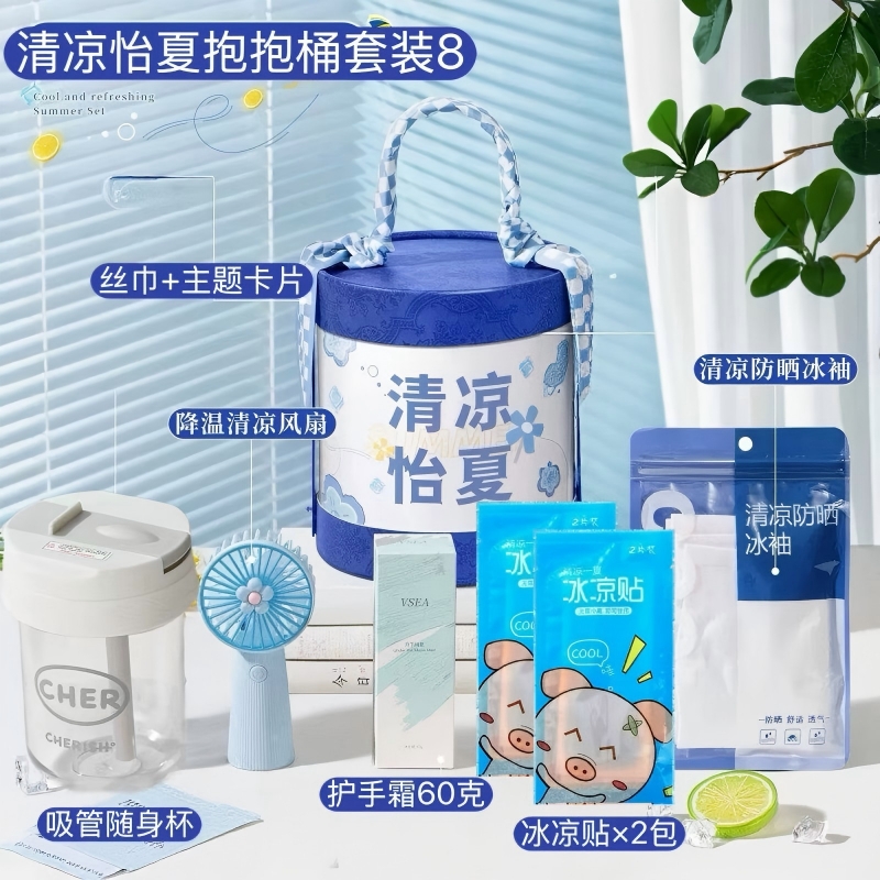配置清单:产品清单1.丝巾+主题卡片2.吸管随身杯3.降温清凉风扇4.护手霜60克5.冰凉贴x2包6.清凉防晒冰袖