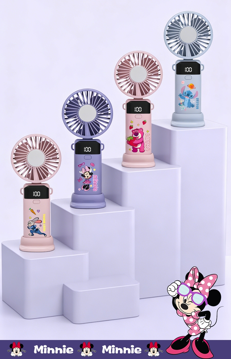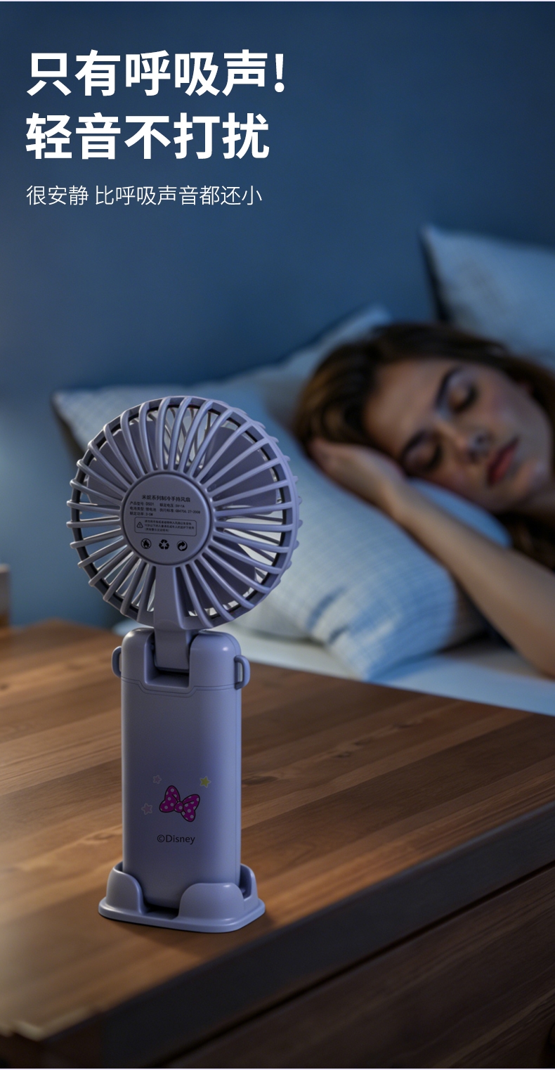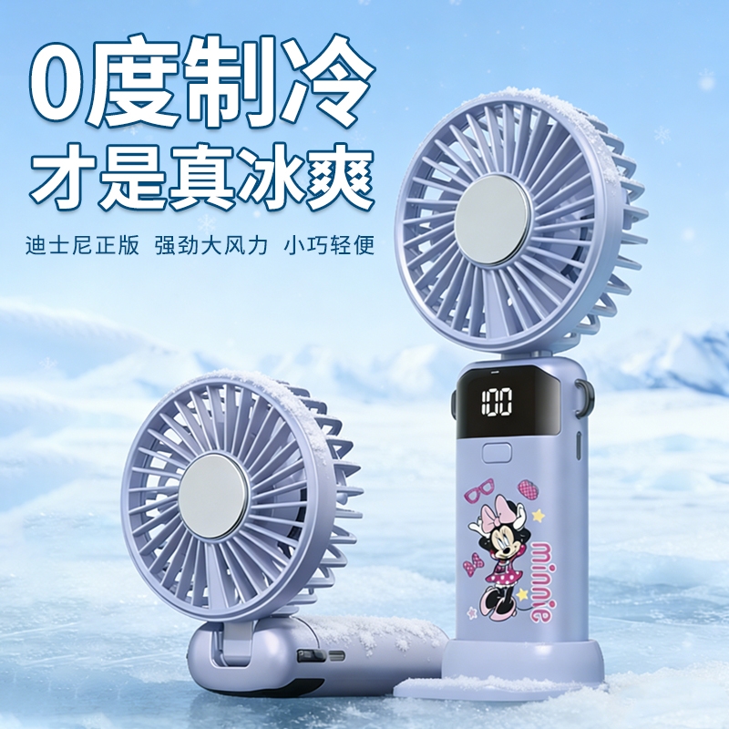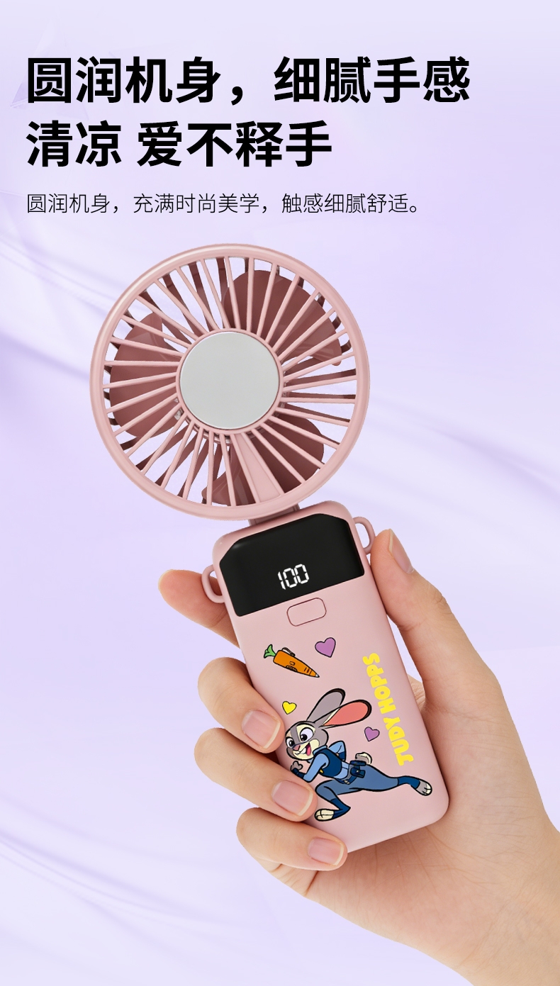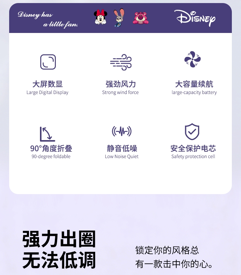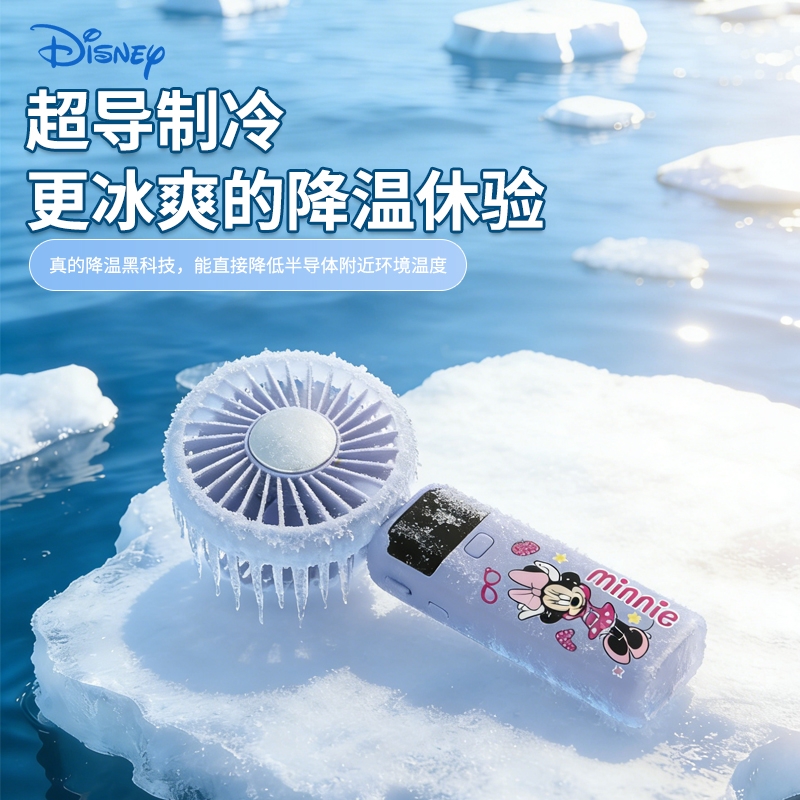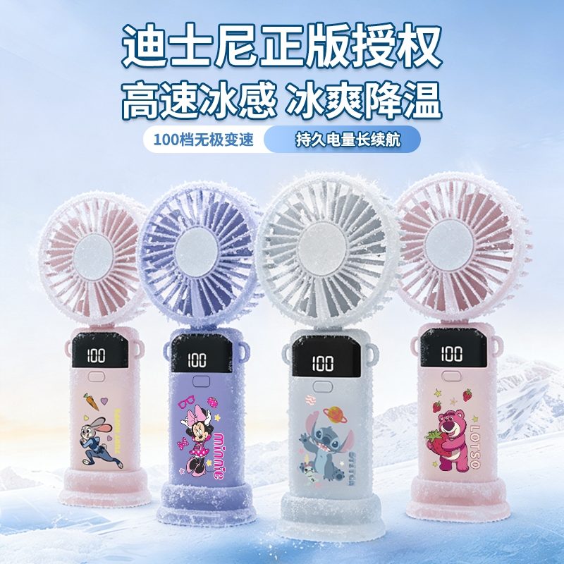 迪士尼正版授权,100挡无极变速,夏日冰感高速降温;长续航数显电量,多场景便捷使用,IP联名高颜值在线;低噪静音可折叠,手持挂脖桌面适用,出行降温好帮手。