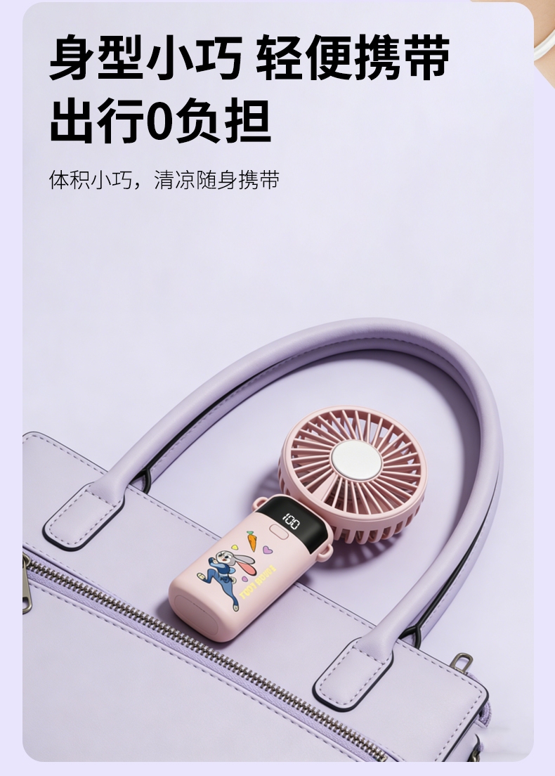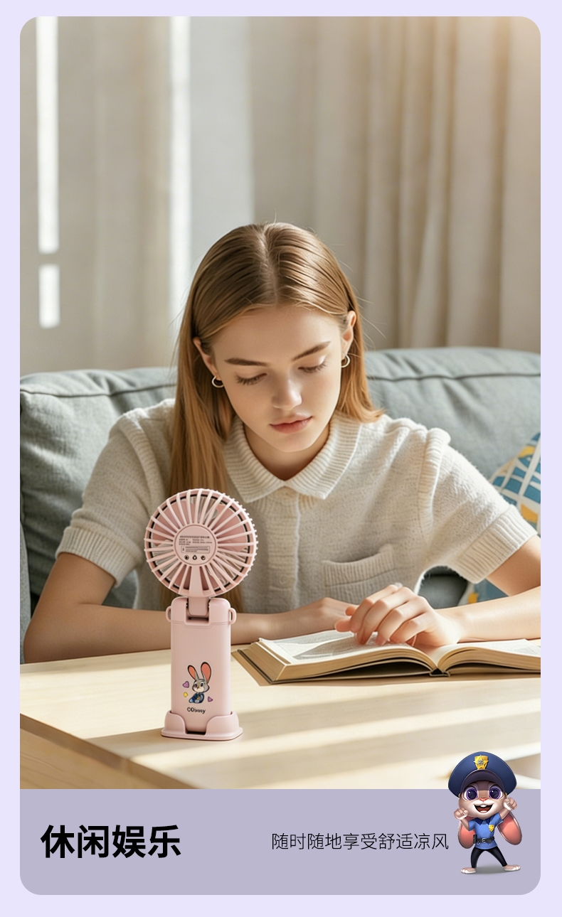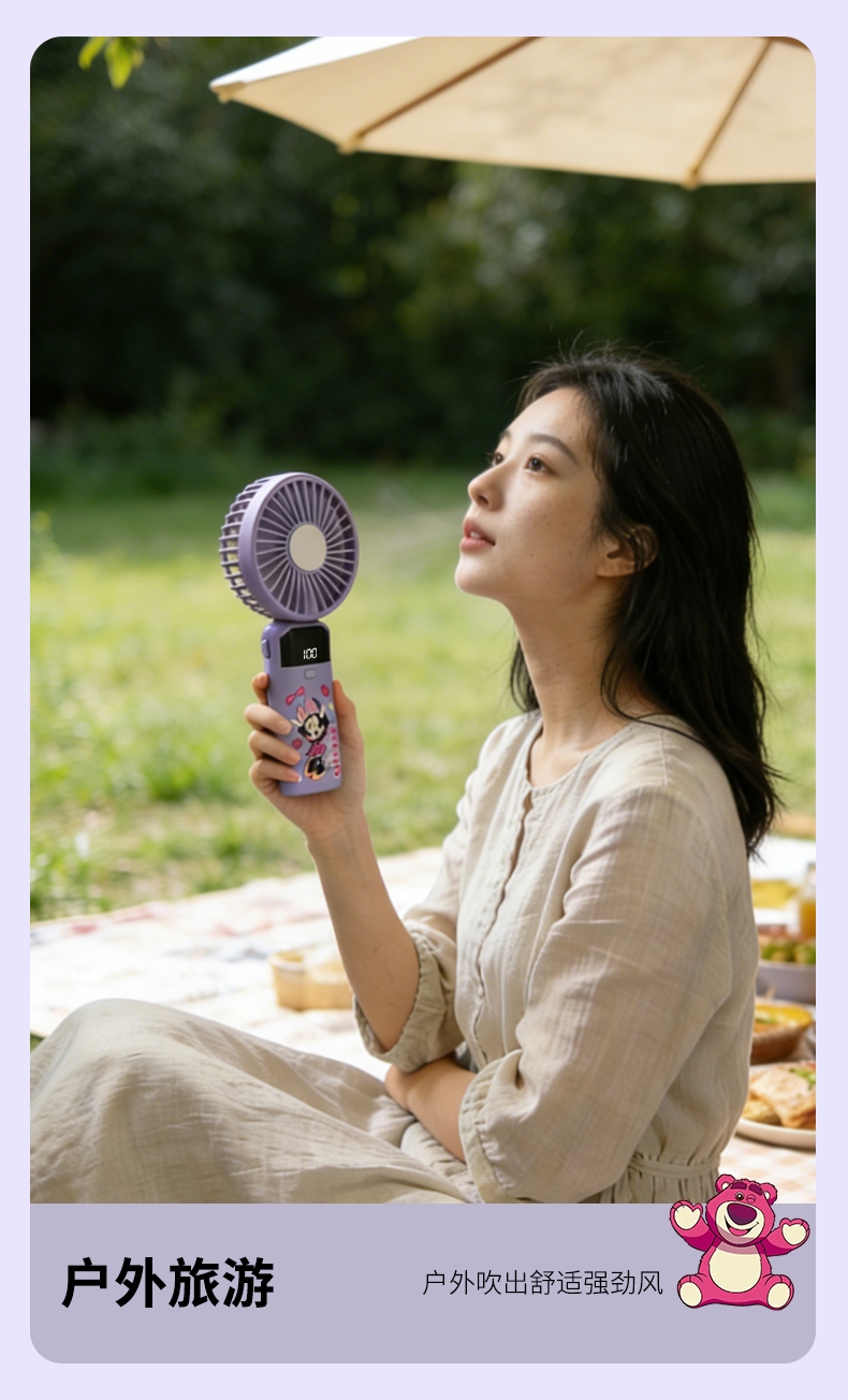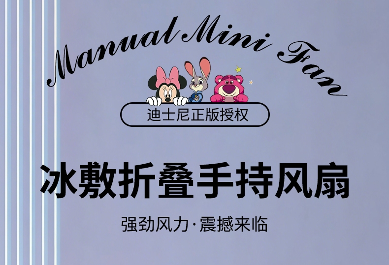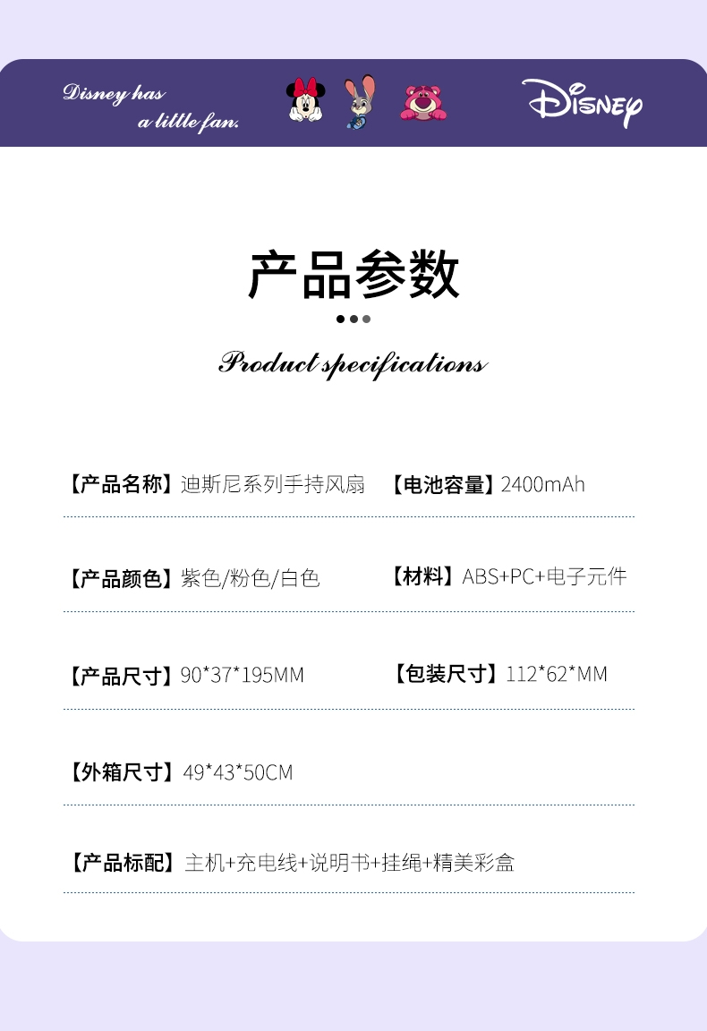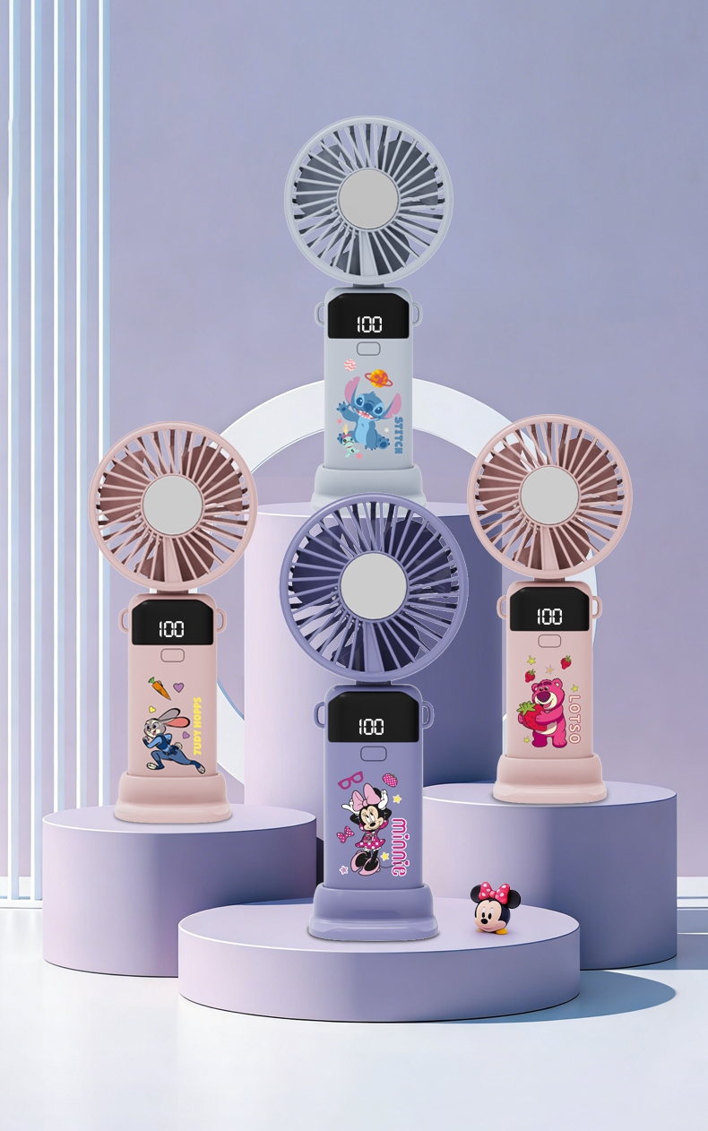 迪士尼正版授权,100挡无极变速,夏日冰感高速降温;长续航数显电量,多场景便捷使用,IP联名高颜值在线;低噪静音可折叠,手持挂脖桌面适用,出行降温好帮手。