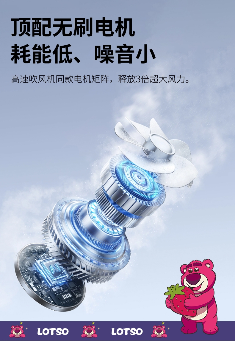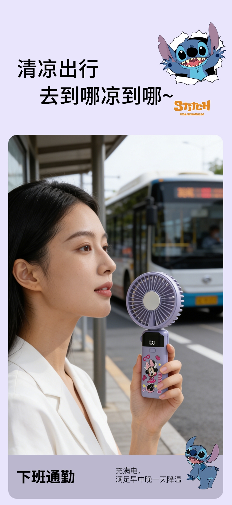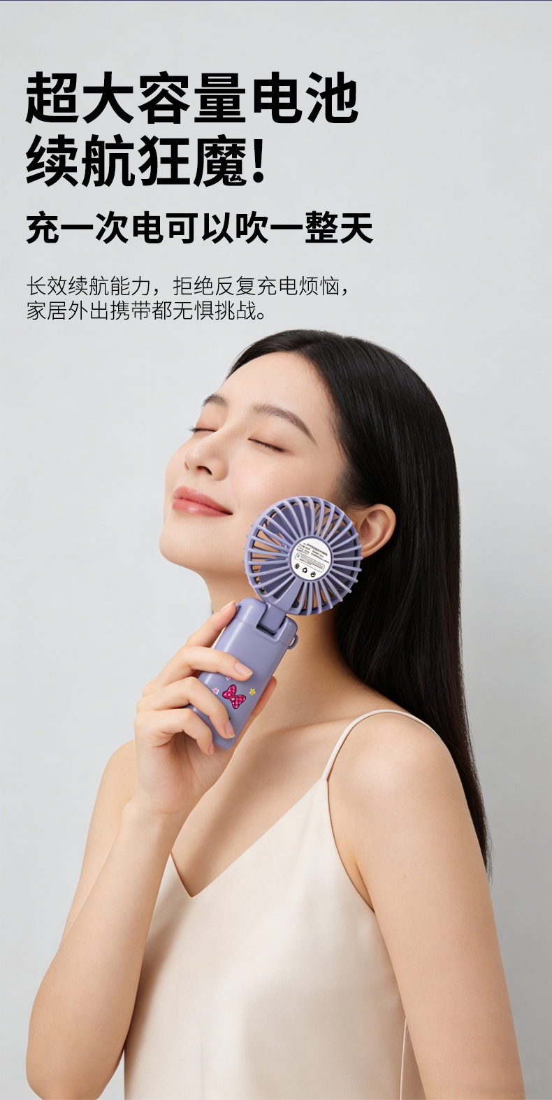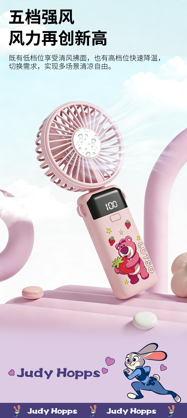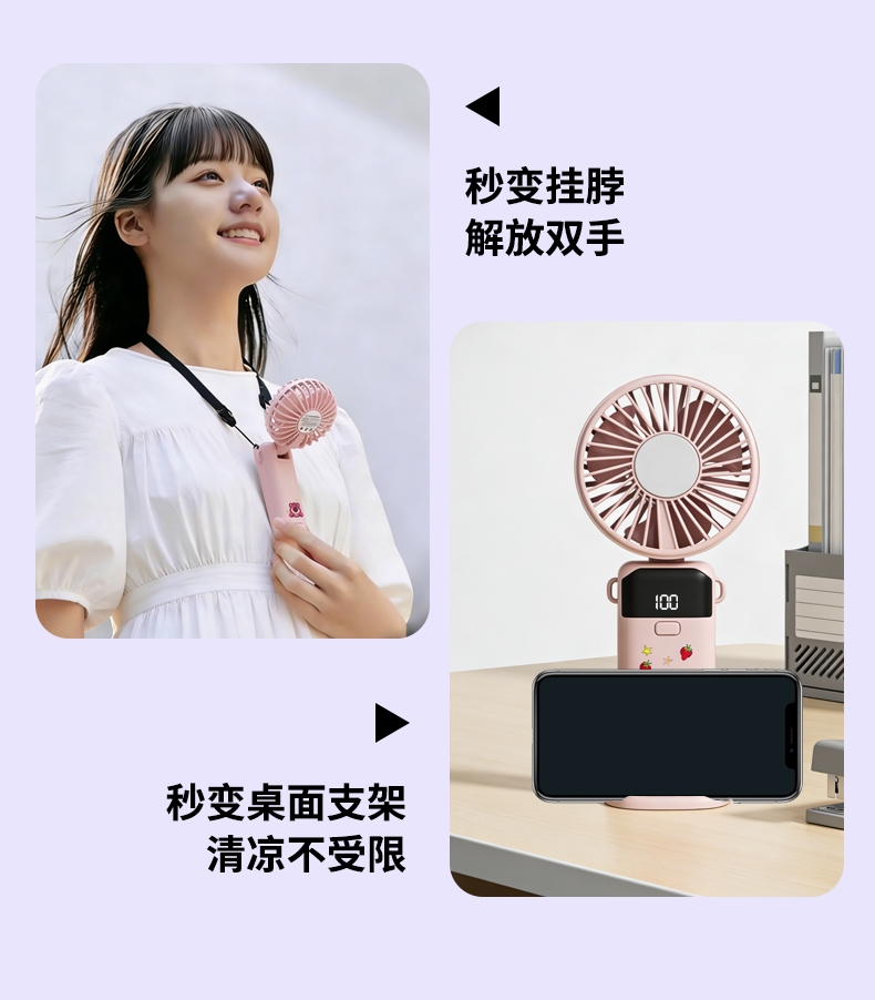 迪士尼正版授权,100挡无极变速,夏日冰感高速降温;长续航数显电量,多场景便捷使用,IP联名高颜值在线;低噪静音可折叠,手持挂脖桌面适用,出行降温好帮手。