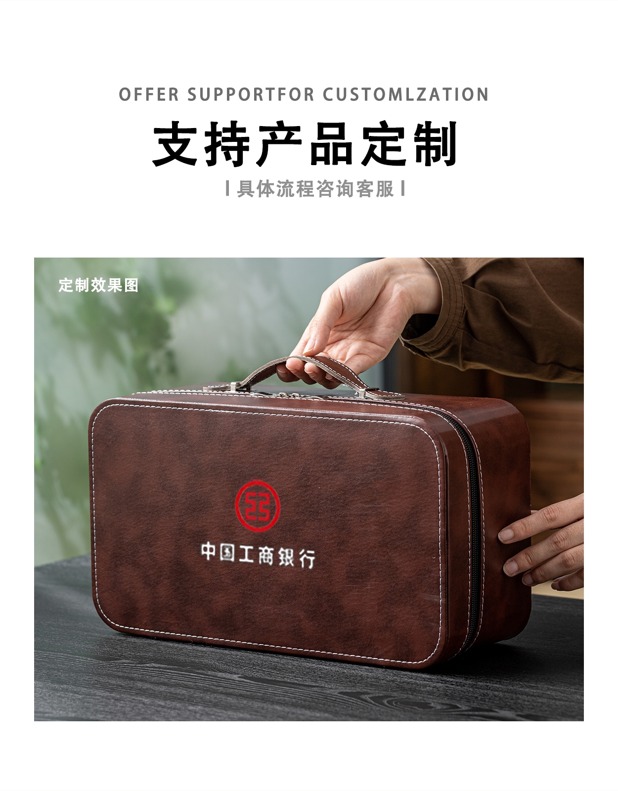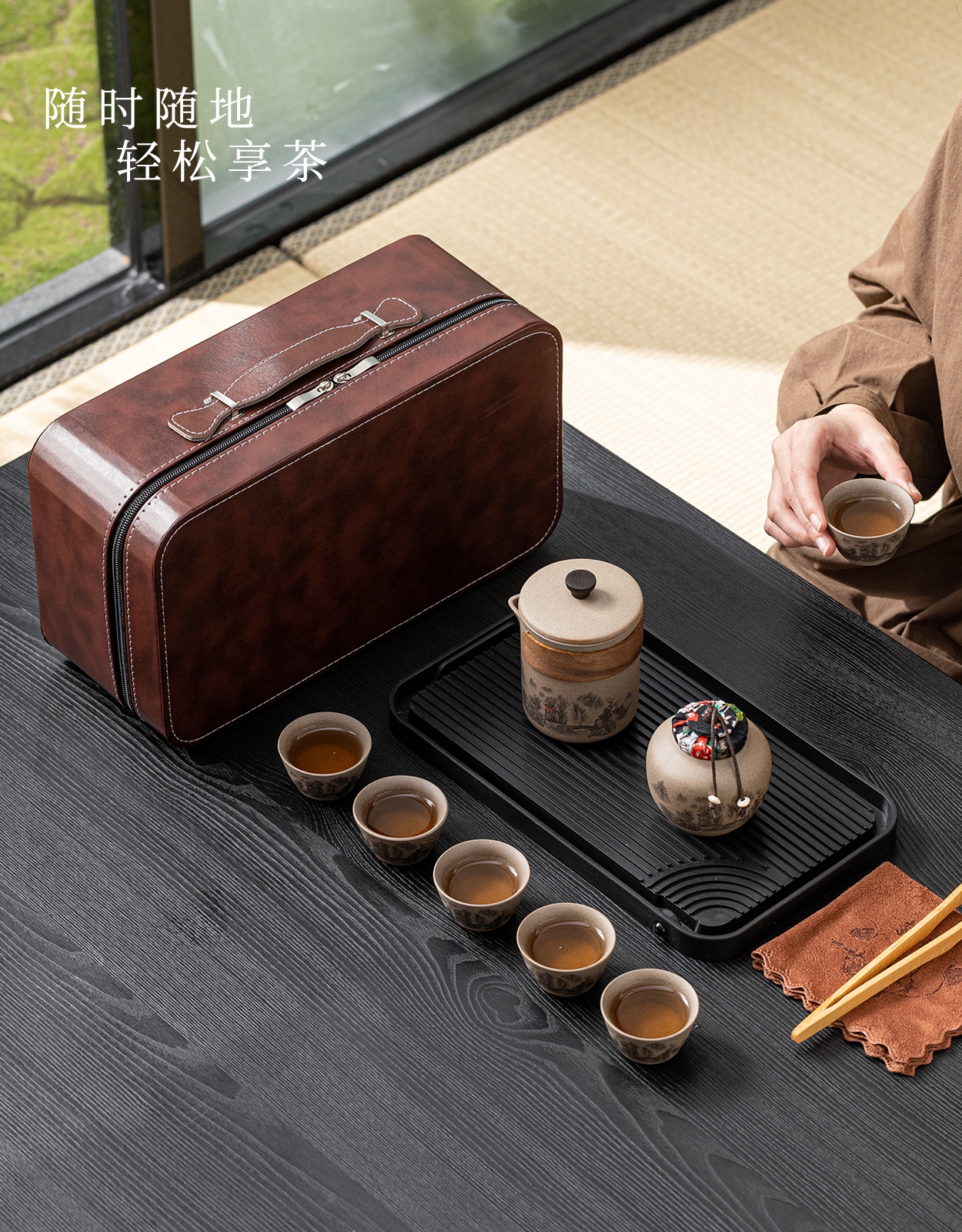 茶具表面绘有山水图案,具有浓郁的中国风;配套的棕色皮质手提箱设计精致,方便携带和存放茶具;山水图案在中国文化中象征着宁静、悠远和自然