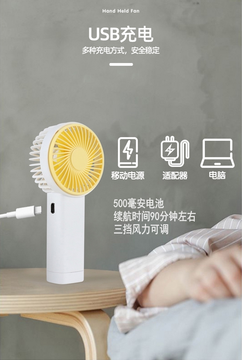 清凉小风扇:500毫安锂电池 USB接口 (续航时间90分钟左右 三挡风力可调)