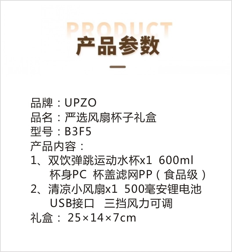 配置清单:双饮弹跳运动水杯*1 、清凉小风扇*1 、礼盒*1