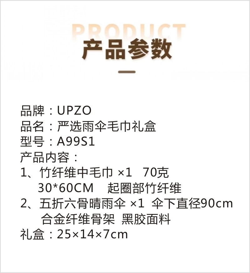 配置清单:竹纤维中毛巾*1 、五折六骨晴雨伞(胶囊伞)×1、礼盒*1
