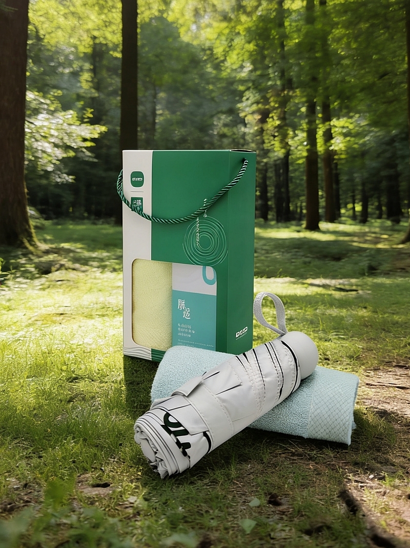 五折六骨晴雨伞 胶囊伞尺寸设计 黑胶隔热;迪穆系列竹纤维毛巾起圈部竹纤维 吸湿透气抗菌抑菌;夏季清凉组合套装