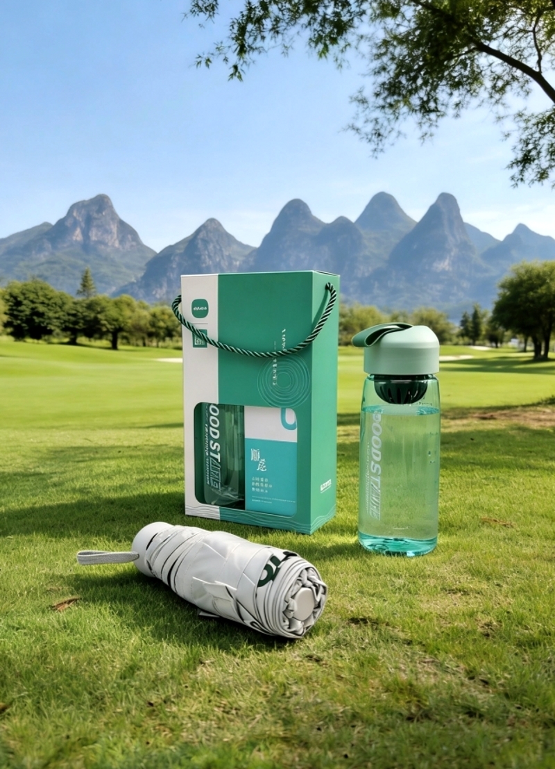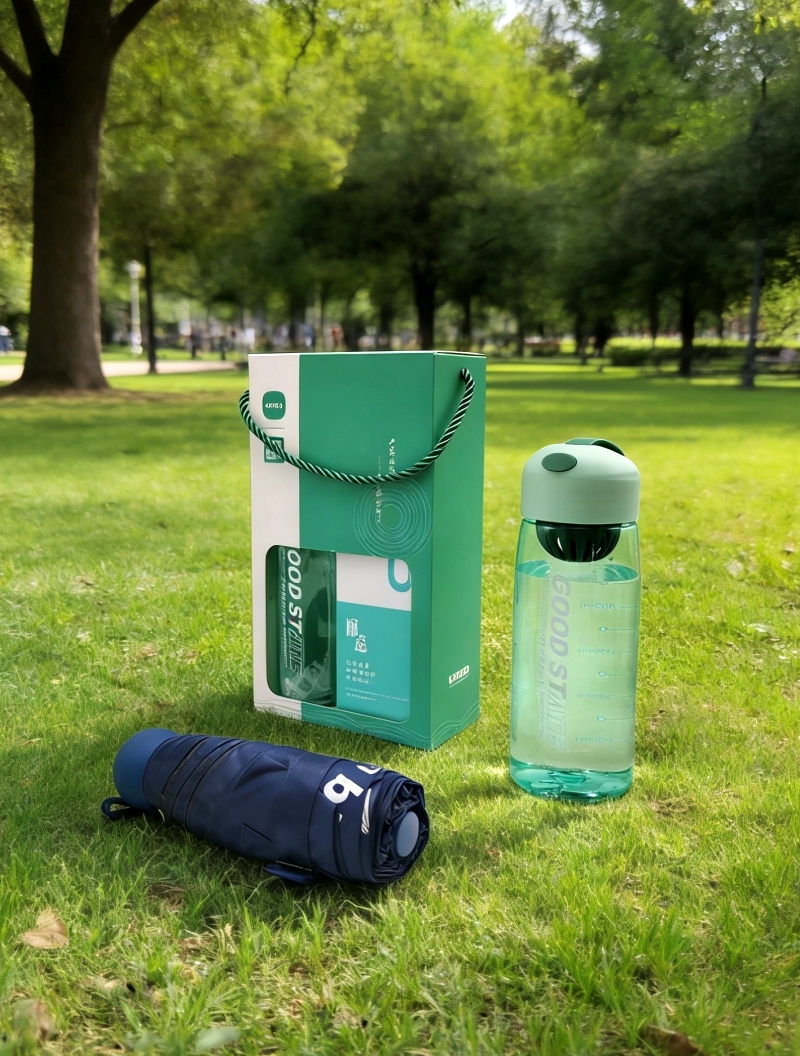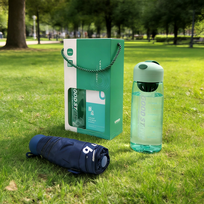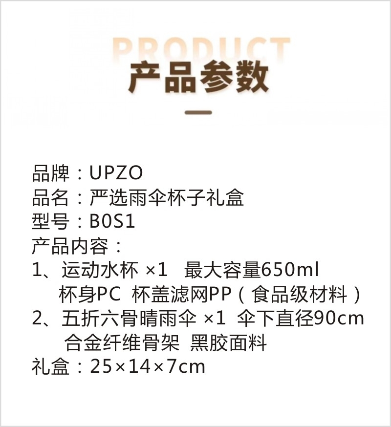 配置清单:运动水杯*1、五折六骨晴雨伞(胶囊伞)×1、礼盒*1