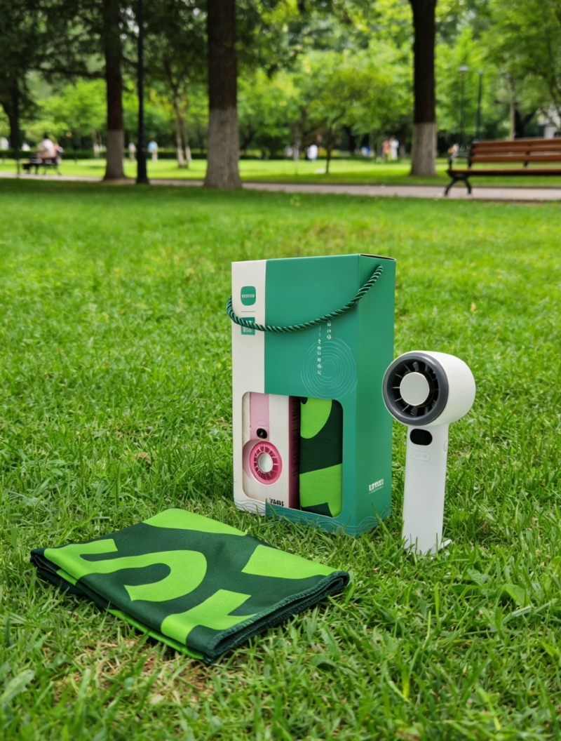 七彩运动冰巾精选冷感面料结合数码印花工艺 ;数显风扇 1200毫安 199档可调 长续航 ;夏季清凉组合套装
