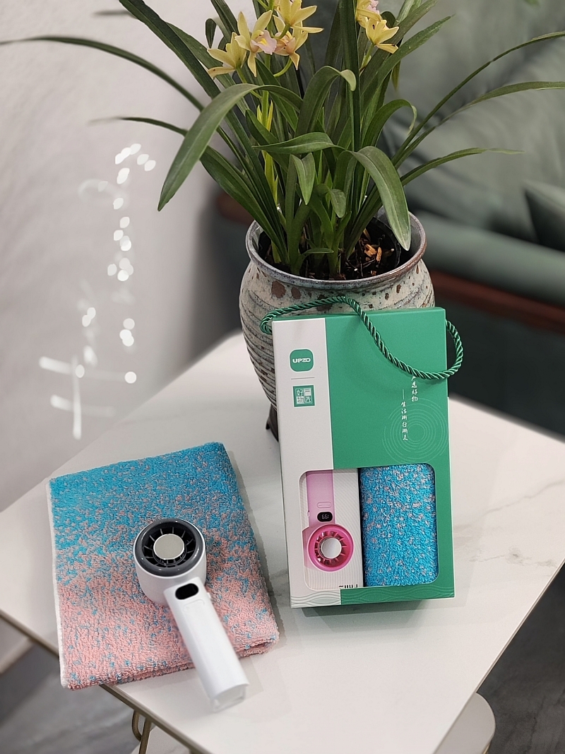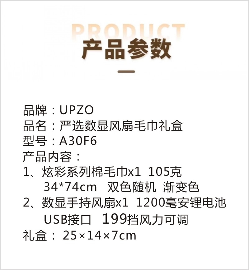 配置清单:炫彩系列棉毛巾×1、数显手持风扇*1、礼盒*1