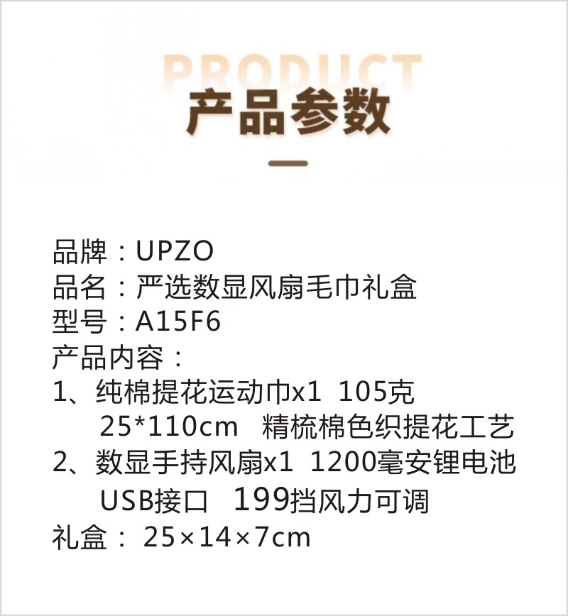 配置清单:纯棉提花运动巾×1、数显手持风扇*1、礼盒*1