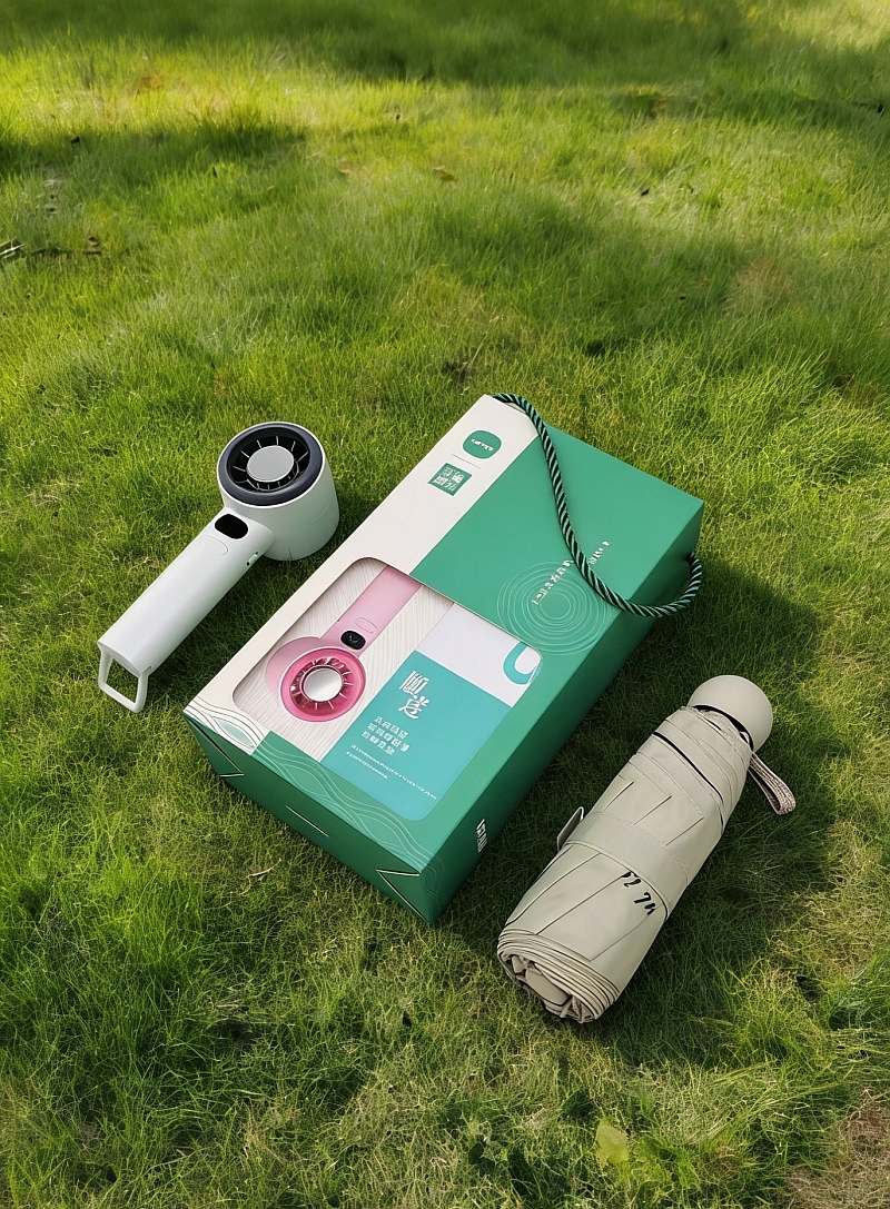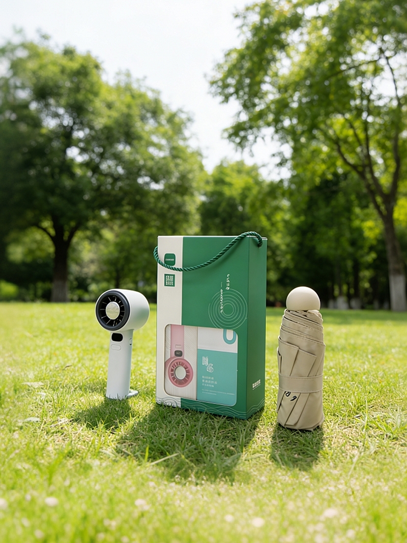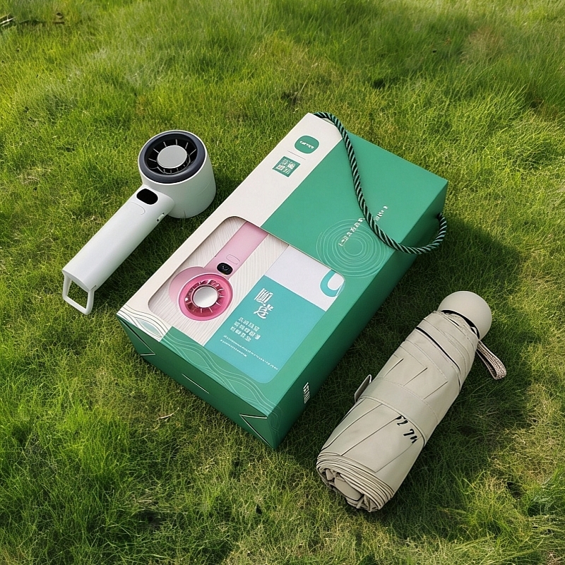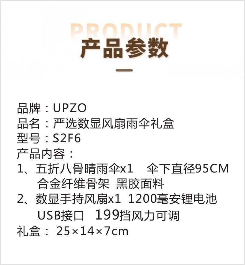 配置清单:五折八骨晴雨伞(大伞)×1、数显手持风扇*1、礼盒*1