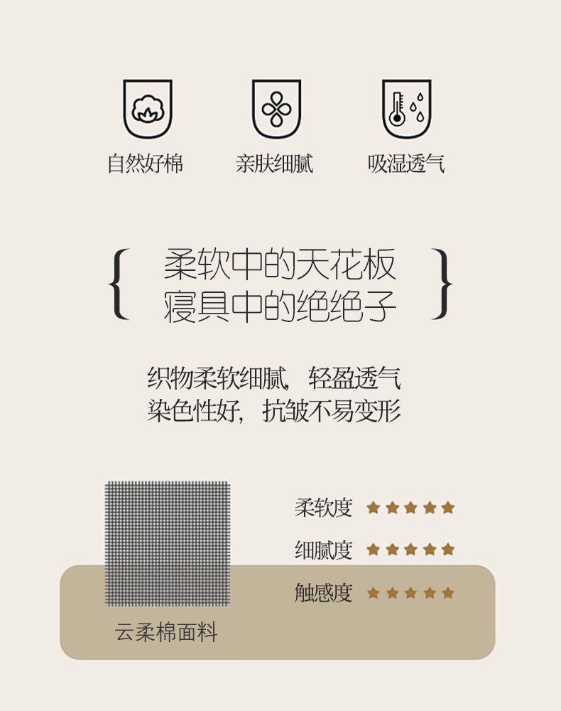 云柔棉面料结构紧密;光泽柔和、肥亮;散湿和透气的性能,对皮肤具有一定的保护作用。