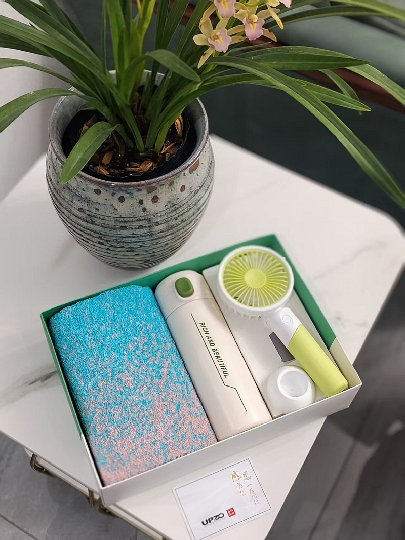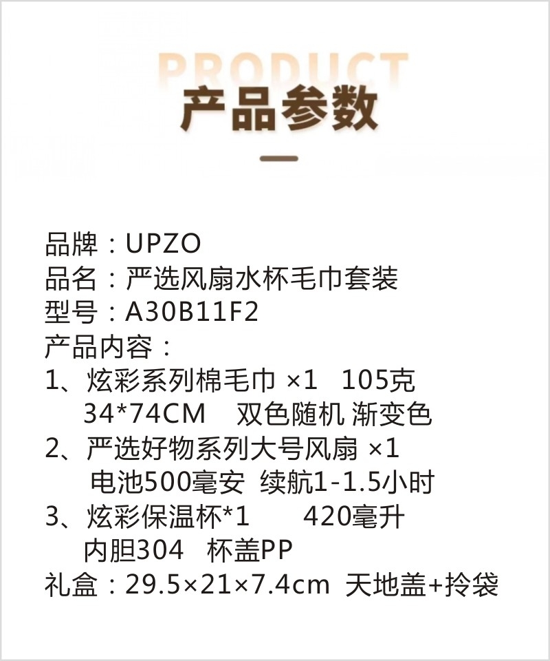 手持大号风扇 500毫安 续航90分钟左右 风力三;炫彩保温杯 420毫升容量 304内胆 靓丽外观设;炫彩系列毛巾精选精梳棉材质结合色织工艺
