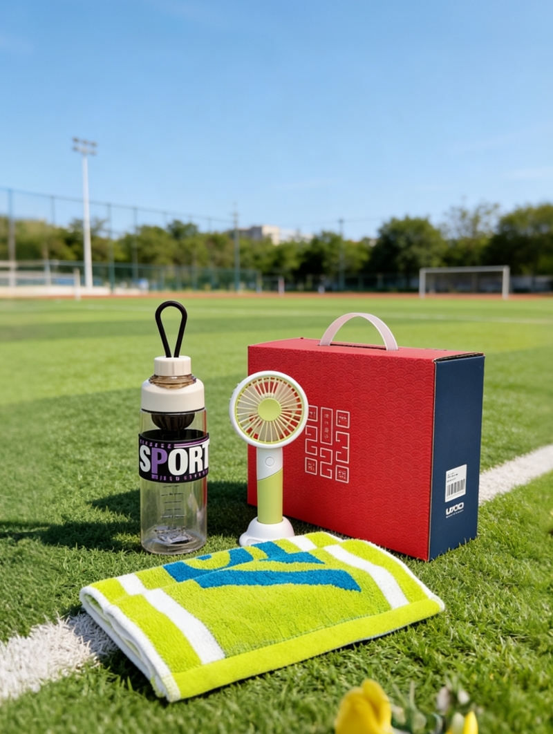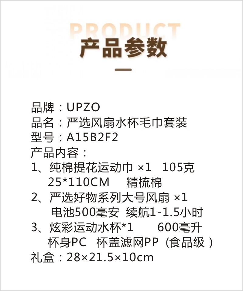 大号风扇 500毫安 续航90分钟左右风力三档可调;纯棉提花运动巾精选精梳棉材质结合色织工艺;炫彩运动水杯双饮模式 带手提与隔热设计