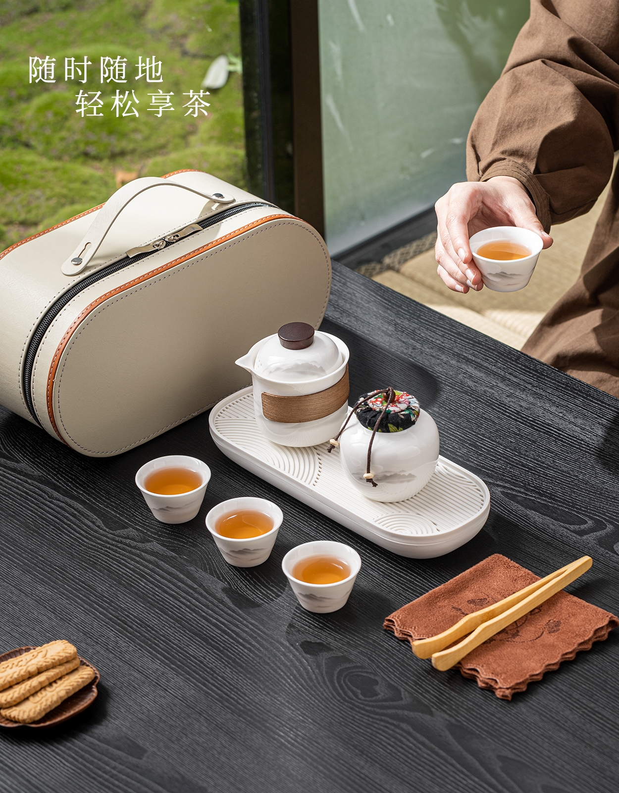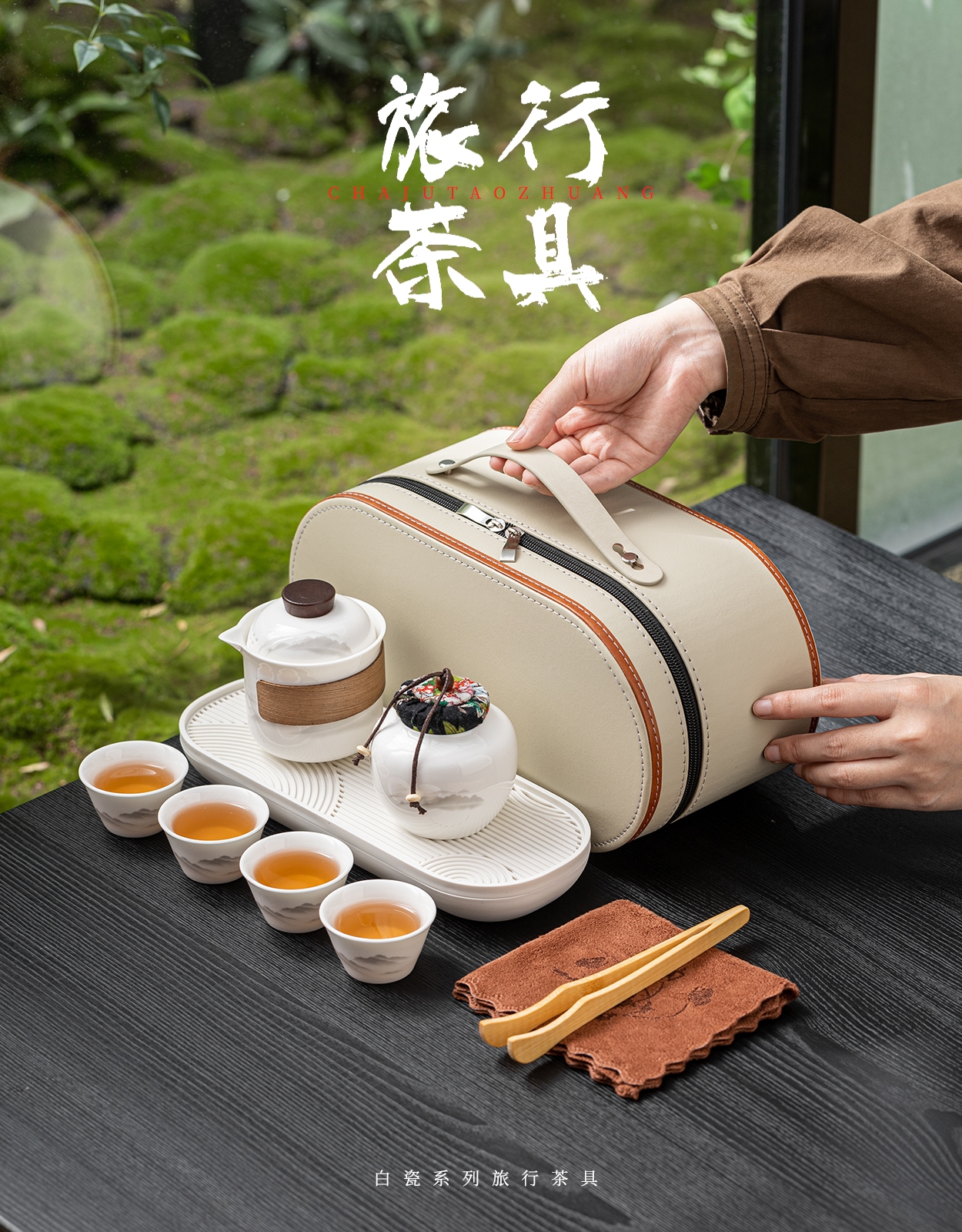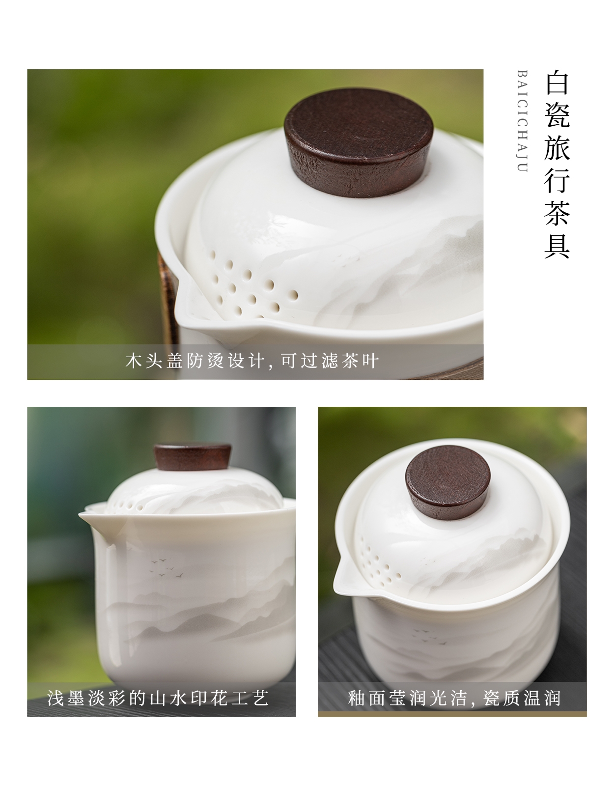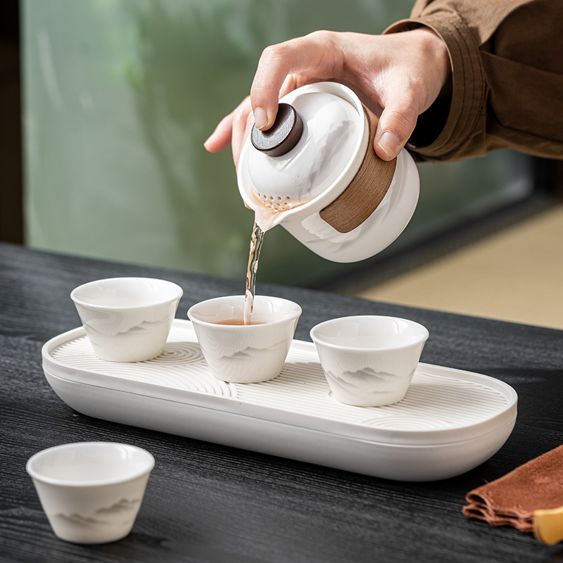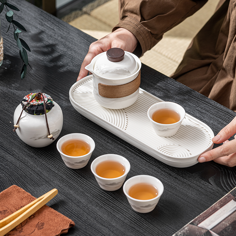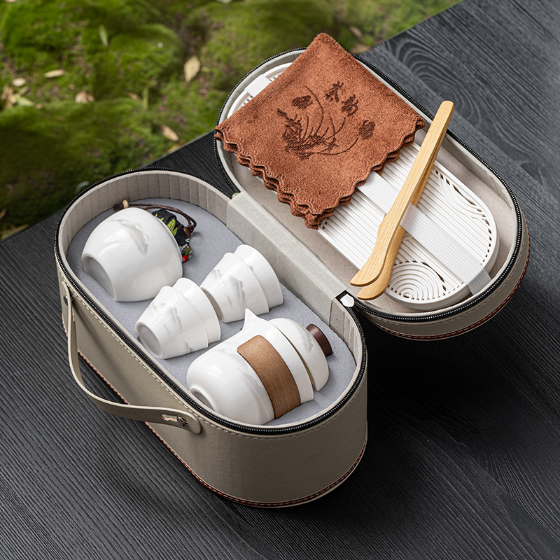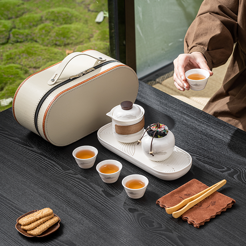 茶具表面饰有山水图案,简约而富有意境;具为白色陶瓷材质,给人干净、雅致之感;配有专门的收纳包,方便携带,适合外出旅行