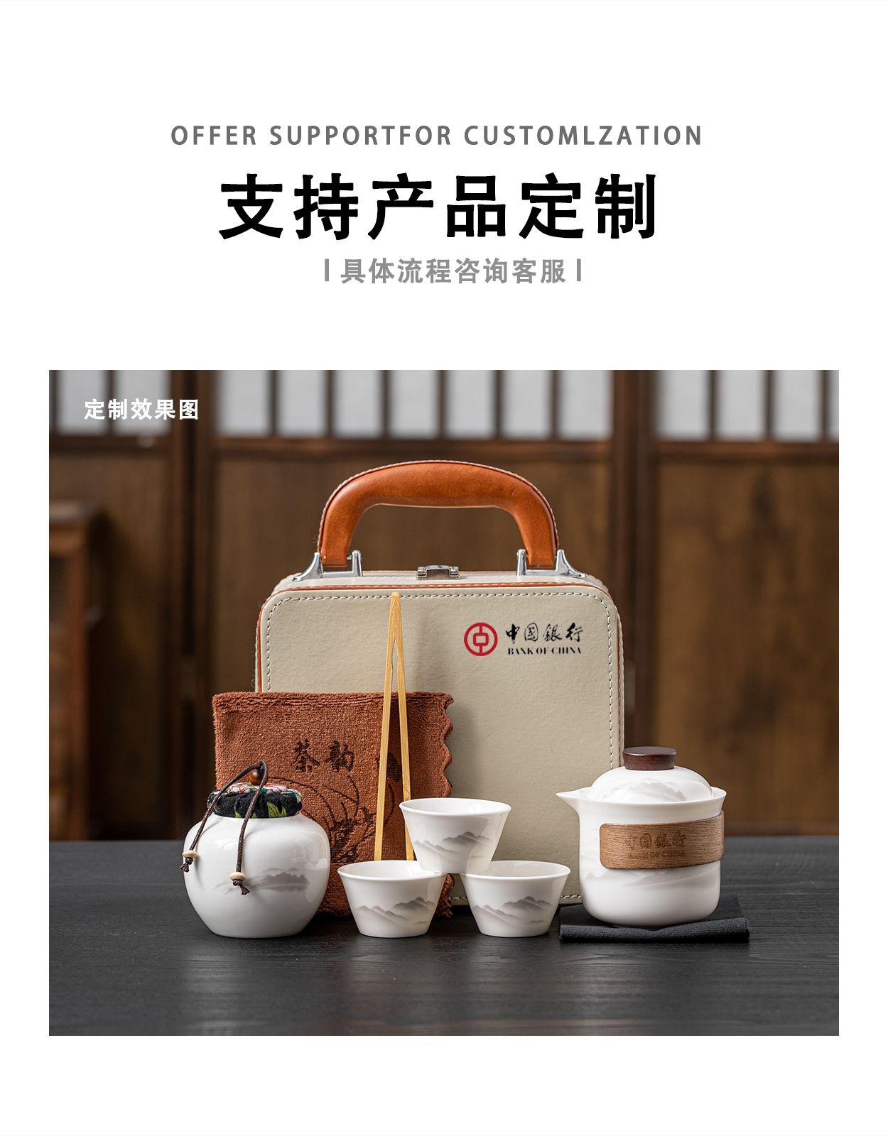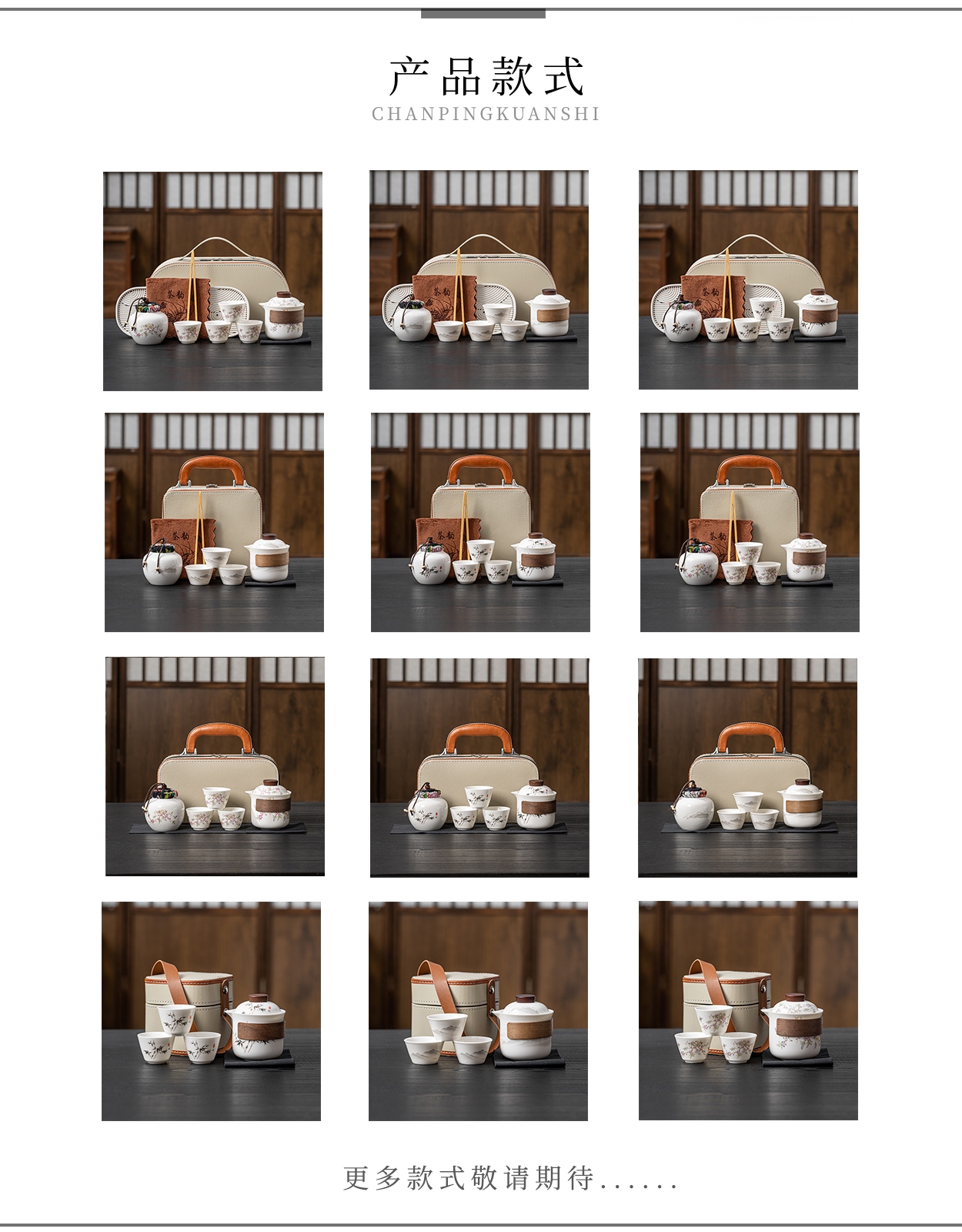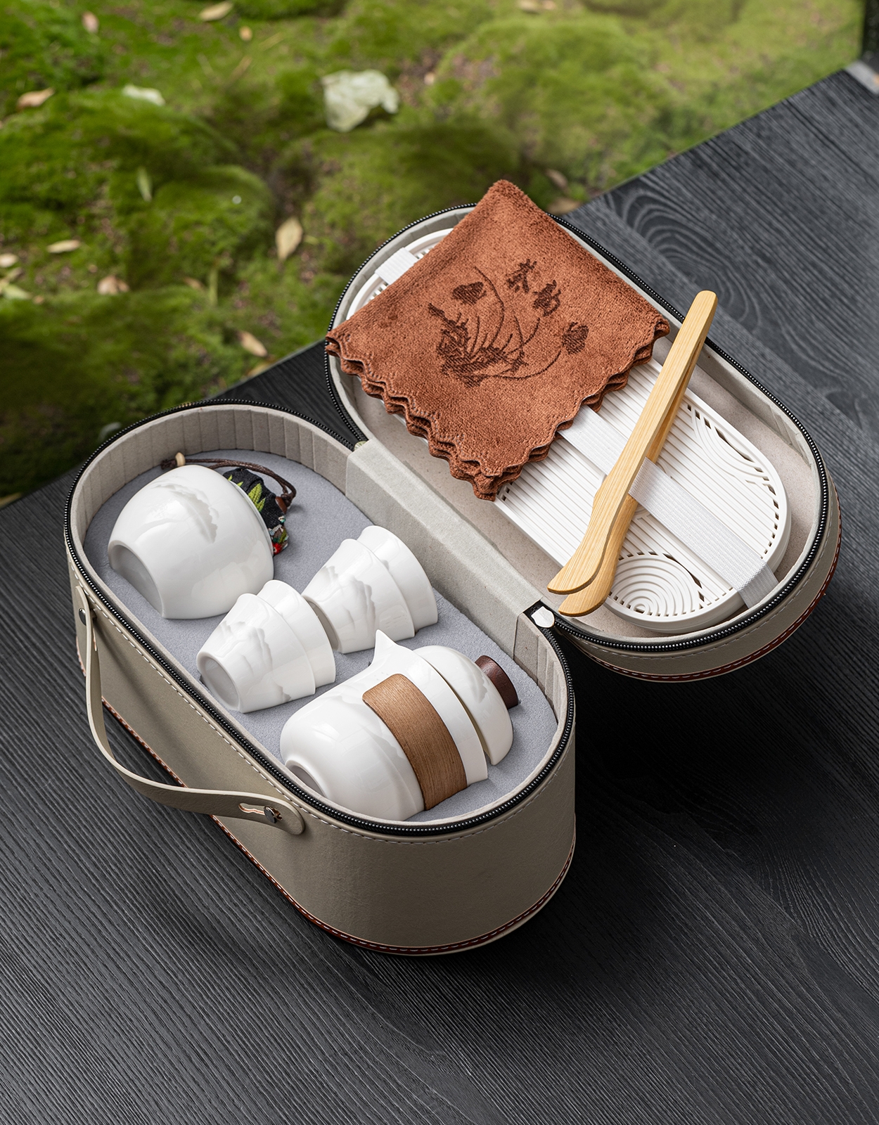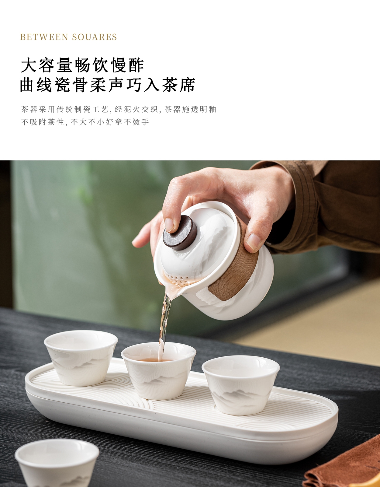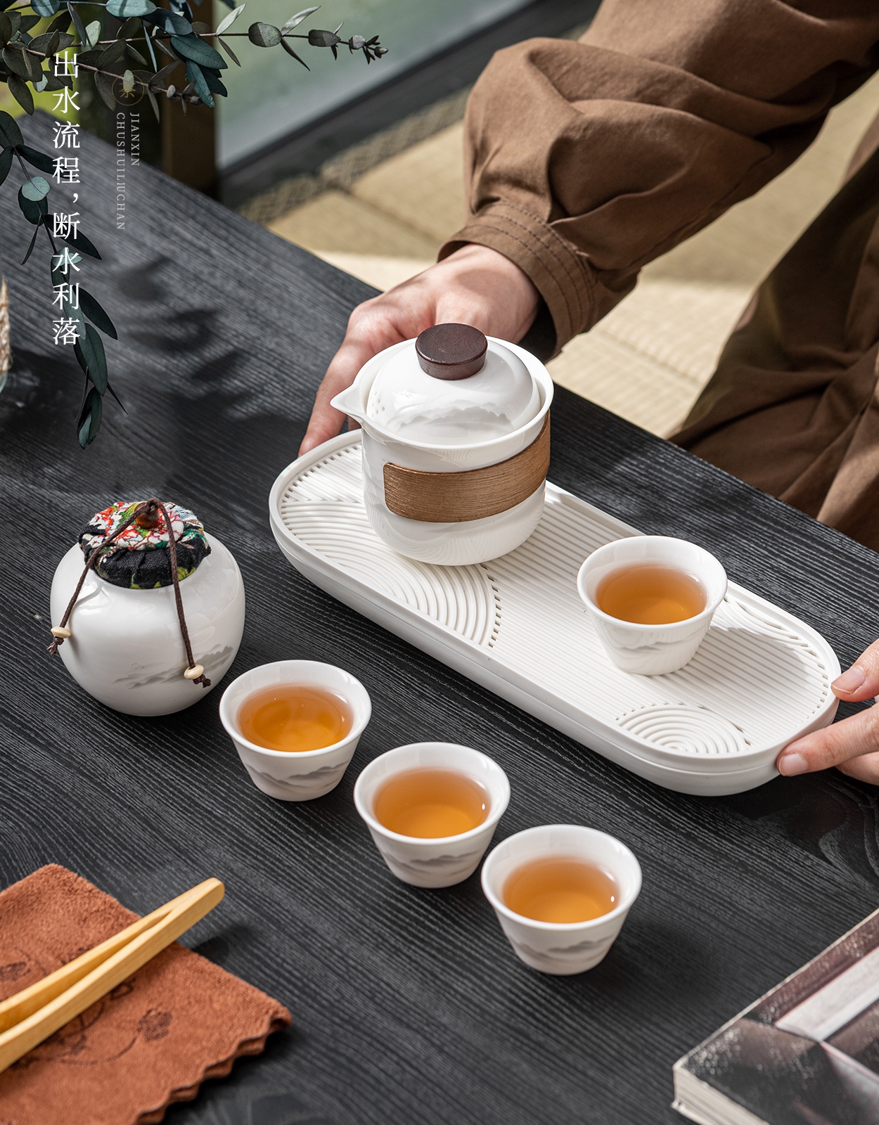 茶具表面饰有山水图案,简约而富有意境;具为白色陶瓷材质,给人干净、雅致之感;配有专门的收纳包,方便携带,适合外出旅行