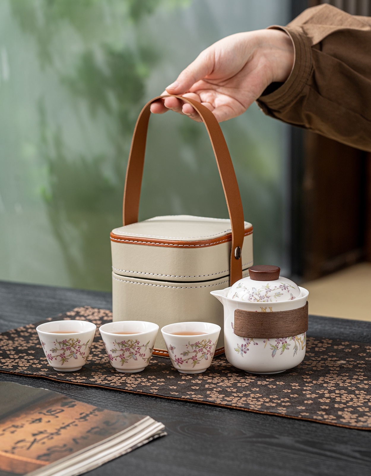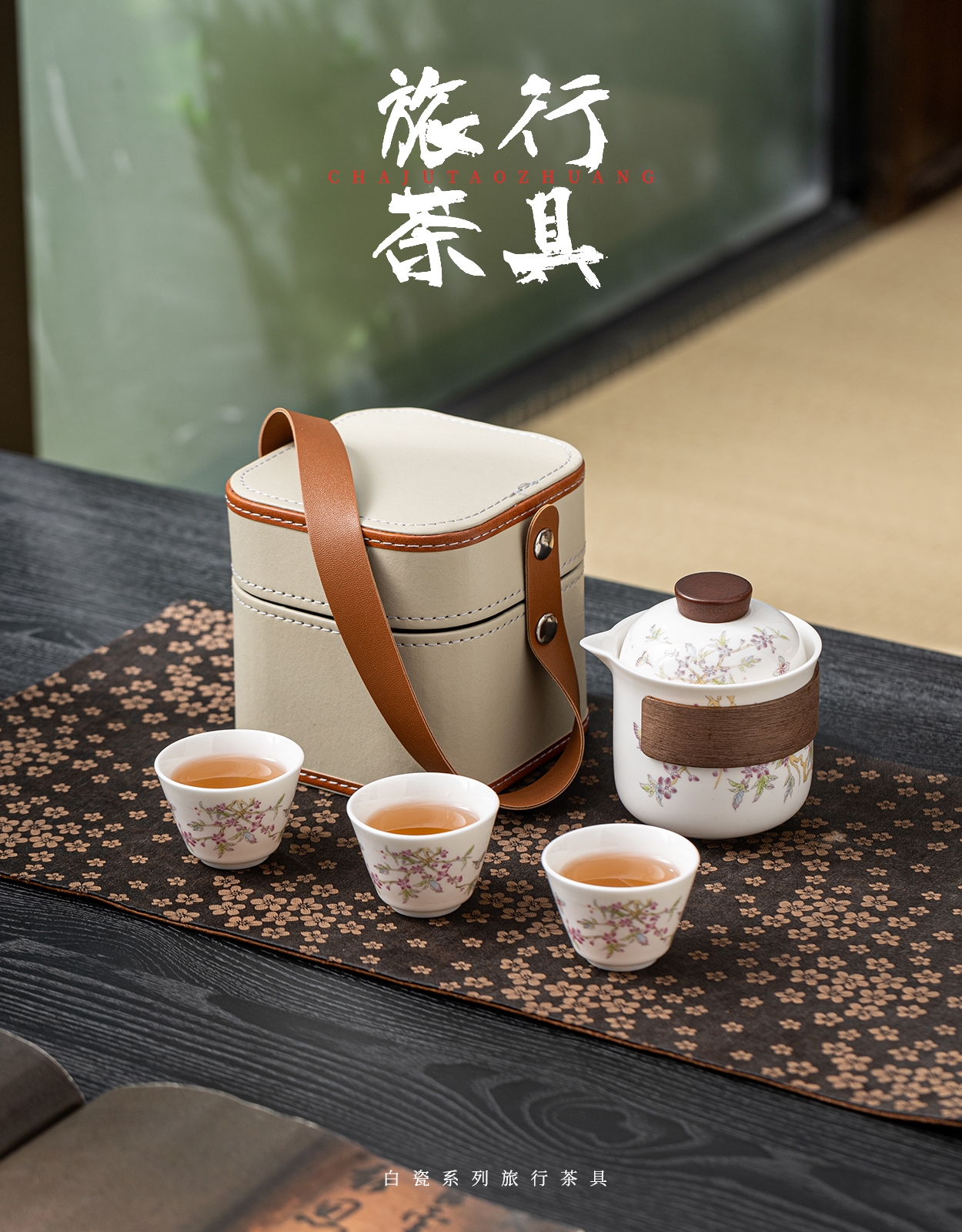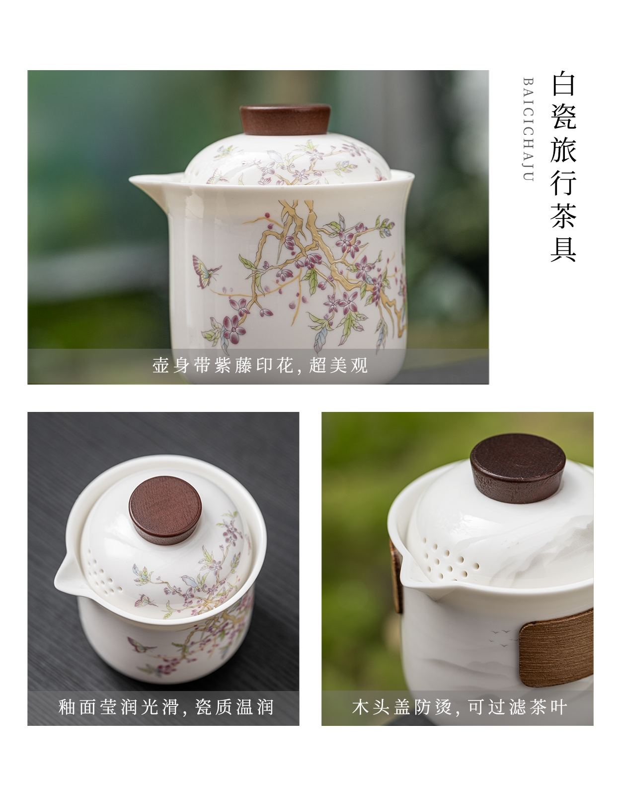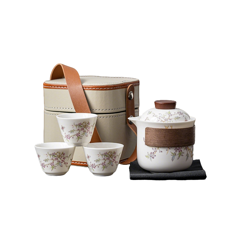 茶具表面绘有紫藤花图案,色彩柔和淡雅,富有自然美感;采用白瓷材质,质地细腻光滑,观感上洁白纯净;配套的四方包设计精巧,带有提手,方便携带和收纳