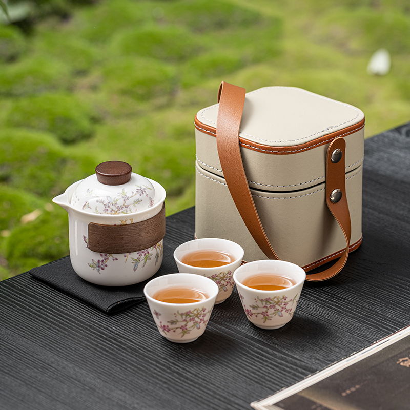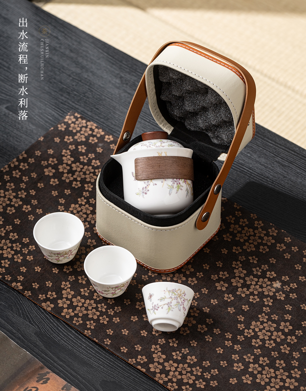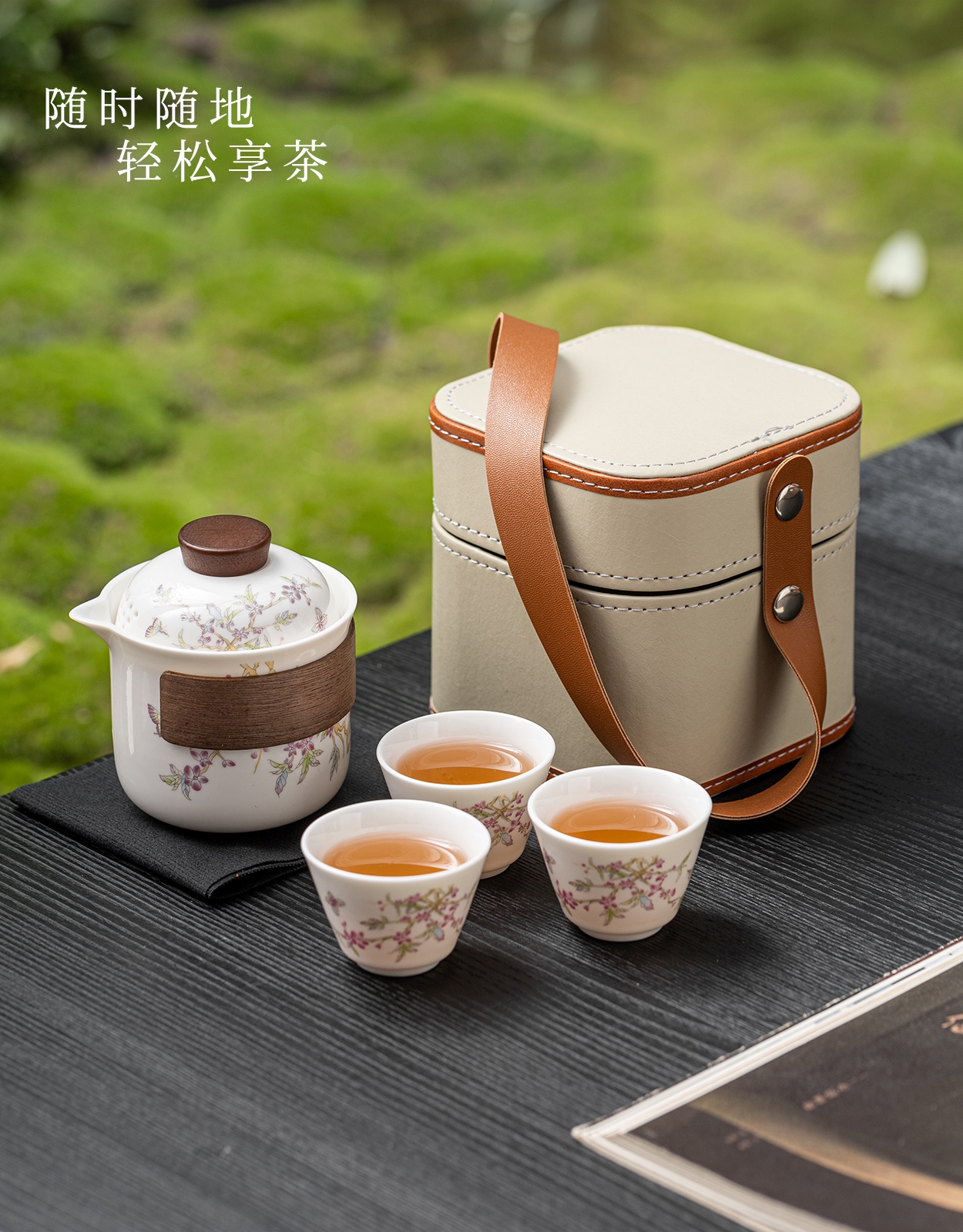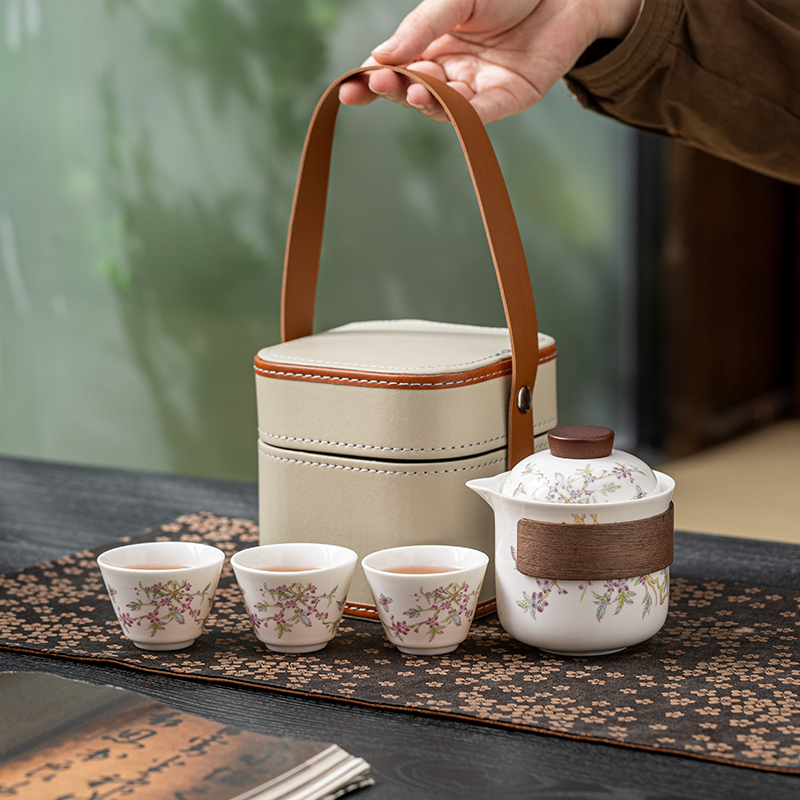 茶具表面绘有紫藤花图案,色彩柔和淡雅,富有自然美感;采用白瓷材质,质地细腻光滑,观感上洁白纯净;配套的四方包设计精巧,带有提手,方便携带和收纳