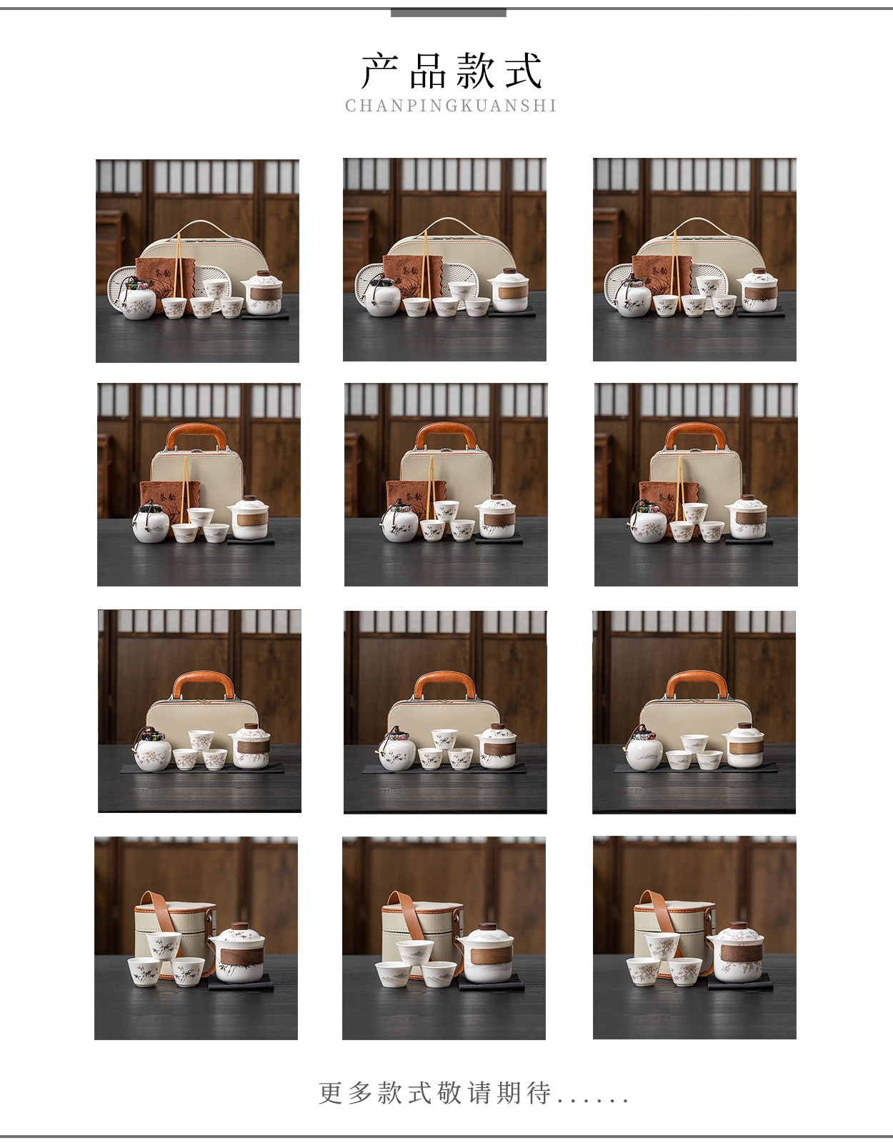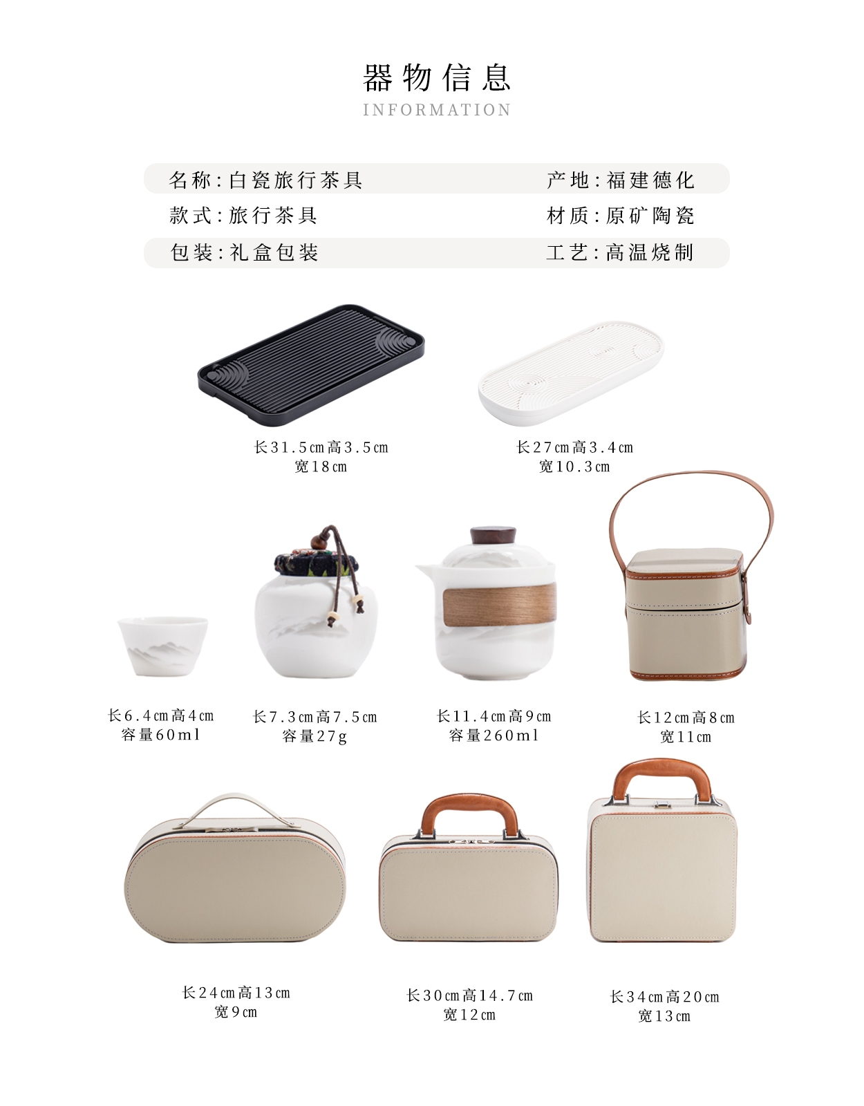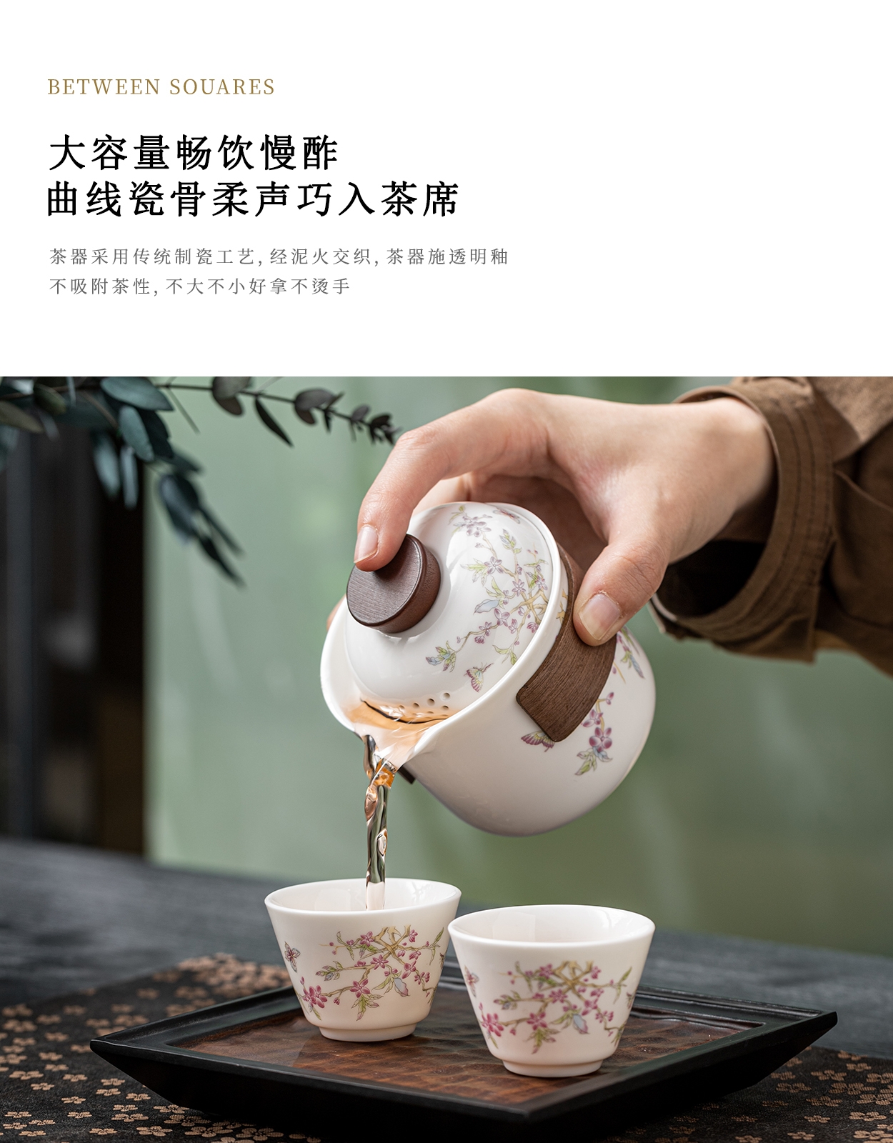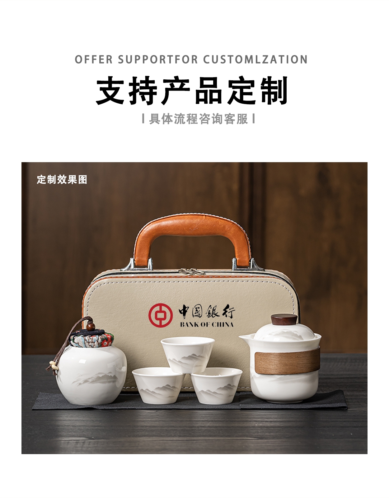 茶具表面绘有紫藤花图案,色彩柔和淡雅,富有自然美感;采用白瓷材质,质地细腻光滑,观感上洁白纯净;配套的四方包设计精巧,带有提手,方便携带和收纳