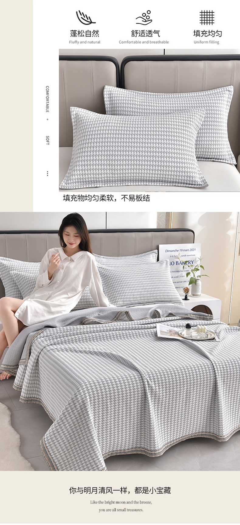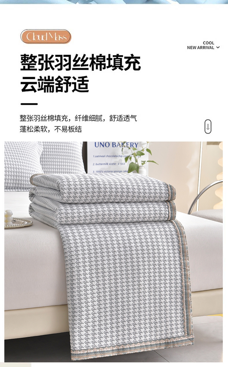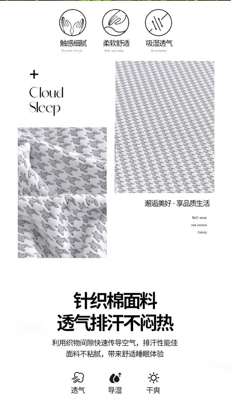 臻选针织棉面料,源于自然的绵软触感;填充超柔羽丝纤维适合肌肤敏感,零压体验;根据人体工学原理,将被子划分为不同区域
