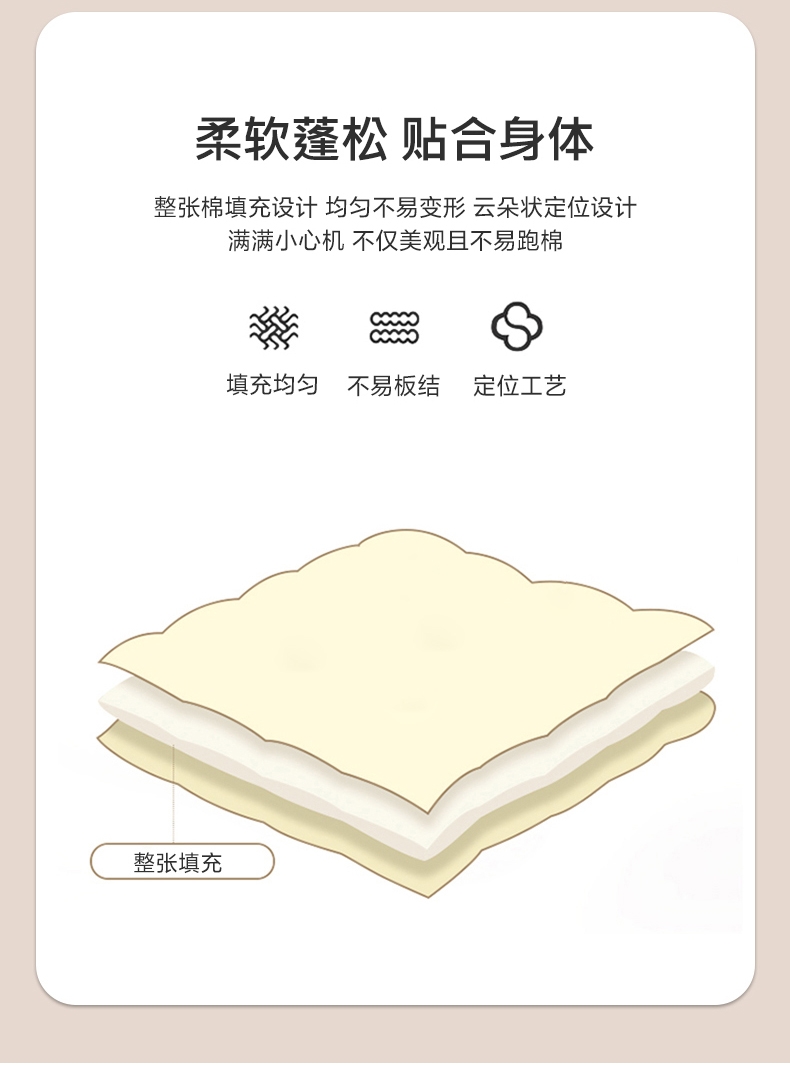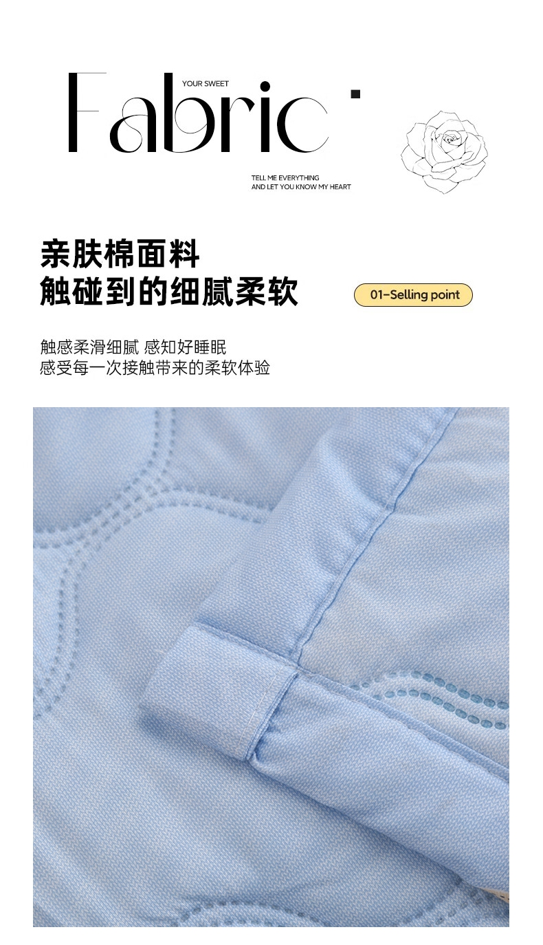 .甄选优质亲肤水洗棉纤维面料,;使织物表面形成一层层细腻的短绒毛层的感觉。;采用纤维填充,柔软蓬松,亲肤性佳