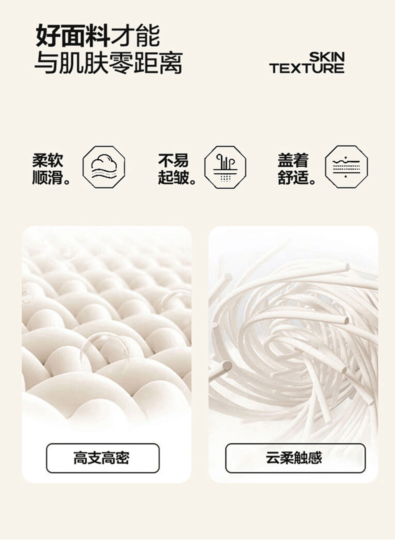 源于自然的绵软触感 质感丰盈软糯与肌肤零距离接触;填充超柔羽丝纤维适合肌肤敏感,零压体验;:科学分区设计:根据人体工学原理,将被子划分为不同
