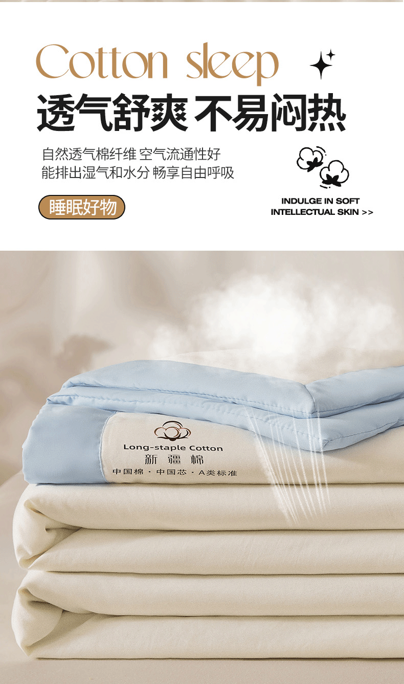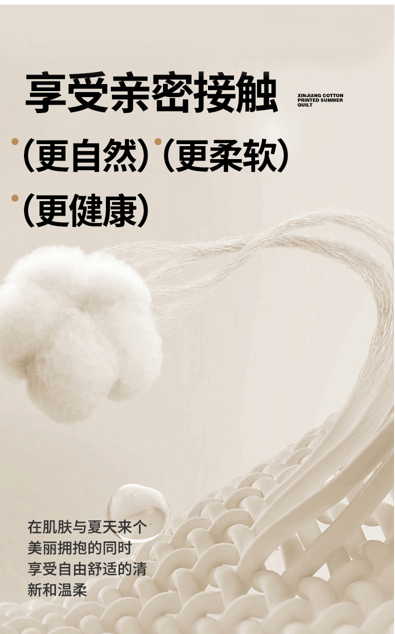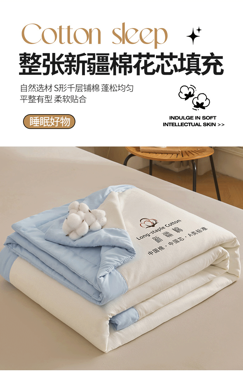 源于自然的绵软触感 质感丰盈软糯与肌肤零距离接触;填充超柔羽丝纤维适合肌肤敏感,零压体验;科学分区设计:根据人体工学原理,将被子划分为不同区