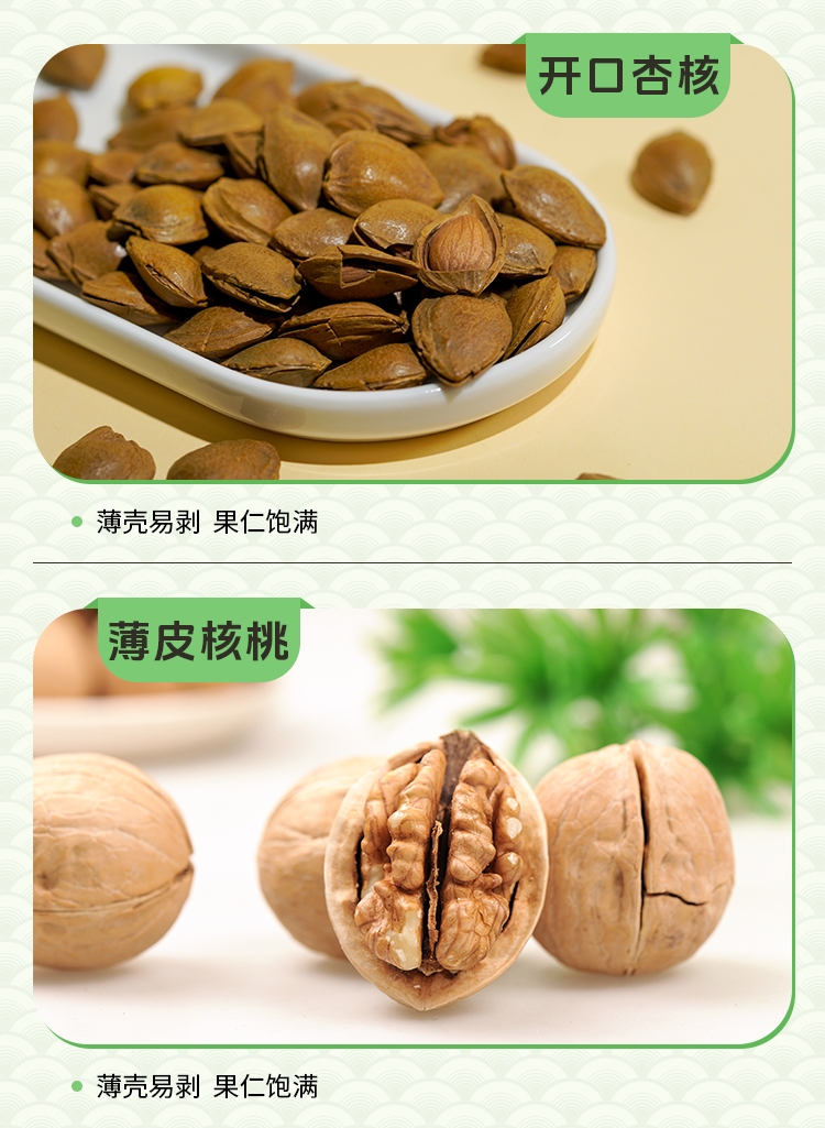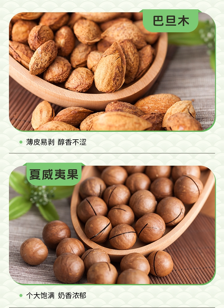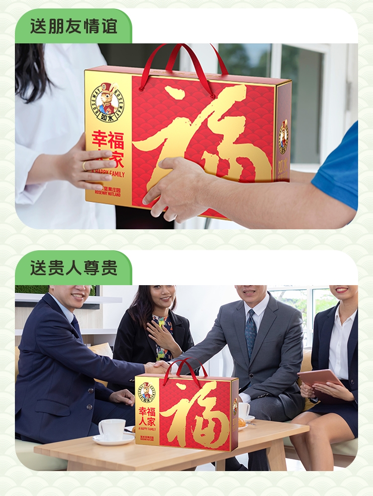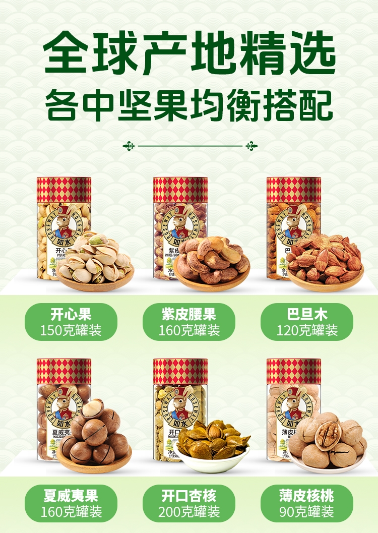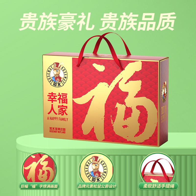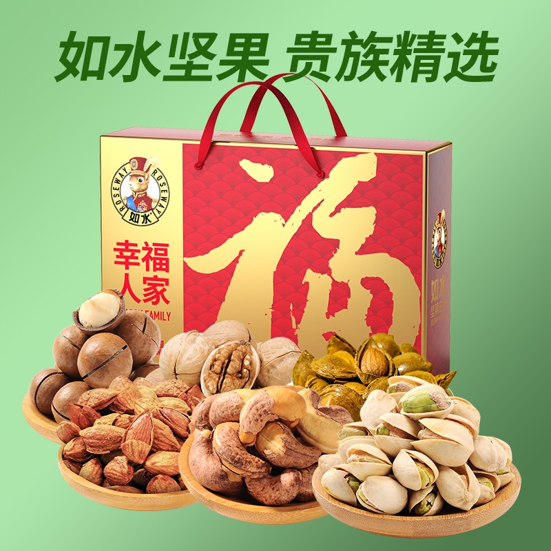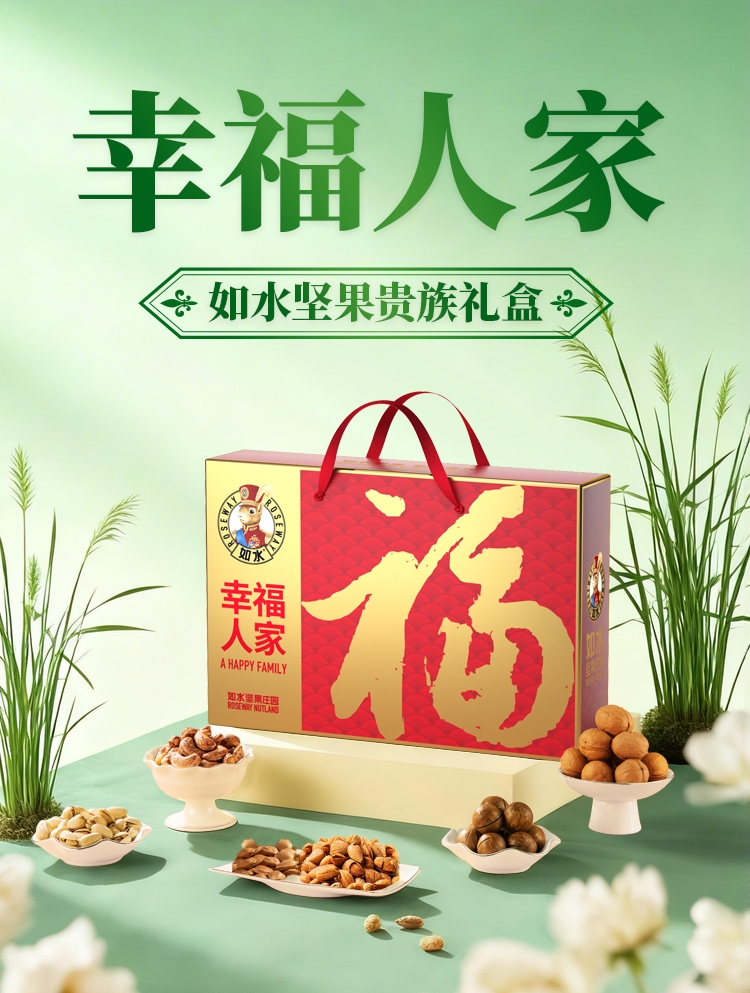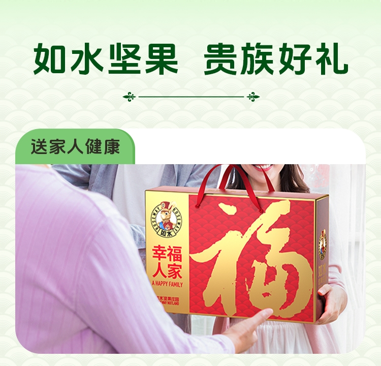如水坚果全球原产地直采,只挑选高等级高品质原材料,;6种坚果炒货一次享受。;“福”字为魂,海涛纹为韵,融入东方传统色彩