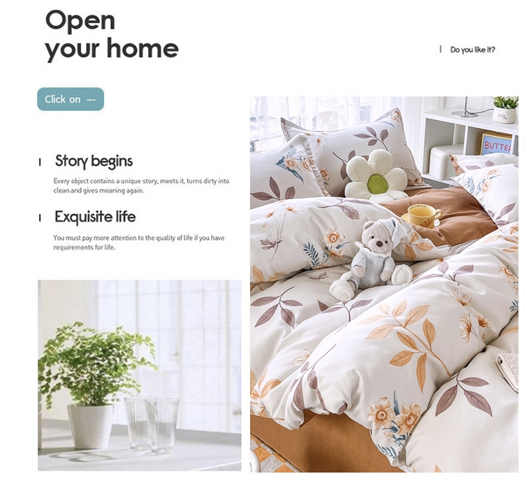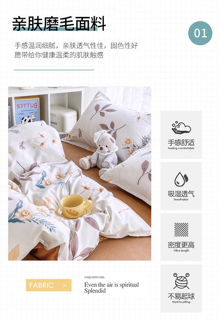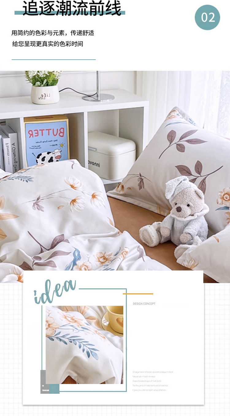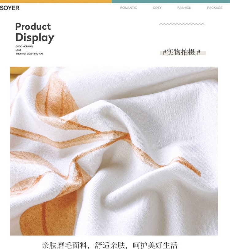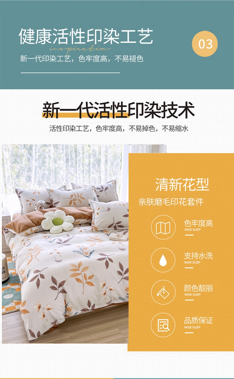 .面料采用生态亲肤棉,新型环保浆料活性印染,不褪色;生态棉面料,手感柔软,舒适质感丰厚;色彩丰富自然,阵线细致密实,错落有序,更显档次。