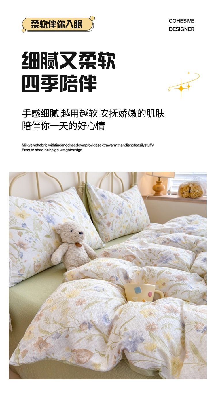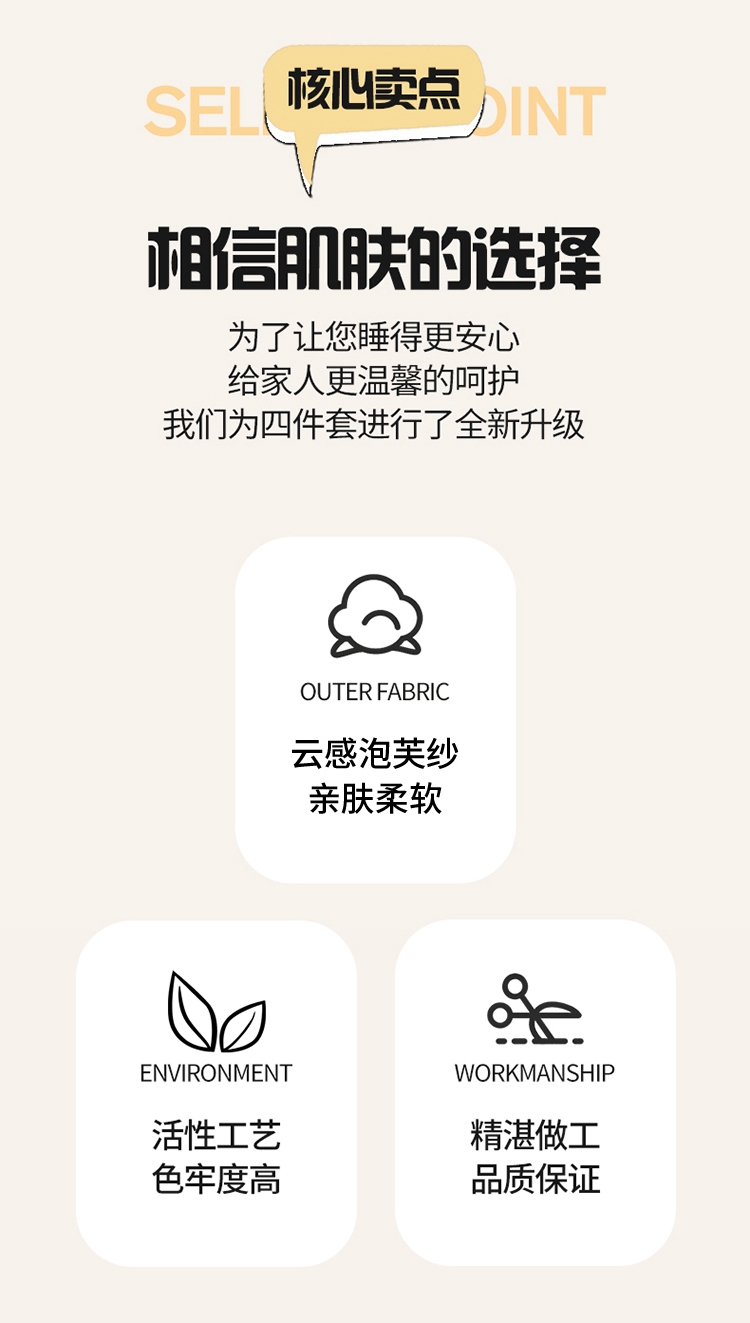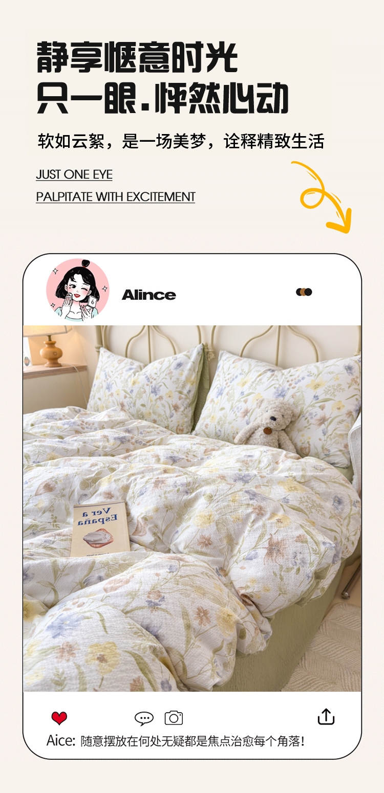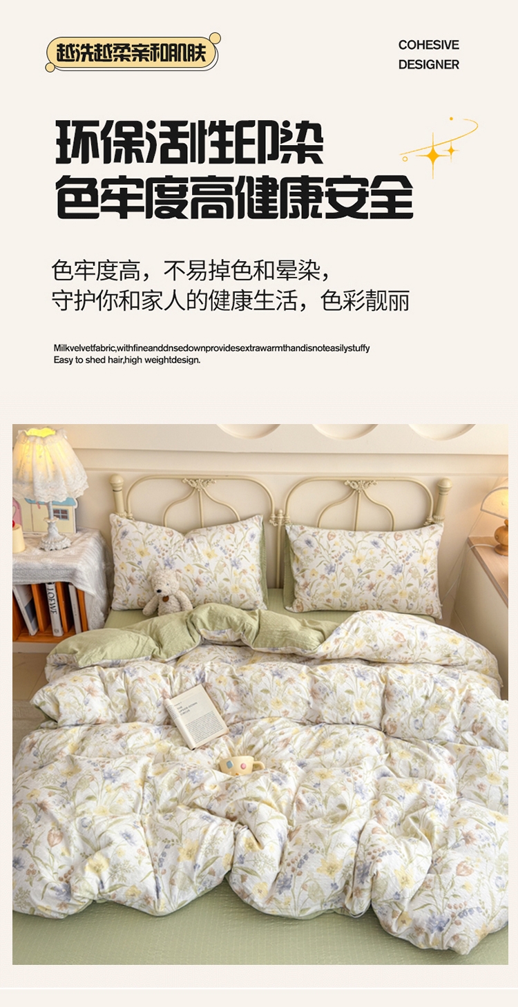 面料采用生态亲肤棉,新型环保浆料活性印染,不褪色;其生态环保理念在很大程度上满足了消费者对床品舒适度;色彩丰富自然,阵线细致密实,错落有序,更显档次。