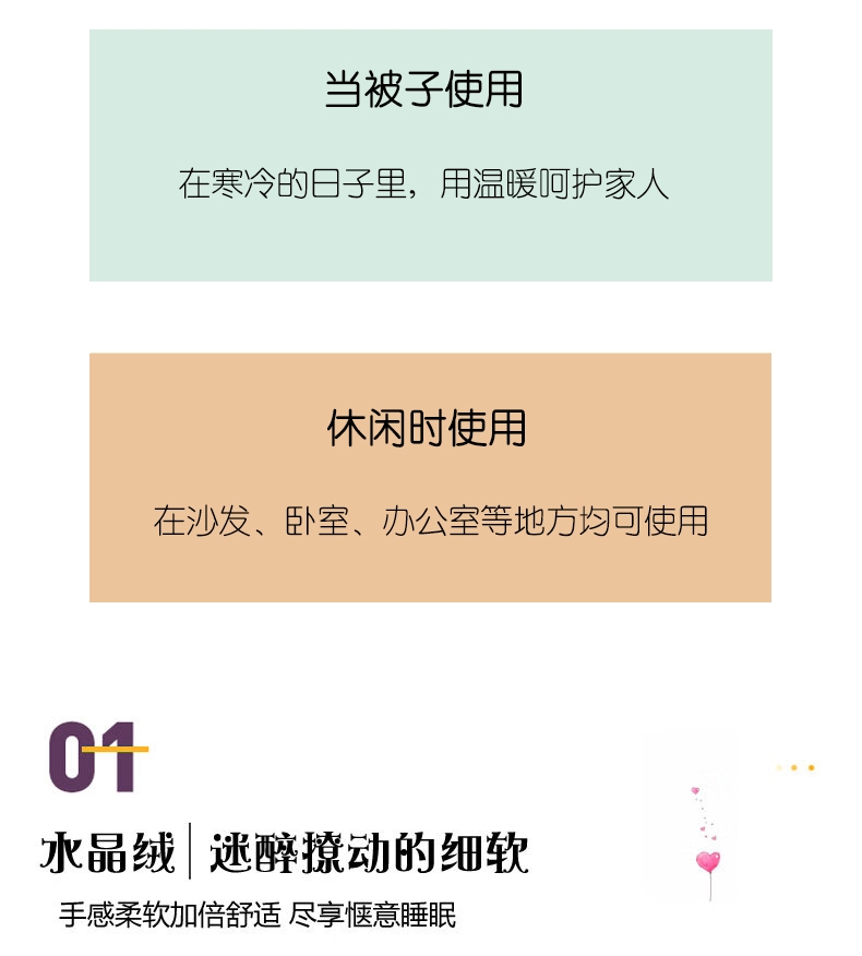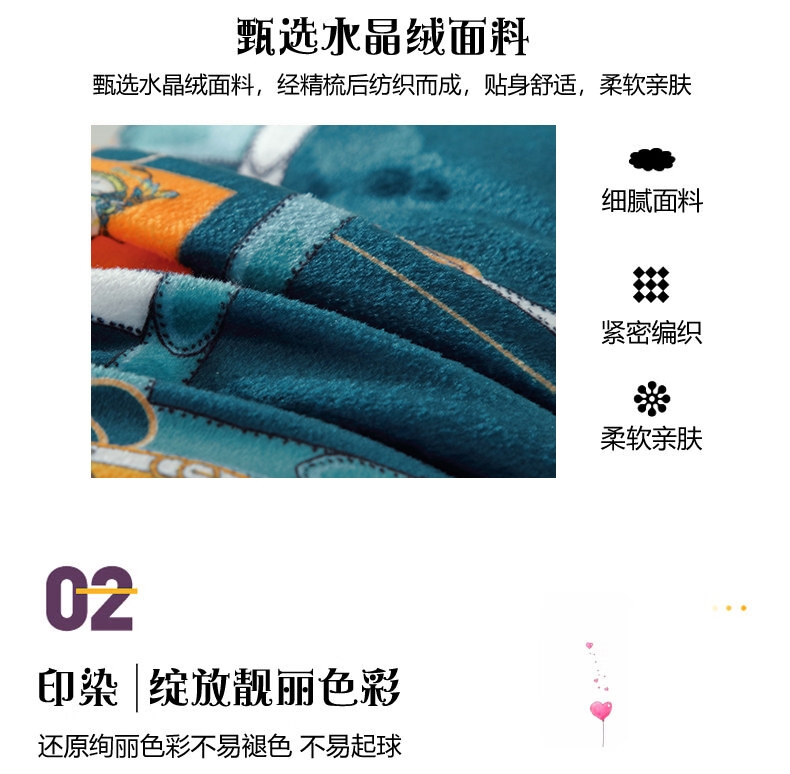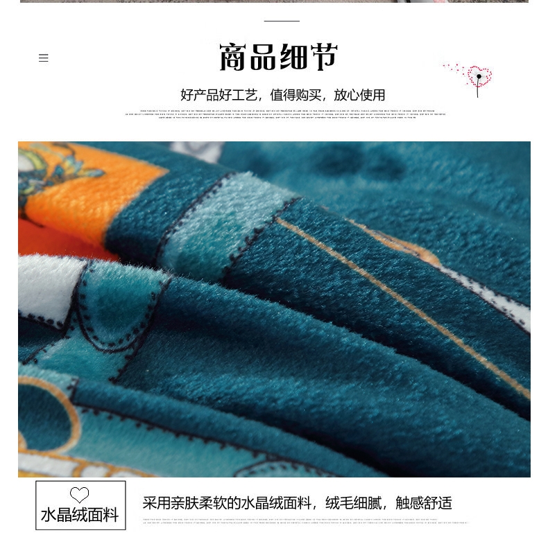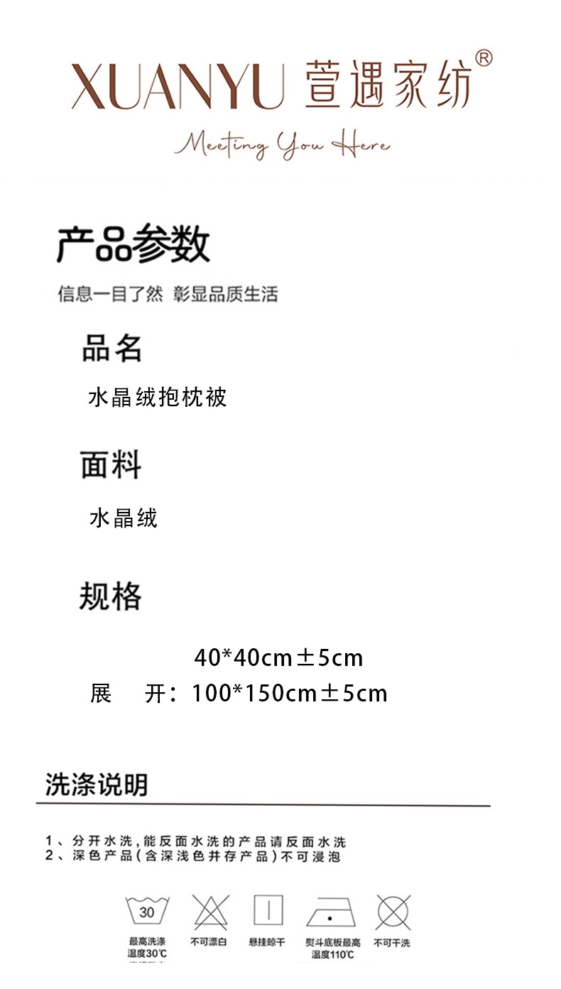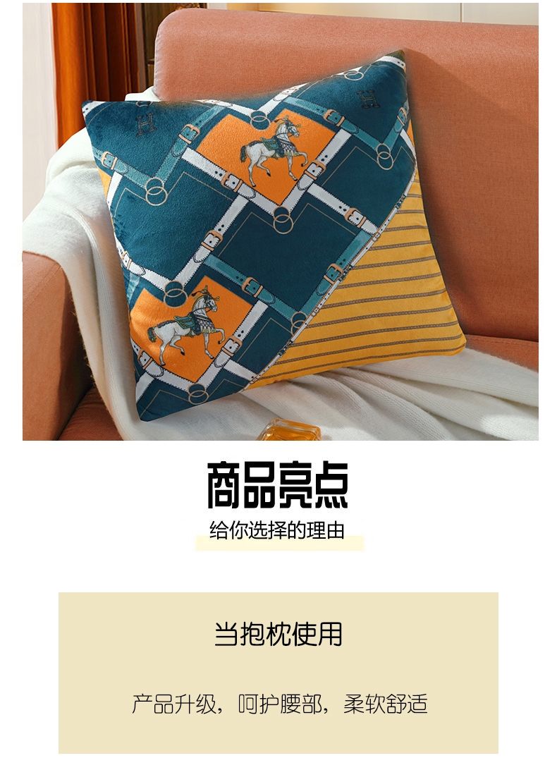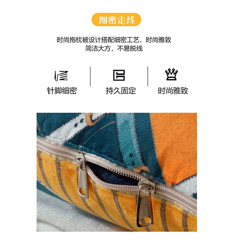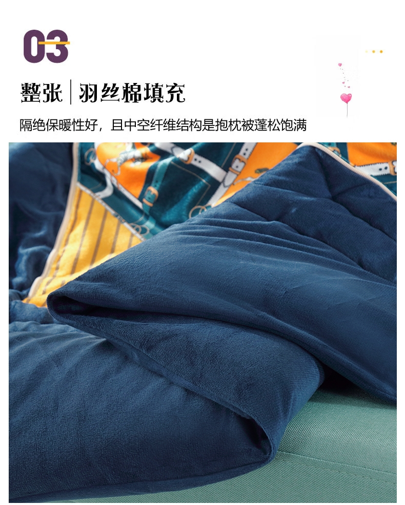 .采用水晶绒面料,颜色鲜艳、丰富、美观大方;填充环保羽丝纤维,轻薄透气,简约而不简单;抱枕被方便收纳,折叠后可作为家居抱枕