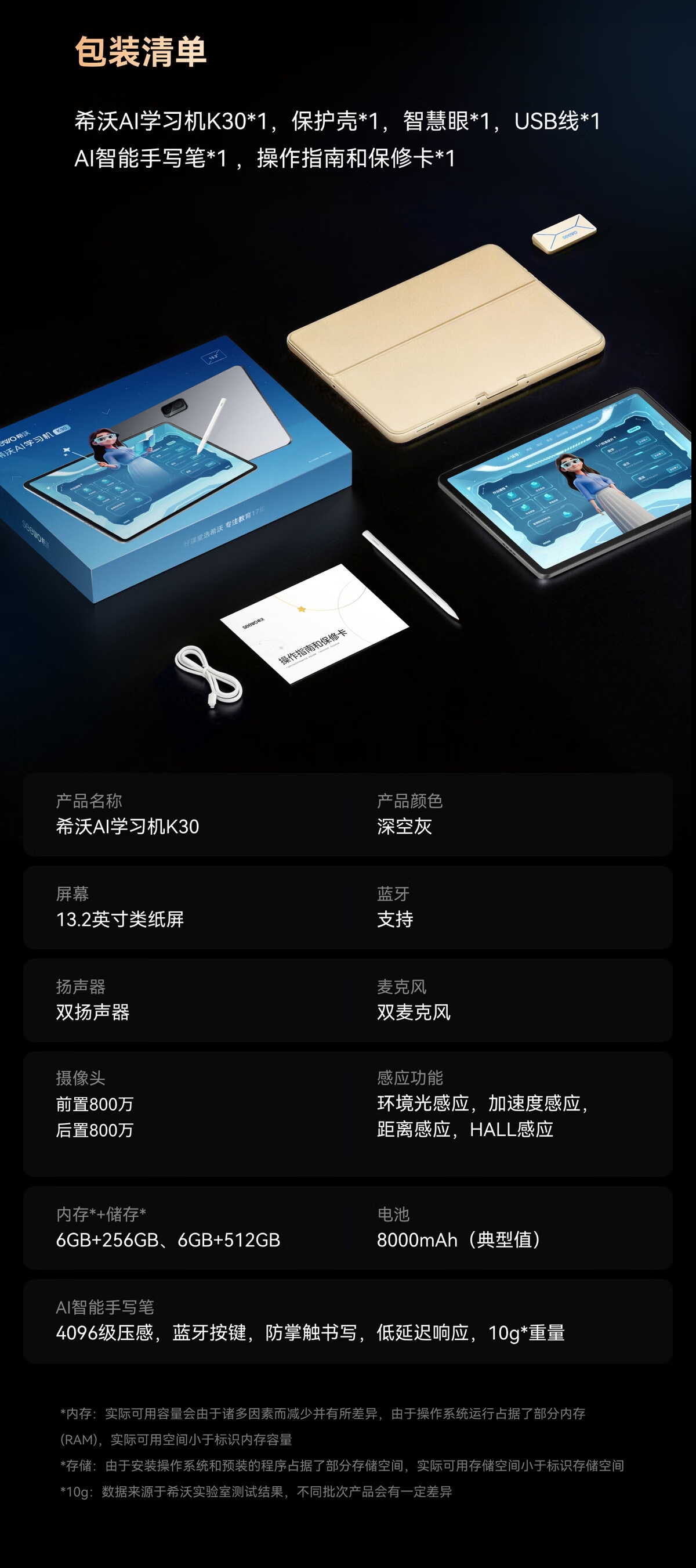 包装清单:希沃AI学习机K30*1,保护壳*1,智慧眼*1,USB线*1AI智能手写笔*1,操作指南和保修卡*1