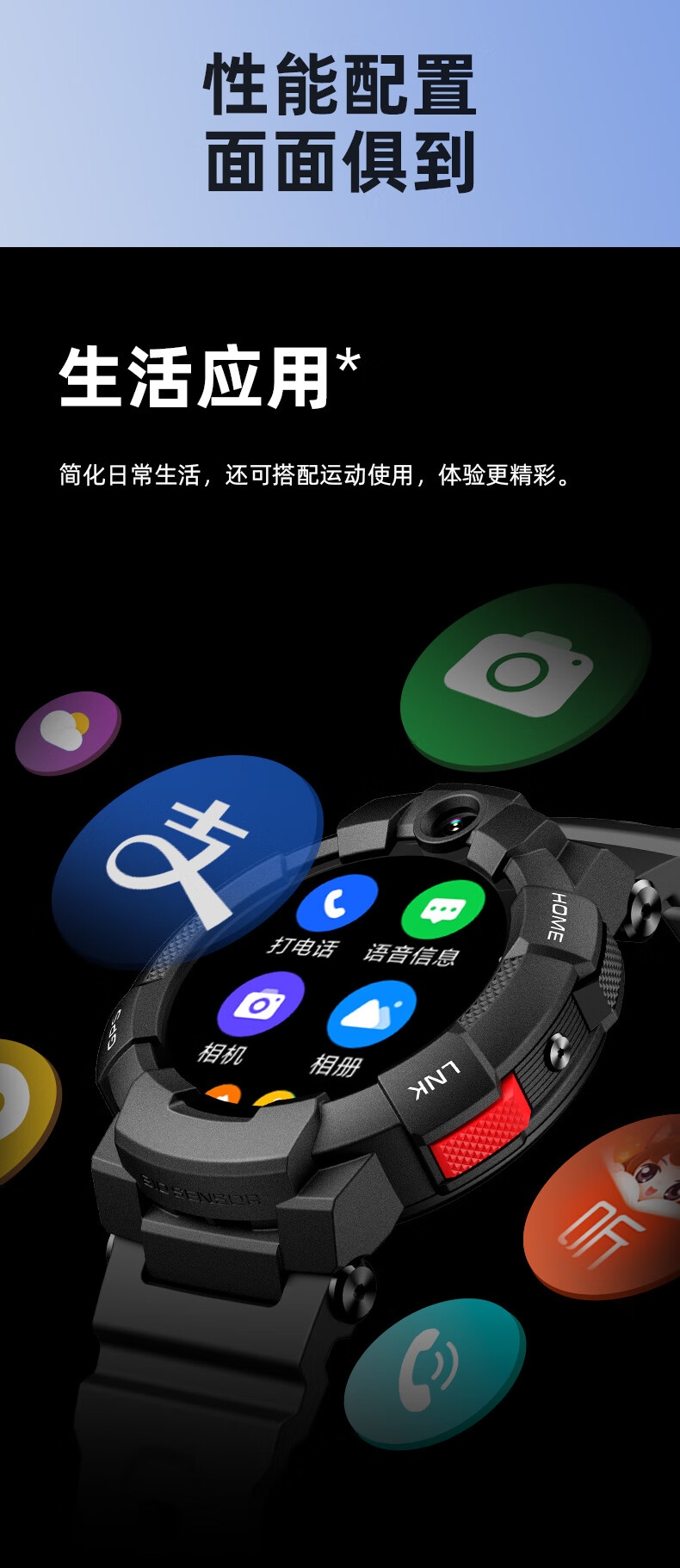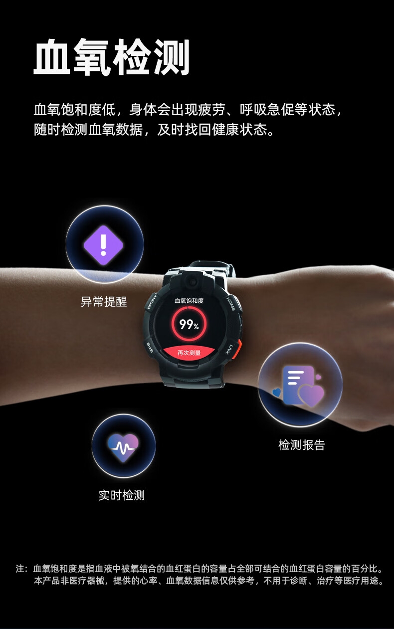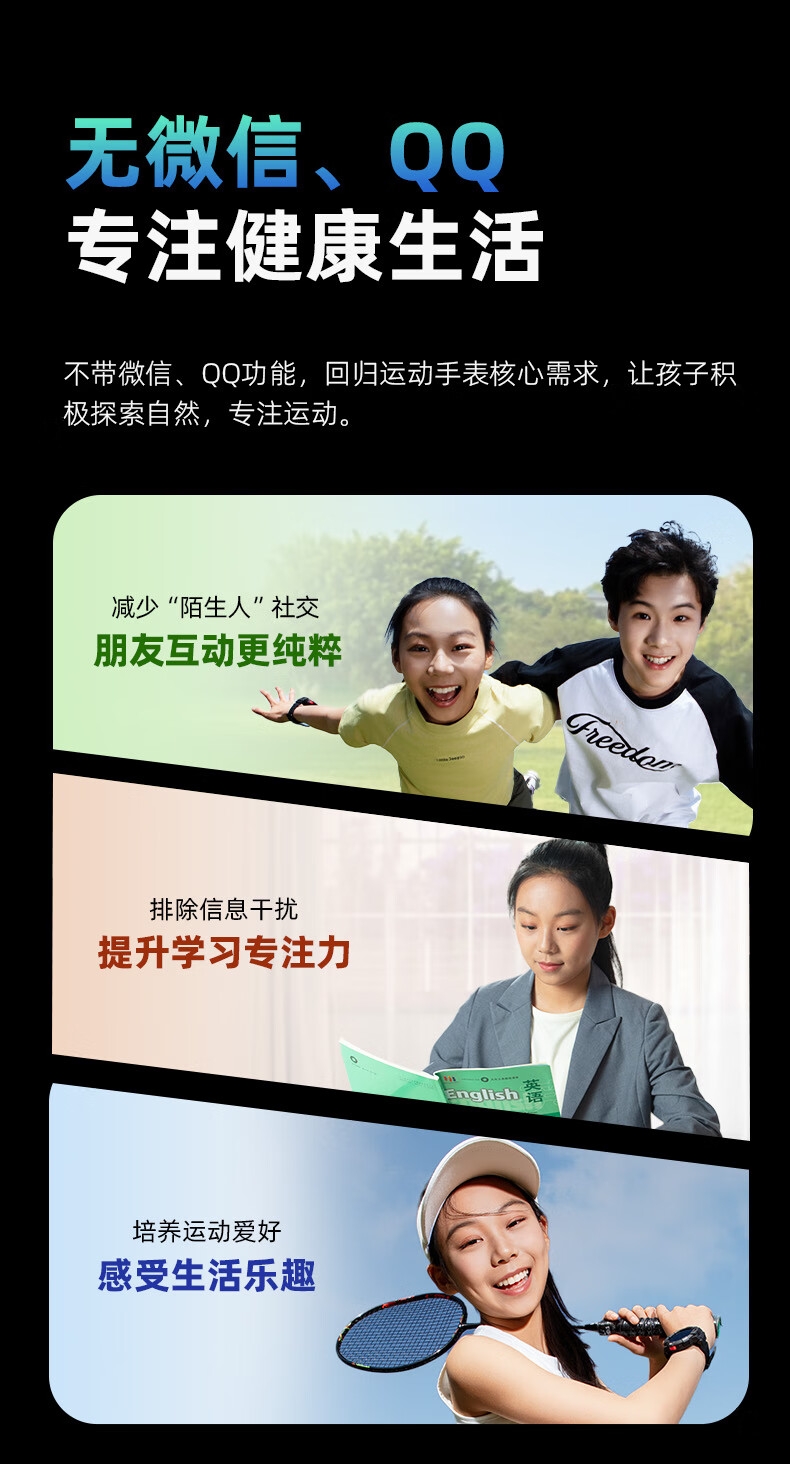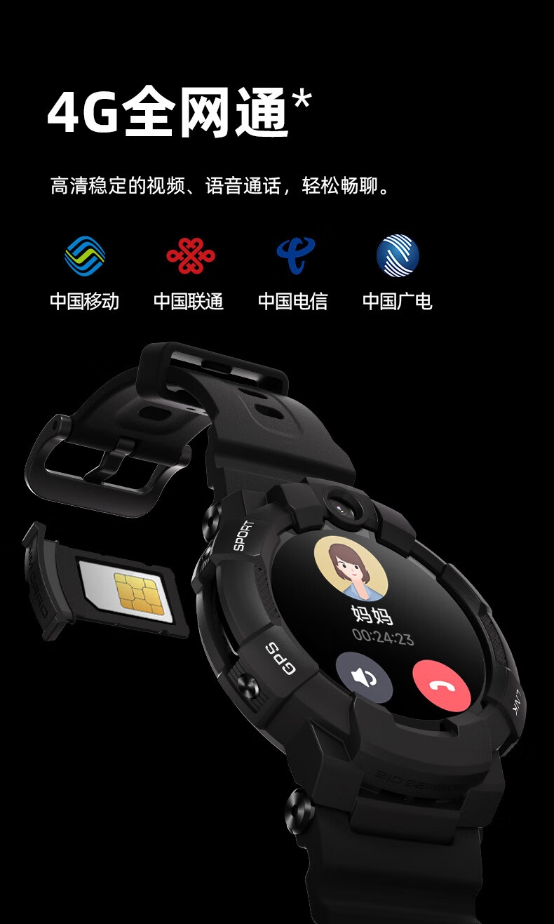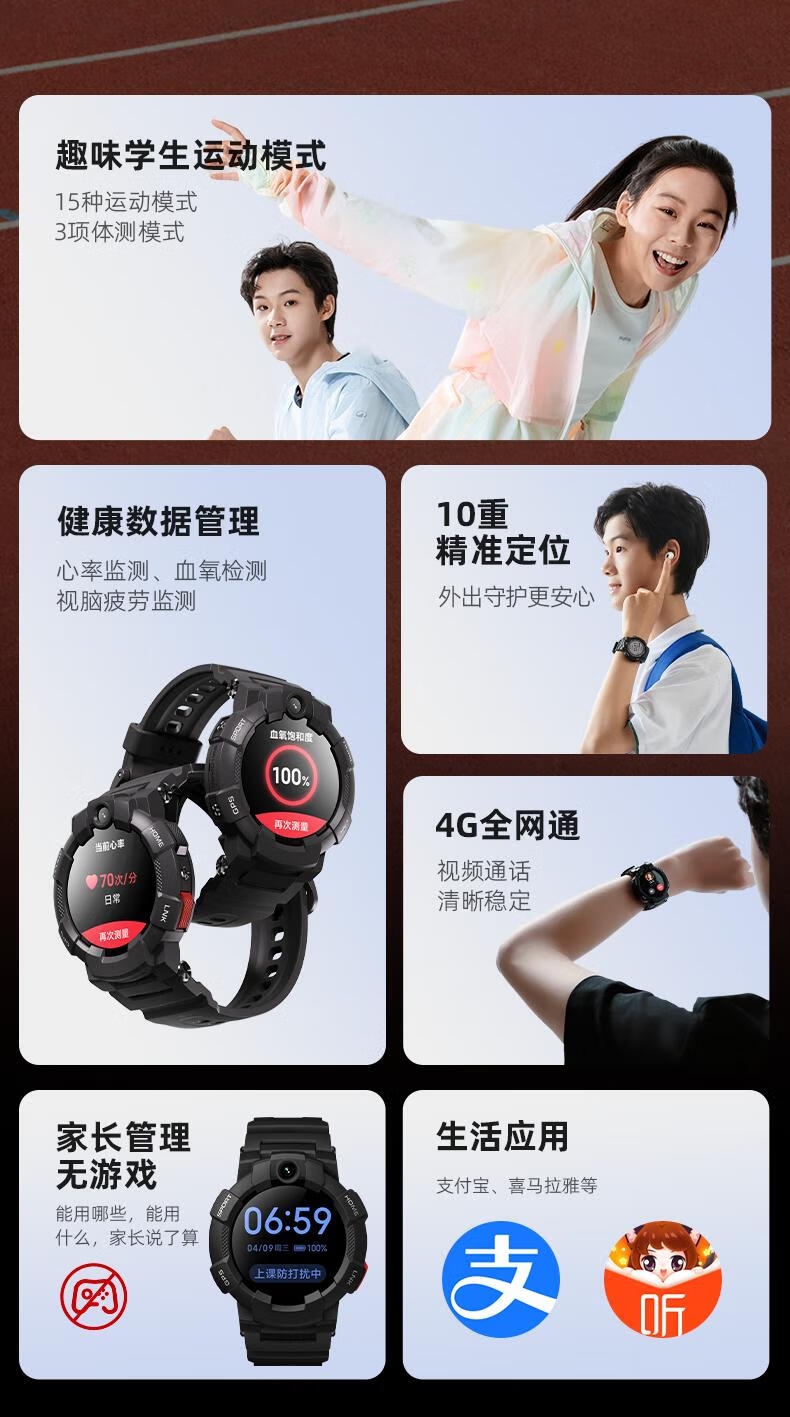 10重高精定位、心率监测、血氧检测、视/脑疲劳检测;自动更新行程动态、全天健康及运动监测;微信交友、打电话、手表交友、微聊