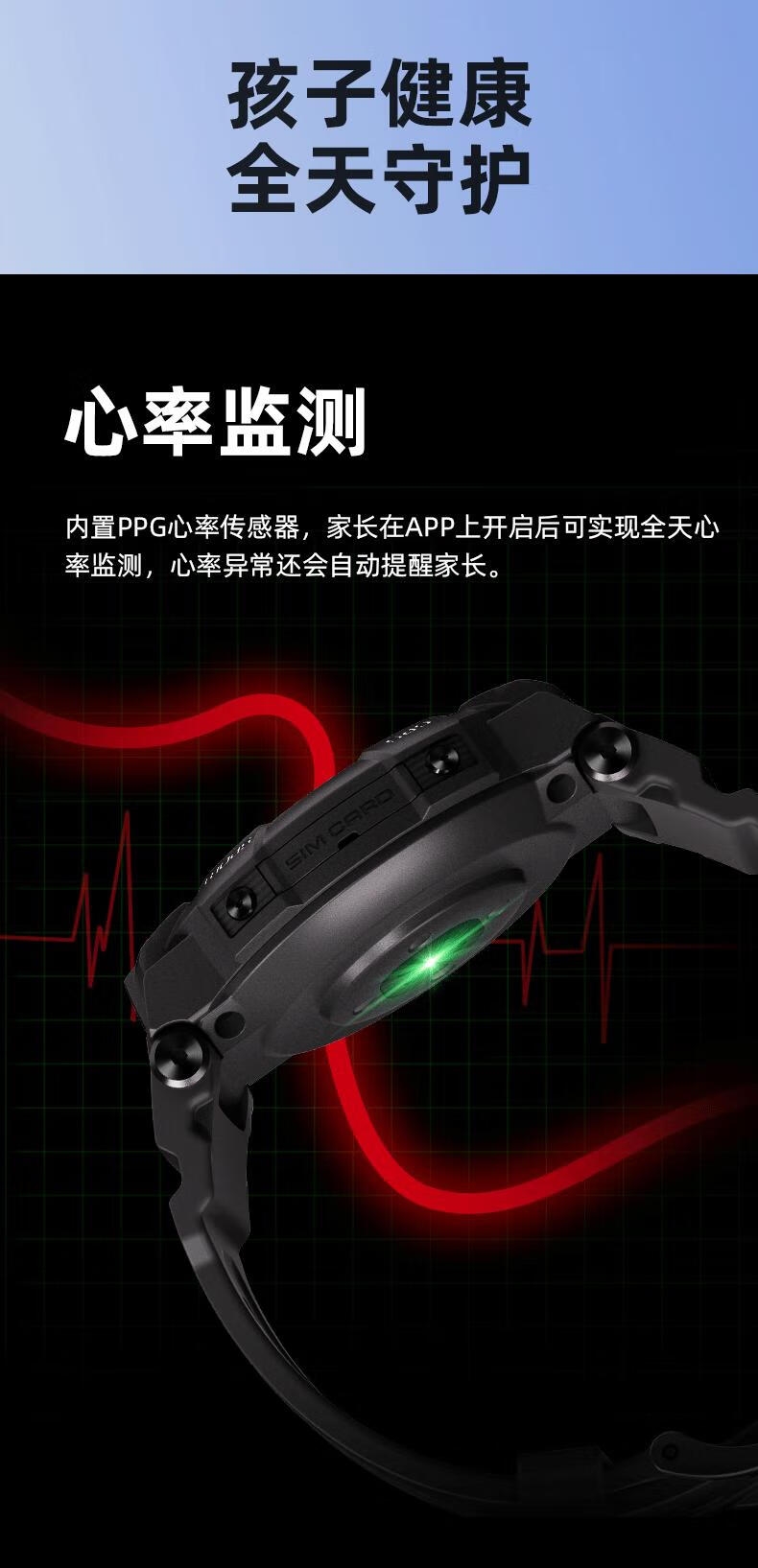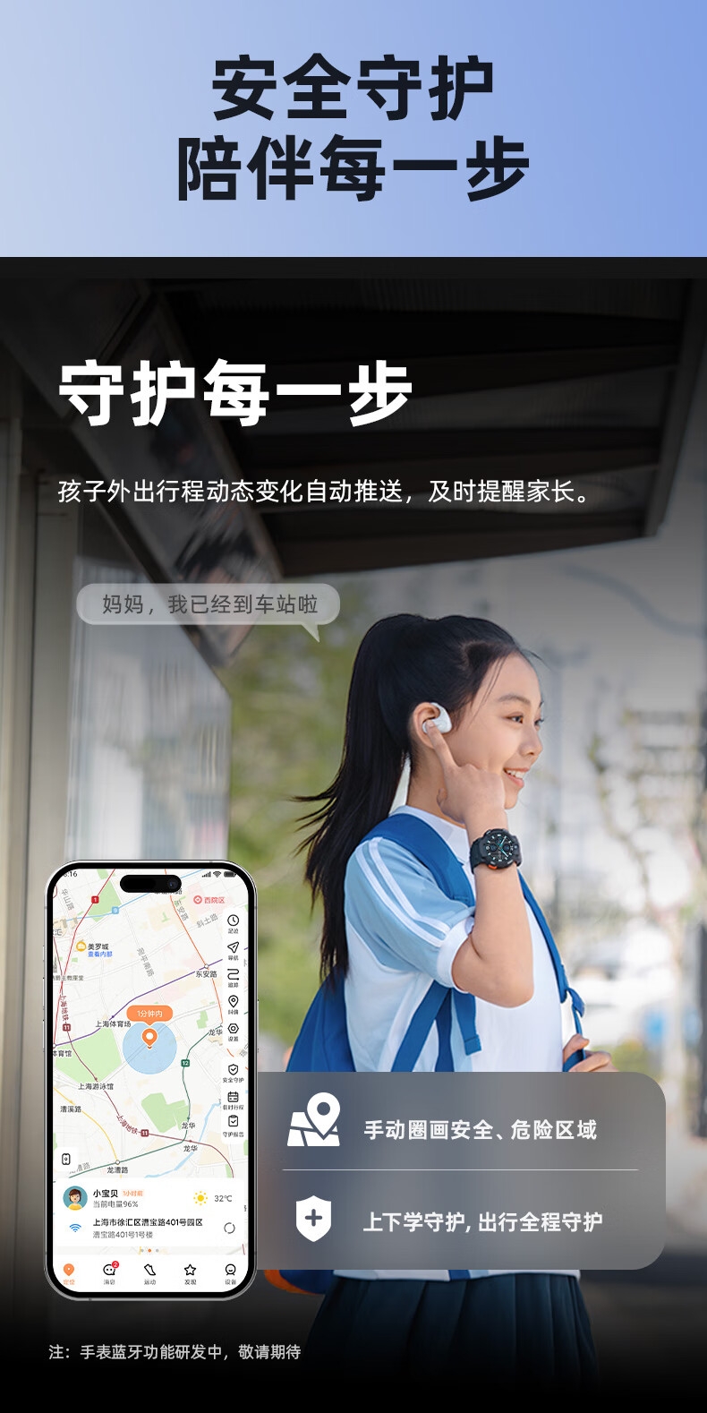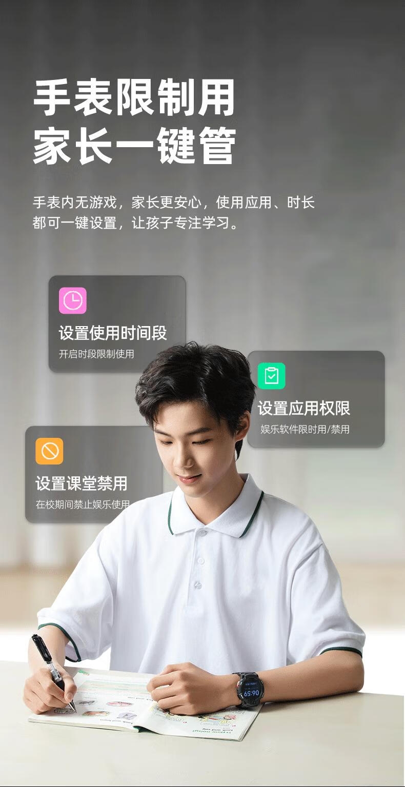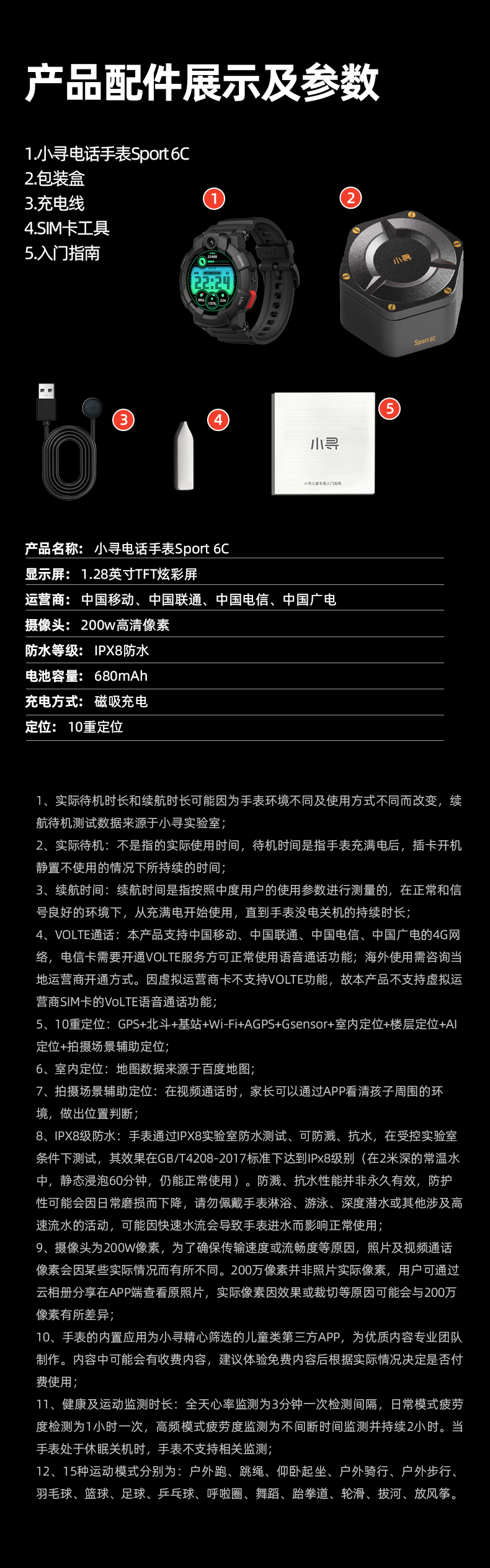 10重高精定位、心率监测、血氧检测、视/脑疲劳检测;自动更新行程动态、全天健康及运动监测;微信交友、打电话、手表交友、微聊