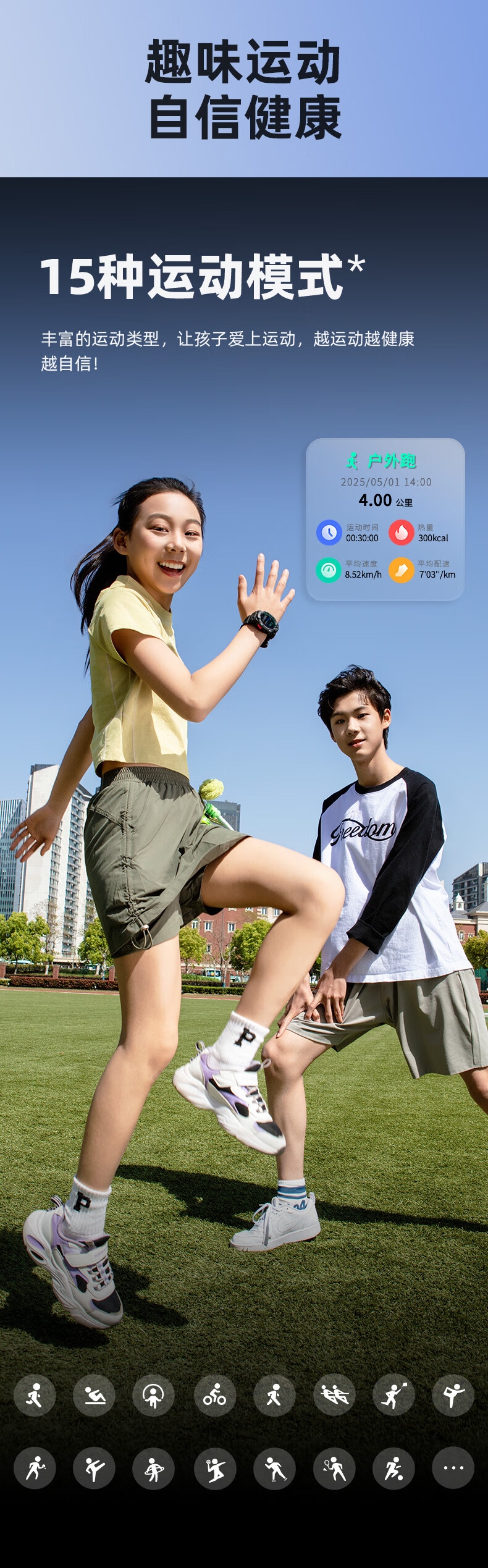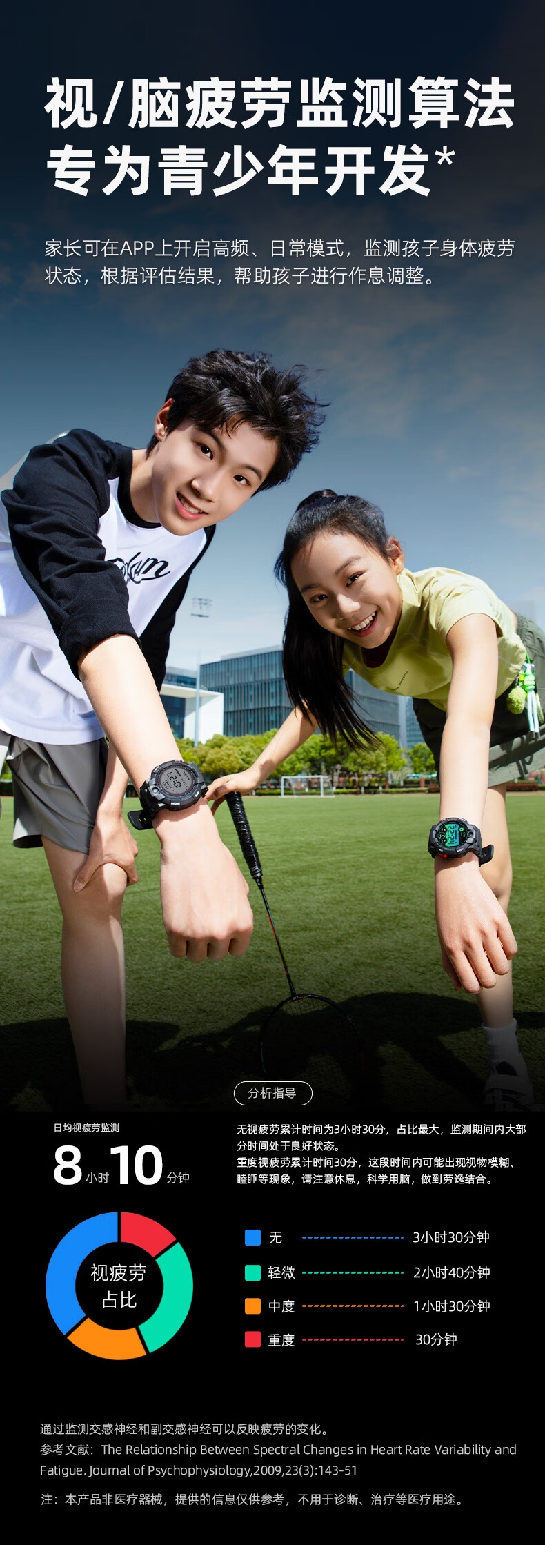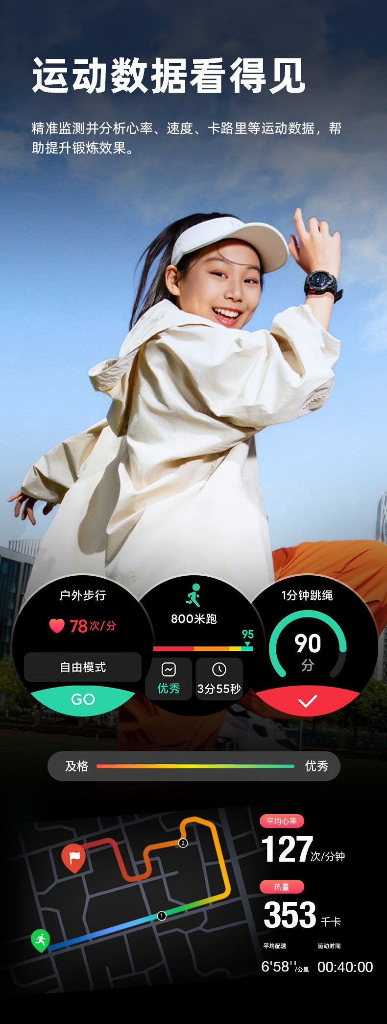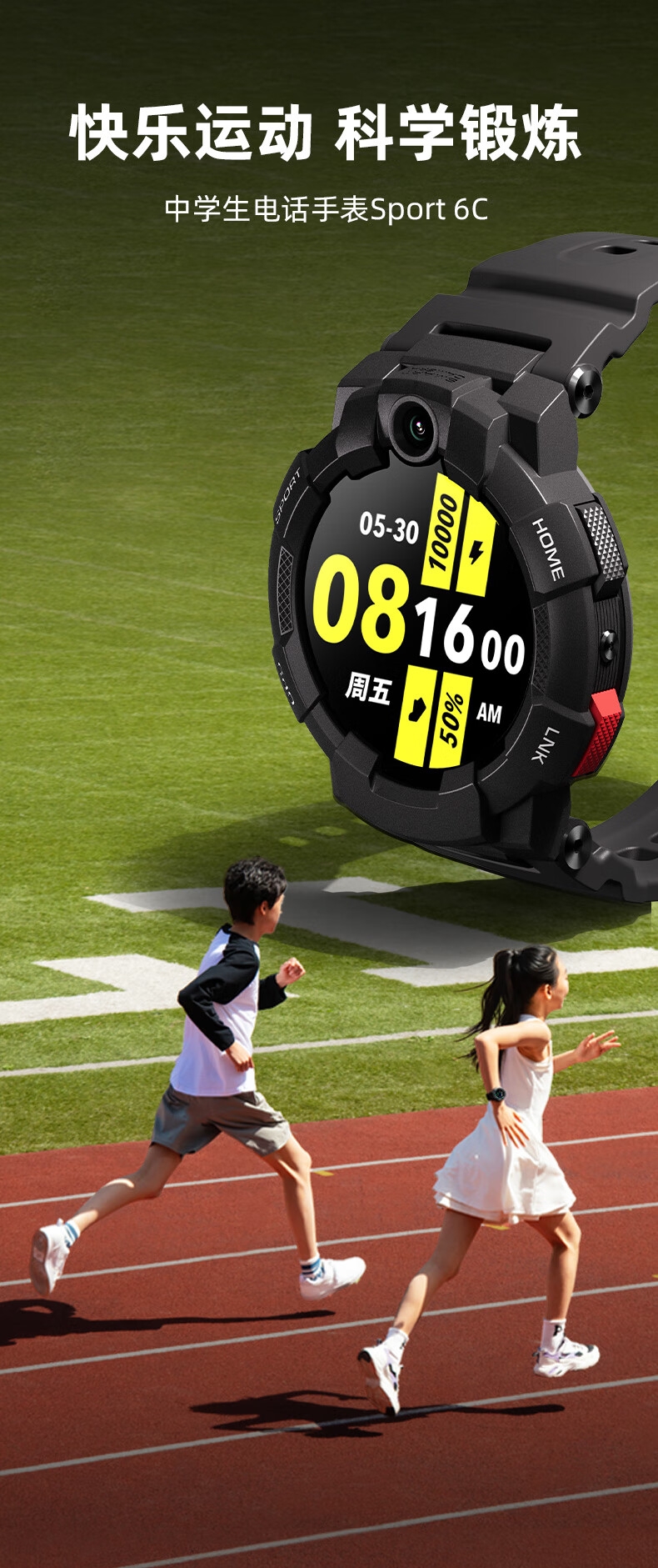 10重高精定位、心率监测、血氧检测、视/脑疲劳检测;自动更新行程动态、全天健康及运动监测;微信交友、打电话、手表交友、微聊