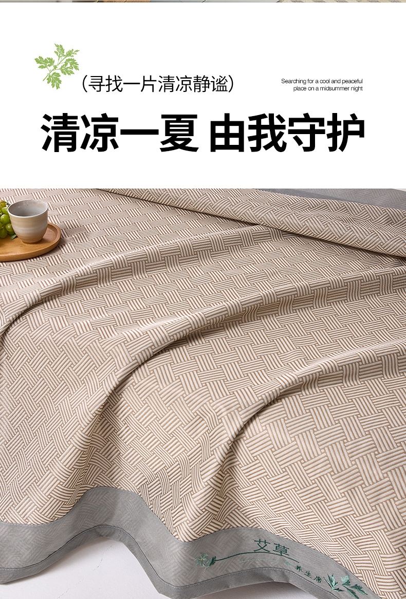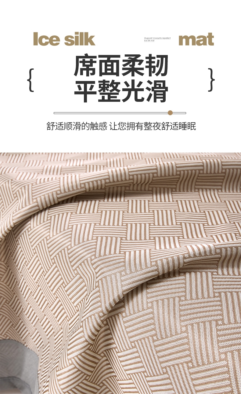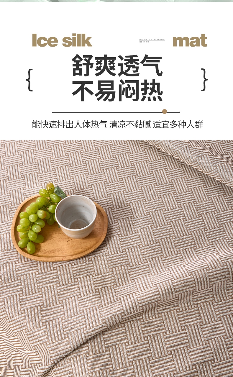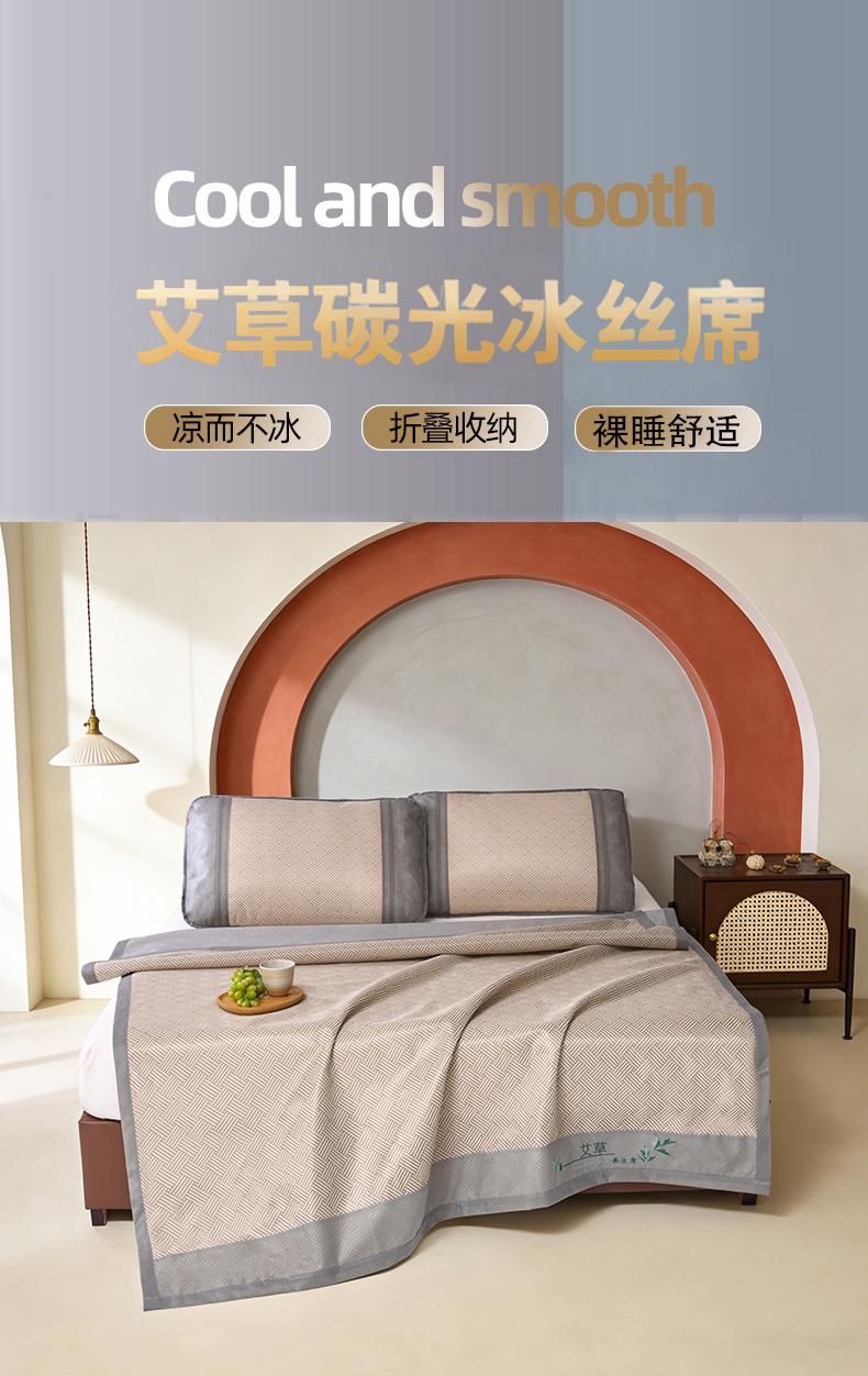 艾草凉感冰丝席,凉而不冰,久睡不粘。;凉感冰丝纤维织物本身经过抗菌处理;有效起到抗菌效果,适合裸睡。