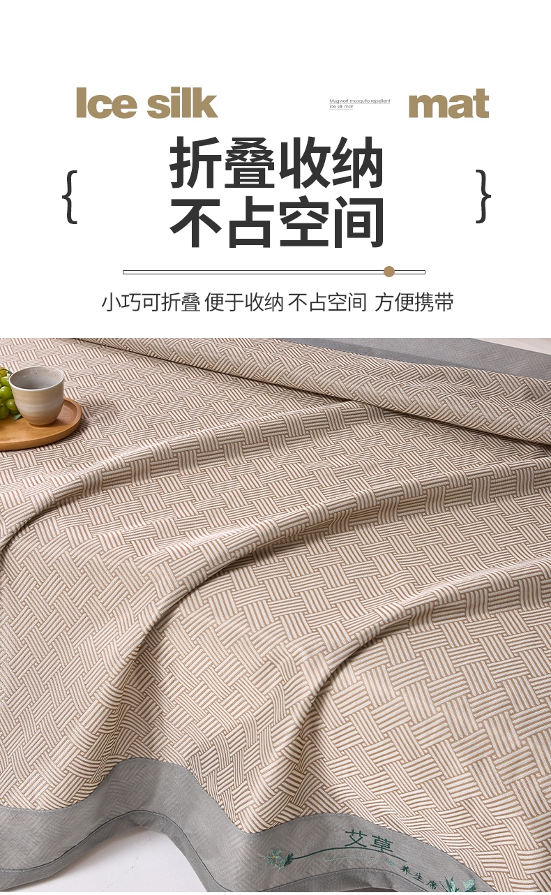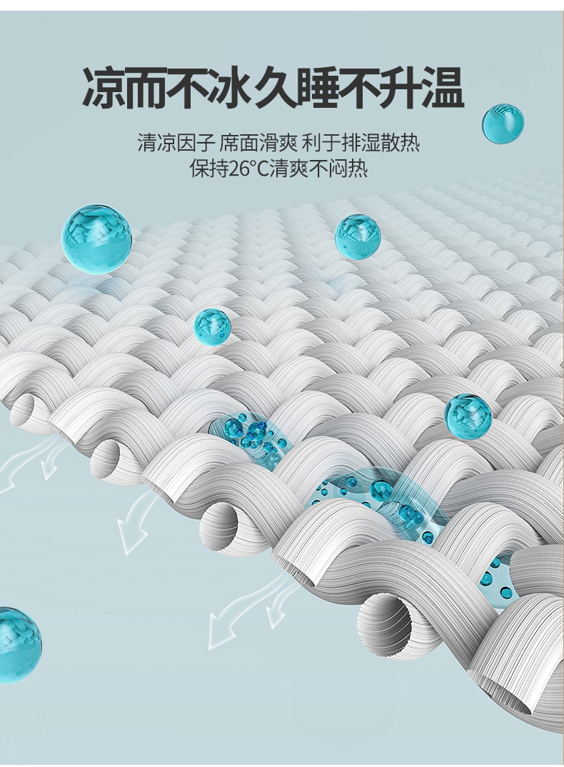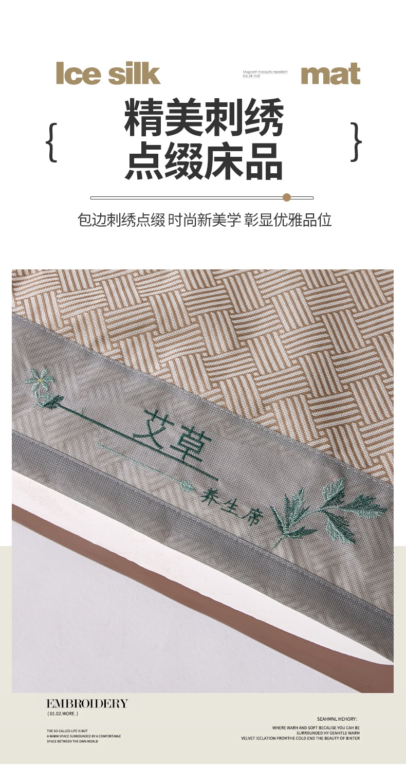 艾草凉感冰丝席,凉而不冰,久睡不粘。;凉感冰丝纤维织物本身经过抗菌处理;有效起到抗菌效果,适合裸睡。