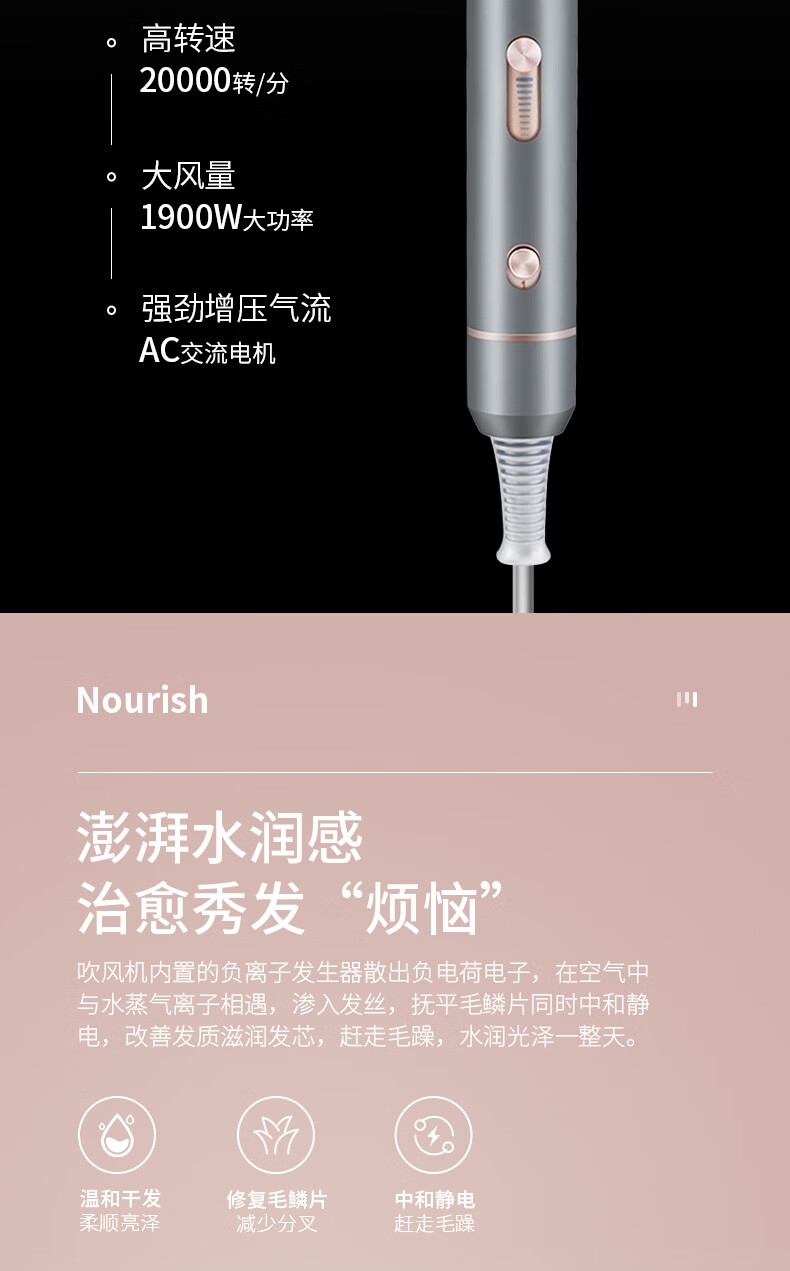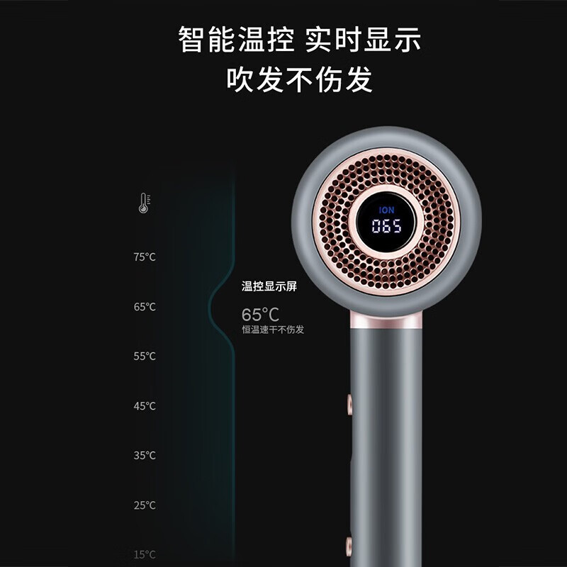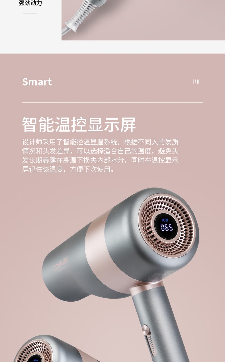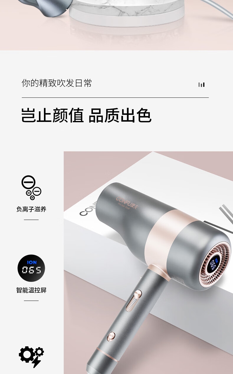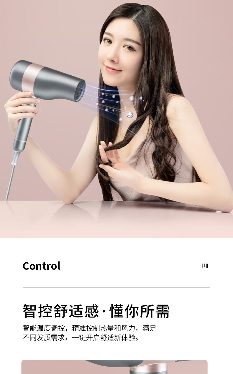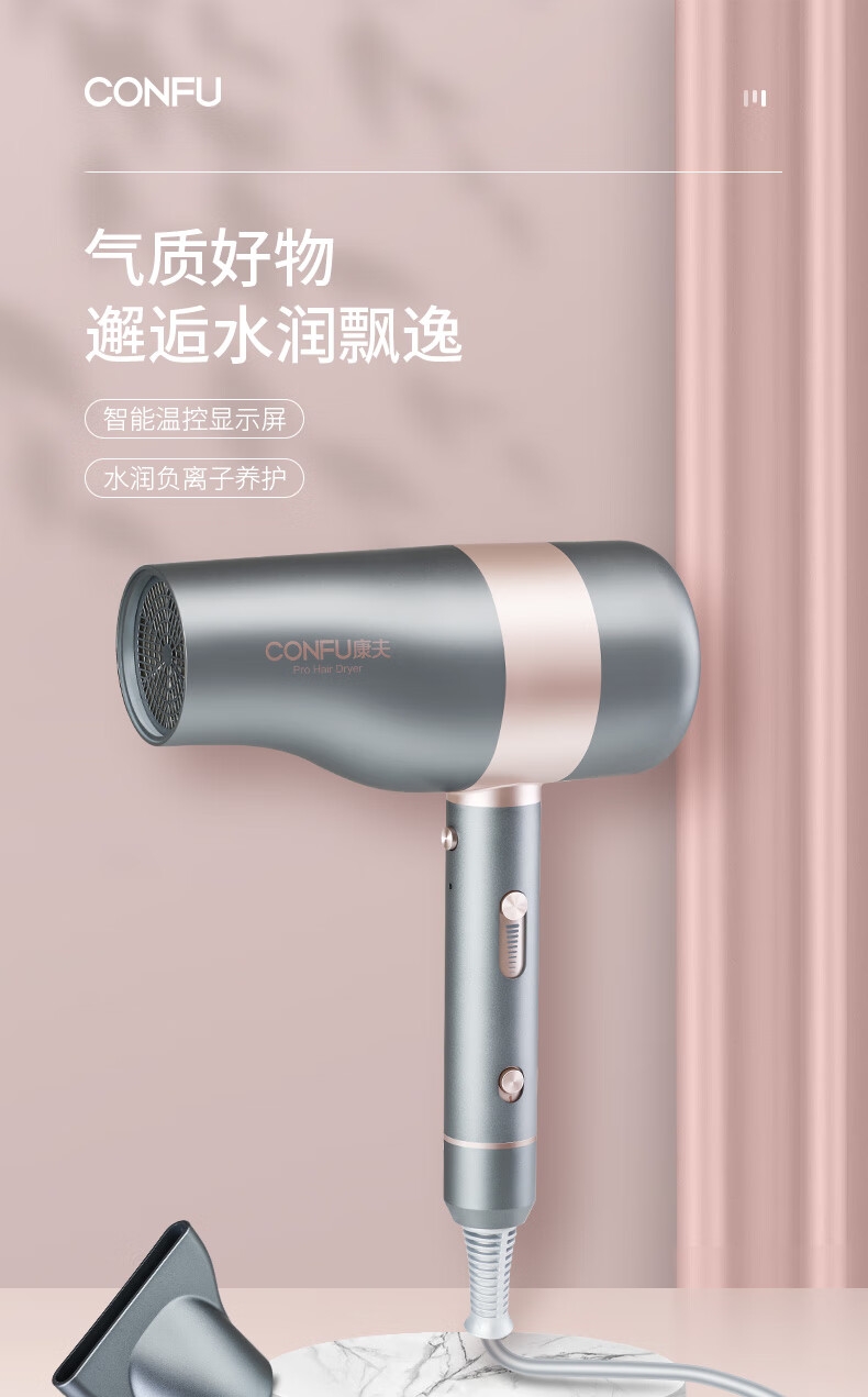 智能温控显示屏;水润负离子养护;高转速马达,风力翻倍