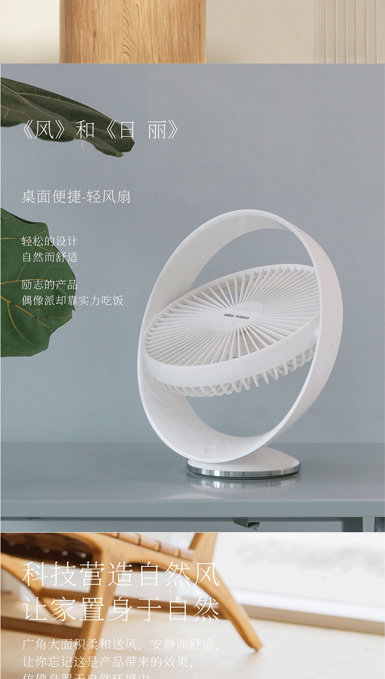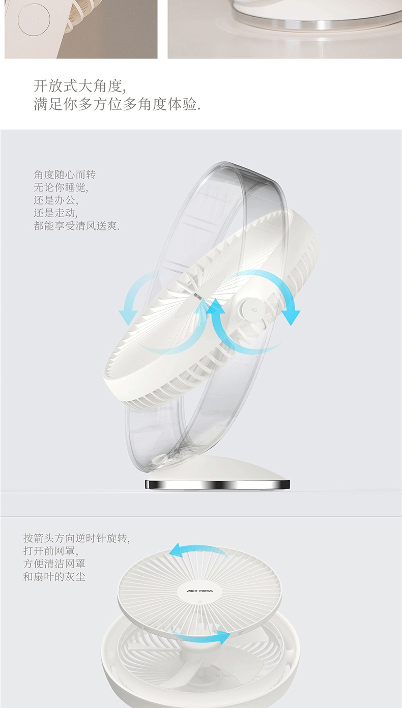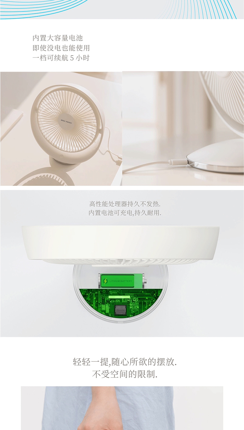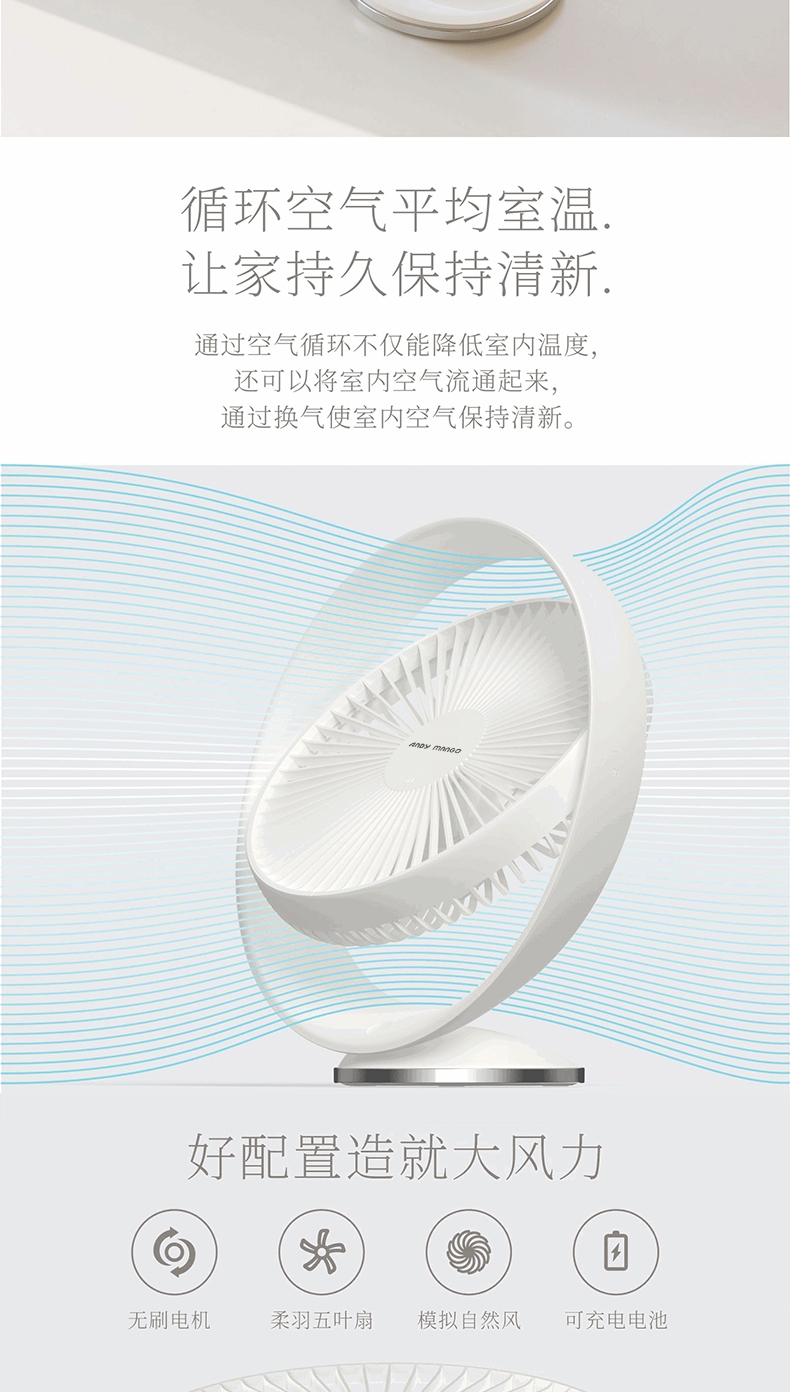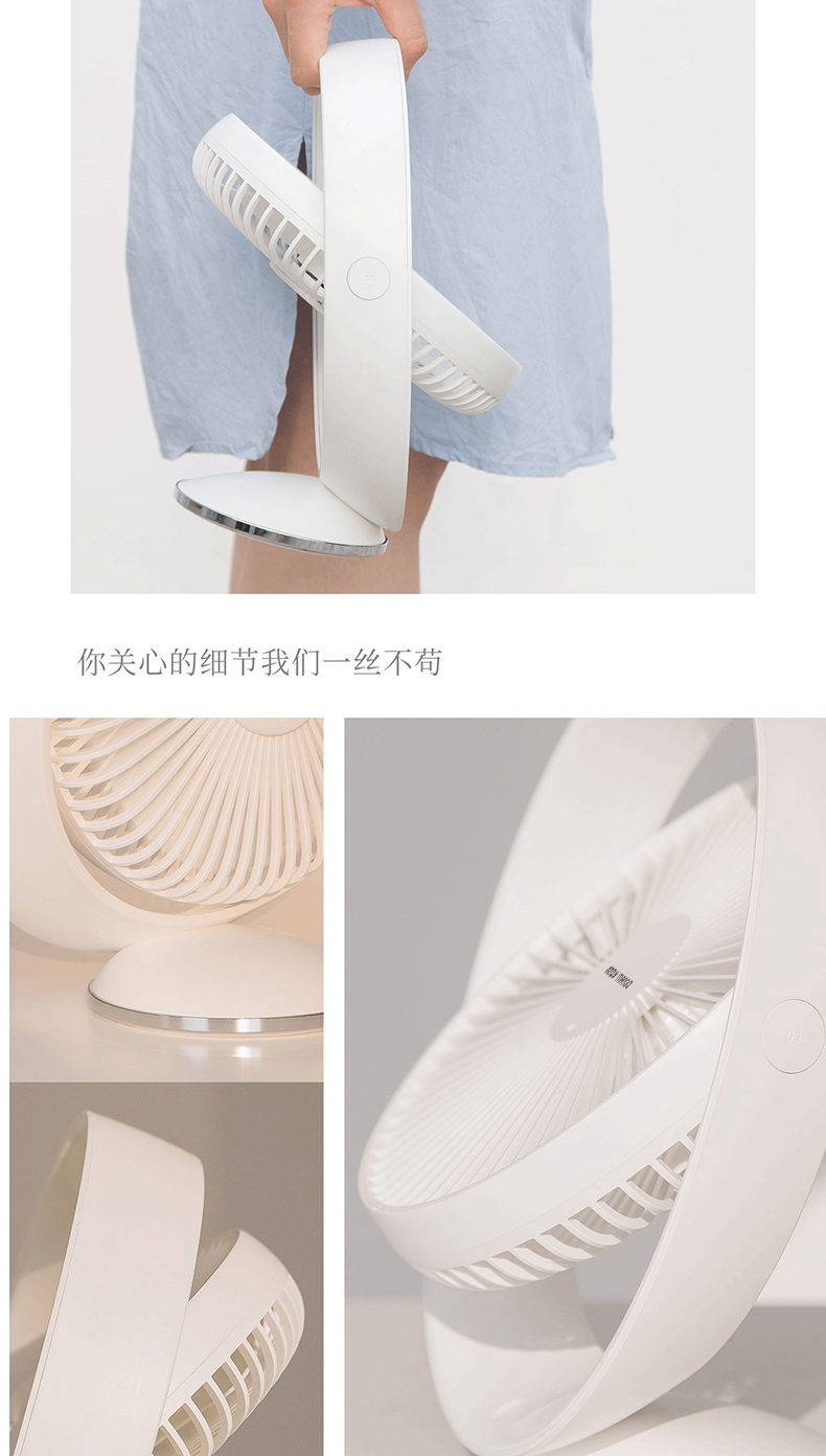 好配置造就大风力,无刷电机,模拟自然风;内置大容量电池,随时随地使用无忧虑;开放大角度,满足你多方位多角度体验;轻松的设计,自然而舒适