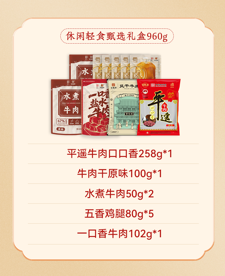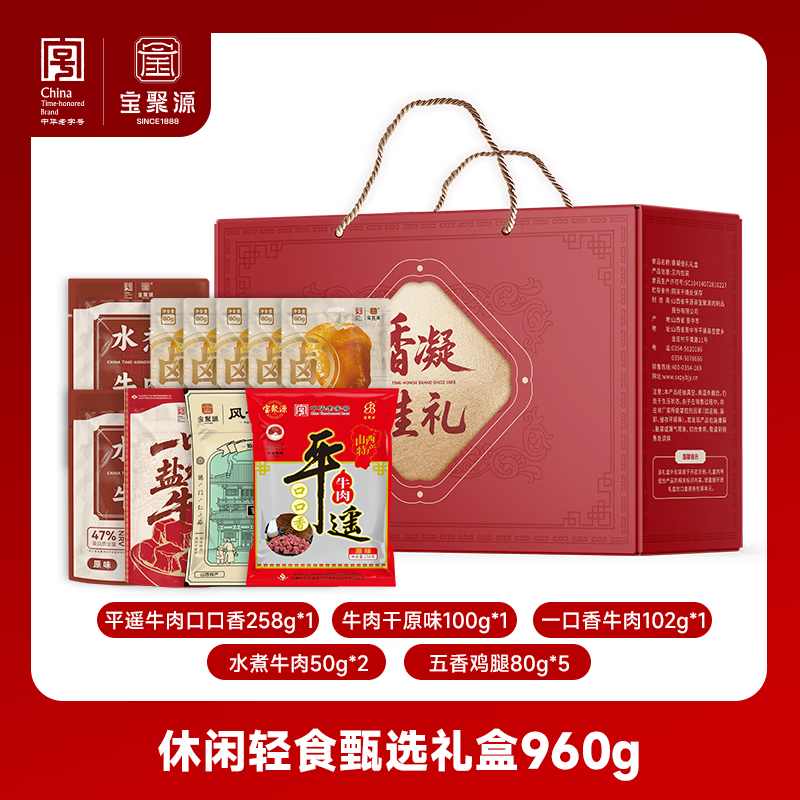 配置清单:宝聚源平遥牛肉口口香258g*1袋 宝聚源风干牛肉干原味100g*1袋 宝聚源盐水牛肉一口香102g*1袋 宝聚源水煮牛肉50g*1袋 宝聚源五香鸡腿80g*5个