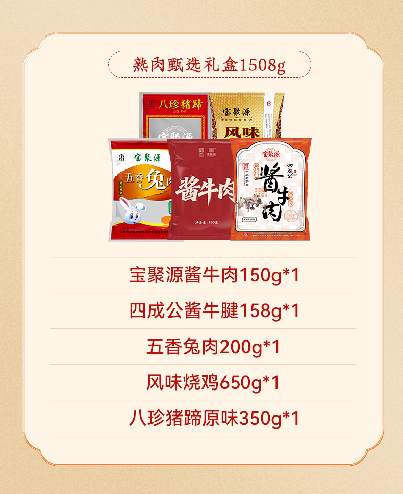 配置清单:宝聚源平遥酱牛肉(新)150g*1袋 宝聚源四成公平遥酱牛腱肉158g*1袋 宝聚源五香兔肉200g*1袋 宝聚源整鸡风味烧鸡650g*1袋 宝聚源八珍猪蹄原味350g*1袋