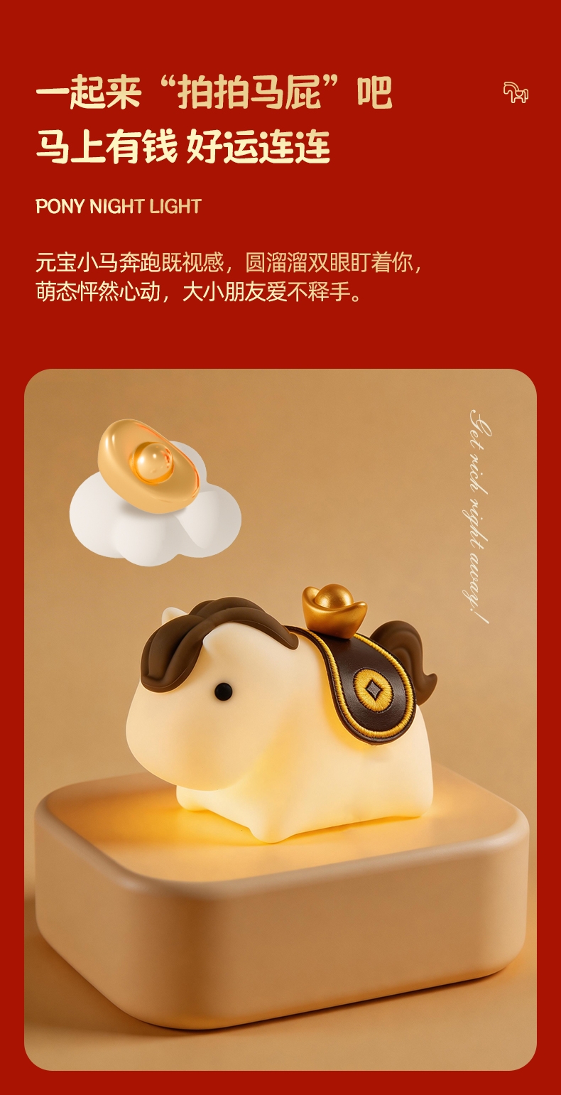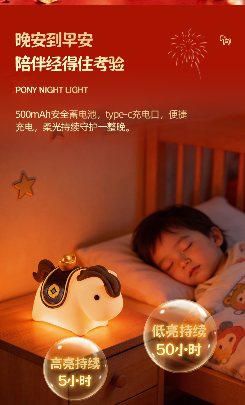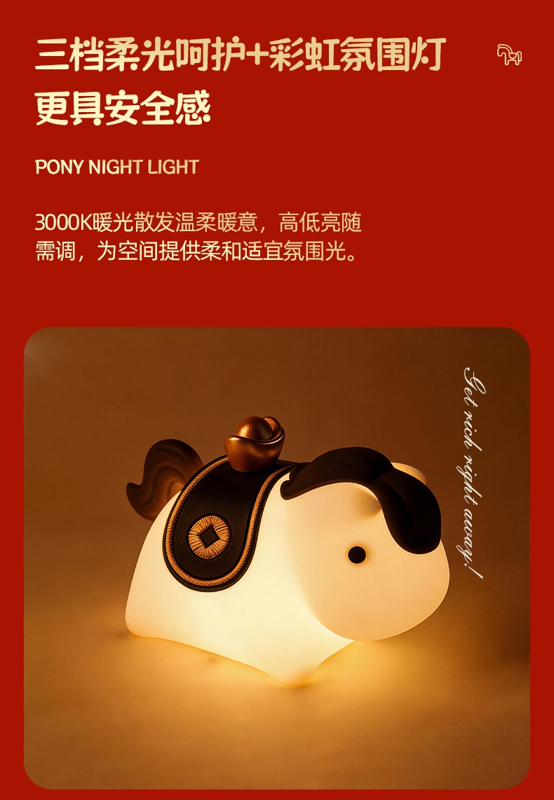 好寓意、柔光护眼助眠;软萌小马造型 + 暖光,缓解焦虑、治愈情绪;软萌开运 | 柔光护眼 | 一拍即亮 | 送礼佳选