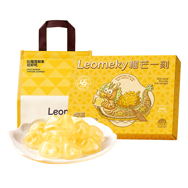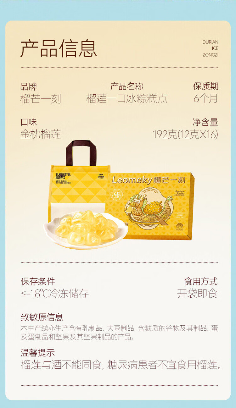 配置:榴莲一口冰粽12g*16枚*1盒(配礼袋)