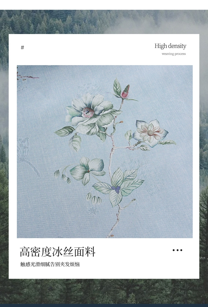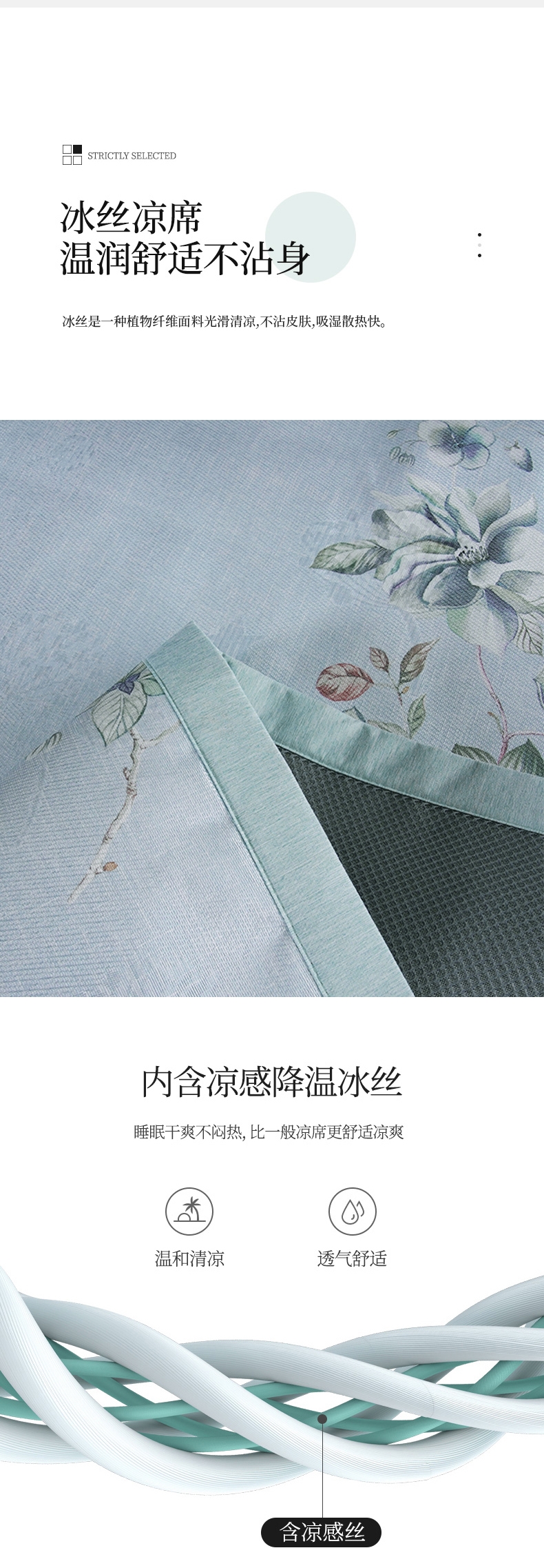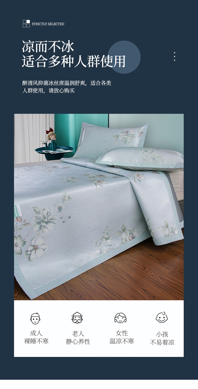 冰丝纤维自带降温功能,躺上体感温度直降3-5°C;燥热的夏天,也抵不过它的丝滑舒爽,;睡眠无拘束,触肤凉而不冰并且有良好的散热性能。